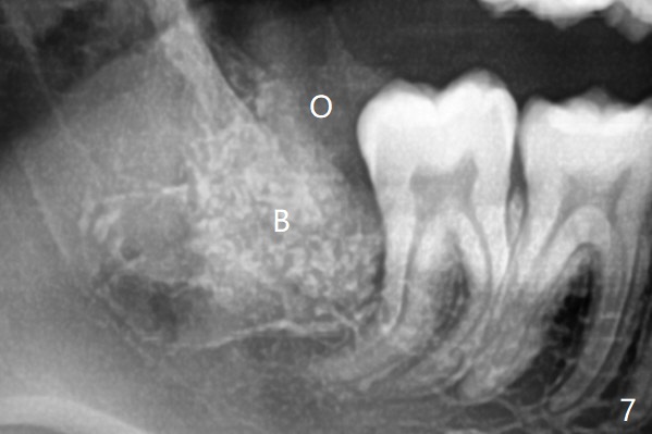 Since #32 sockets seem large, extending mesiobuccal (Fig.6), Bond Apatite (1 cc) is placed instead (Fig.7 B), covered by 1/3 of Osteogen plug (O) and sutured with 4-0 PGA. Extraction of #17 is also difficult. As 2 sockets are indistinct, a piece of Osteogen plug with split is placed (Fig.8) upside down (Fig.9 vs. Fig.5). There appears bone formation in the socket 5 months postop (Fig.10,11).
