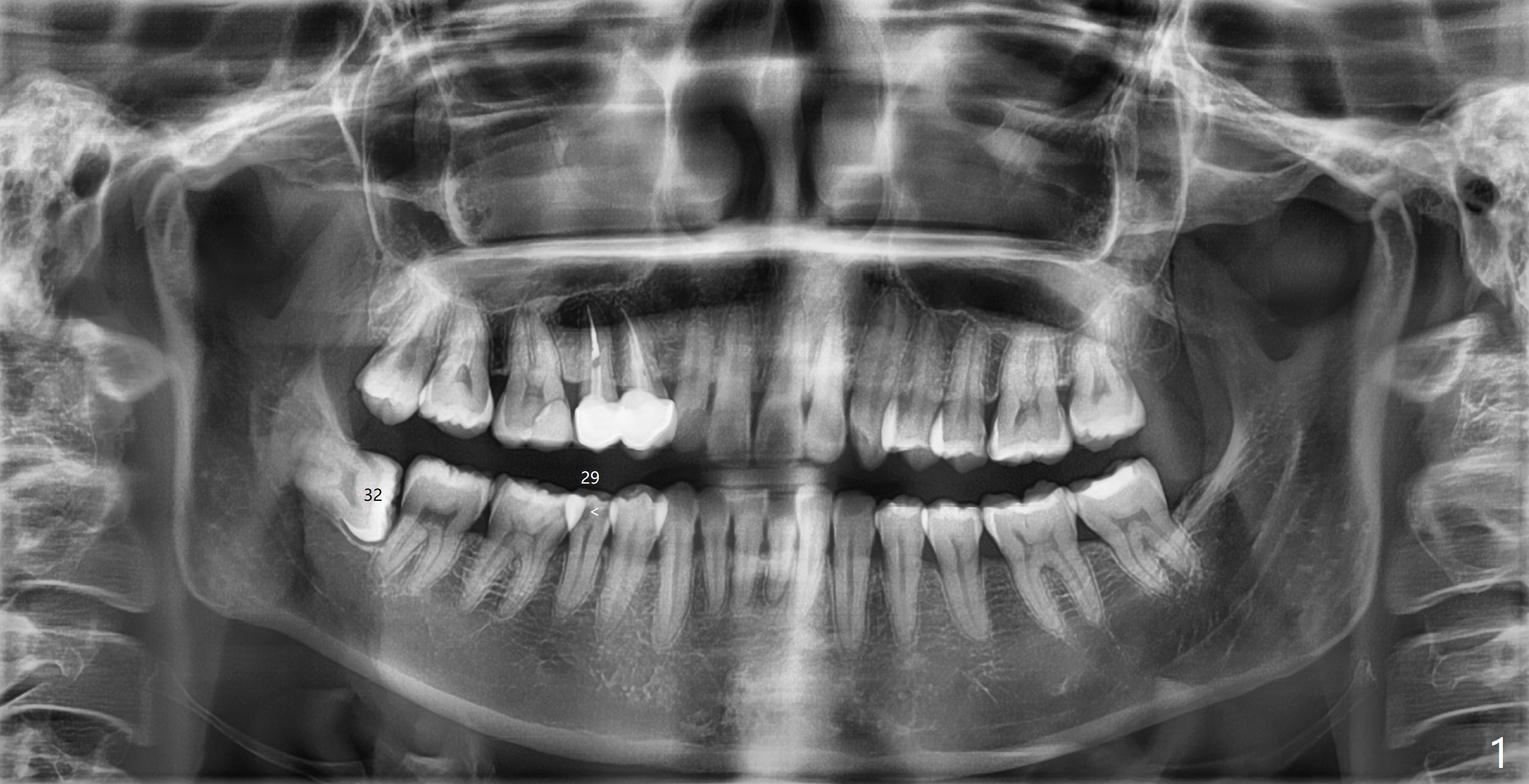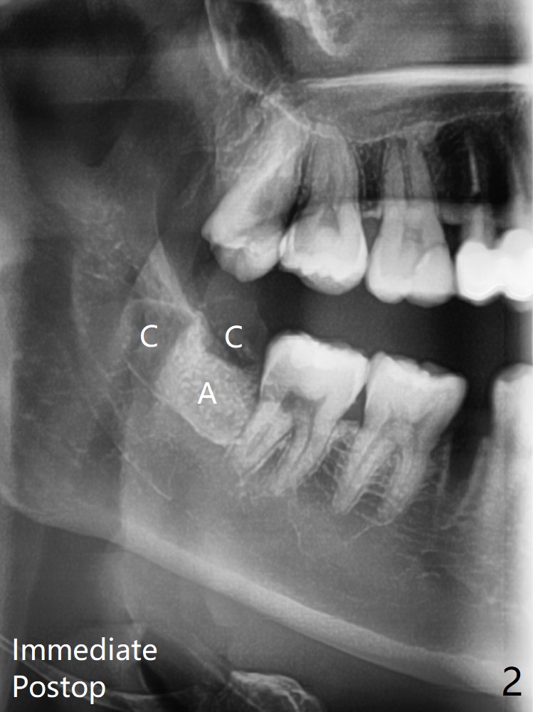 A 36-year-old nervous woman with left TMJ click agrees to have #29 with caries (<) and 32 extracted in preparation for orthodontic treatment (crowding, Fig.1). With 1/2 of Collagen plug placed in the apical portion of the socket, Bond Apatite (1 cc, A) is placed, followed by the other 1/2 of Collagen Plug coronally (Fig.2). Sutures are removed 22 days postop; the wound heals.