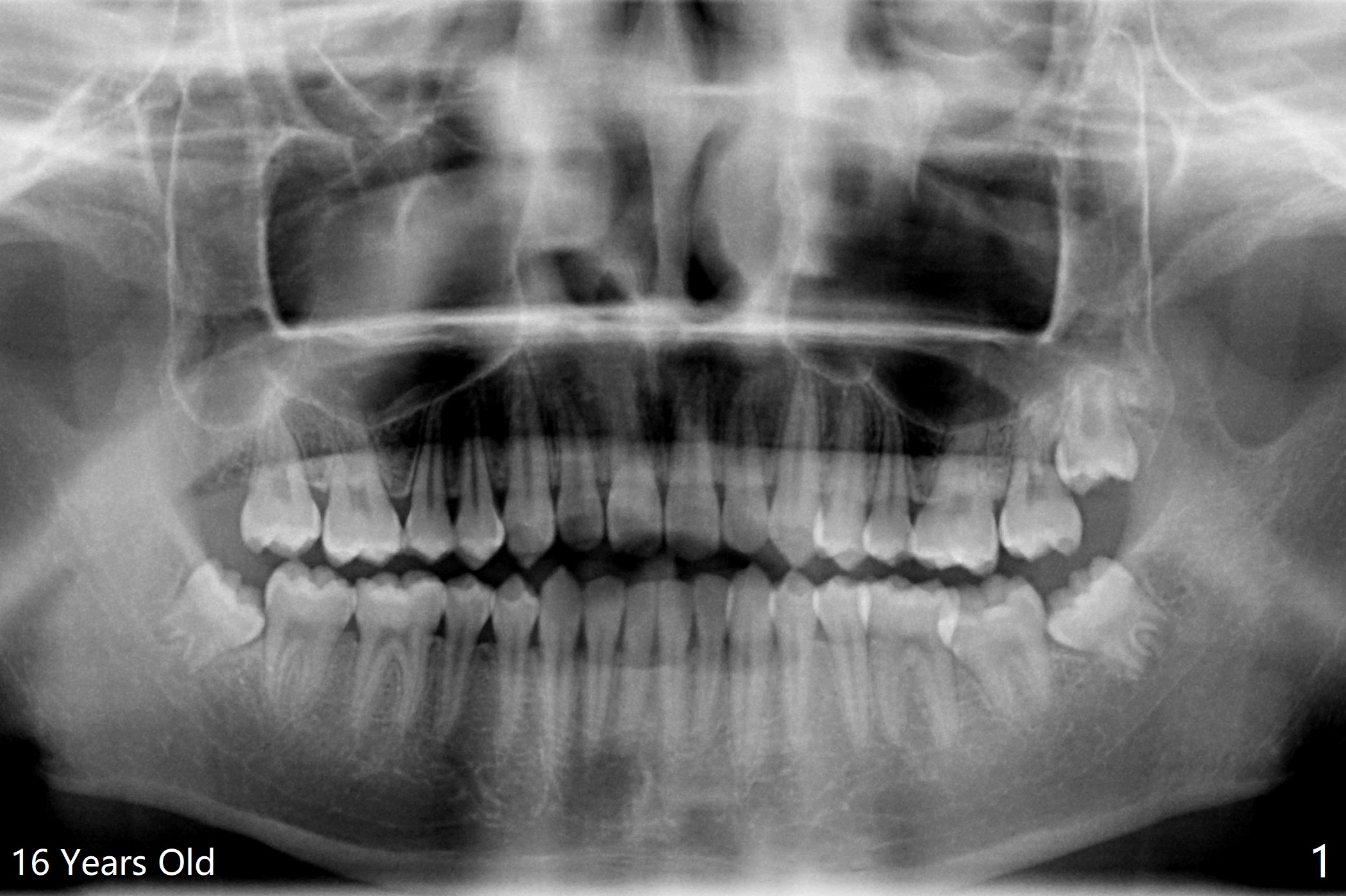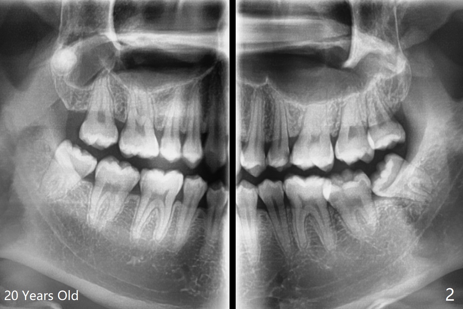 A 20-year-old man has been our patient irregularly since the age of 13. His mother reported that he did not brush well, probably related to gag reflex. Panoramus is taken at the ages of 16 and 20 (Fig.1,2). In fact a primitive cyst forms (Fig.1) before calcification of the impacted upper right 3rd molar (dentigerous cyst, Fig.2). After extraction and enucleation of the cyst, Augma will be injected into the cavitation, followed by Osteogen plug.