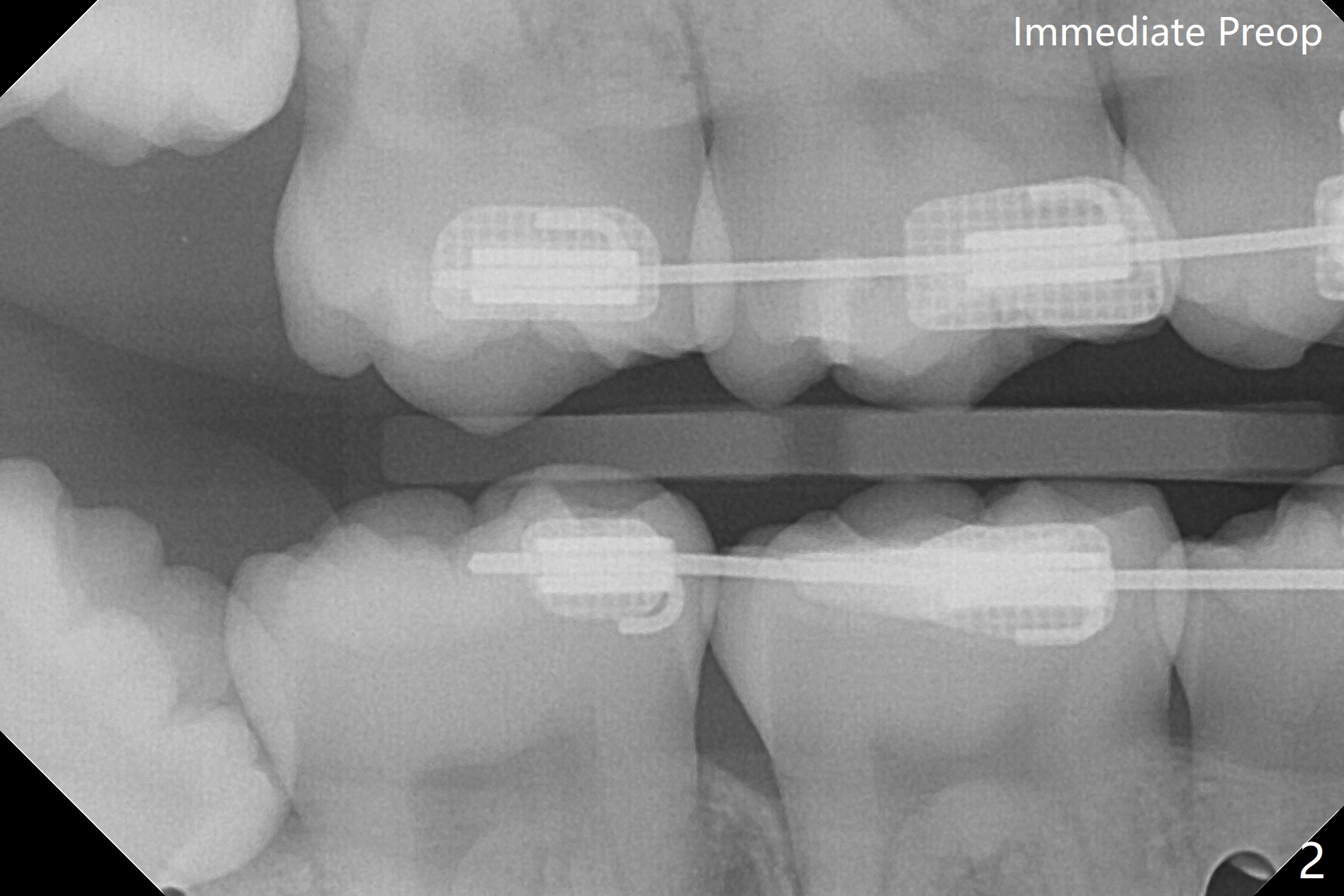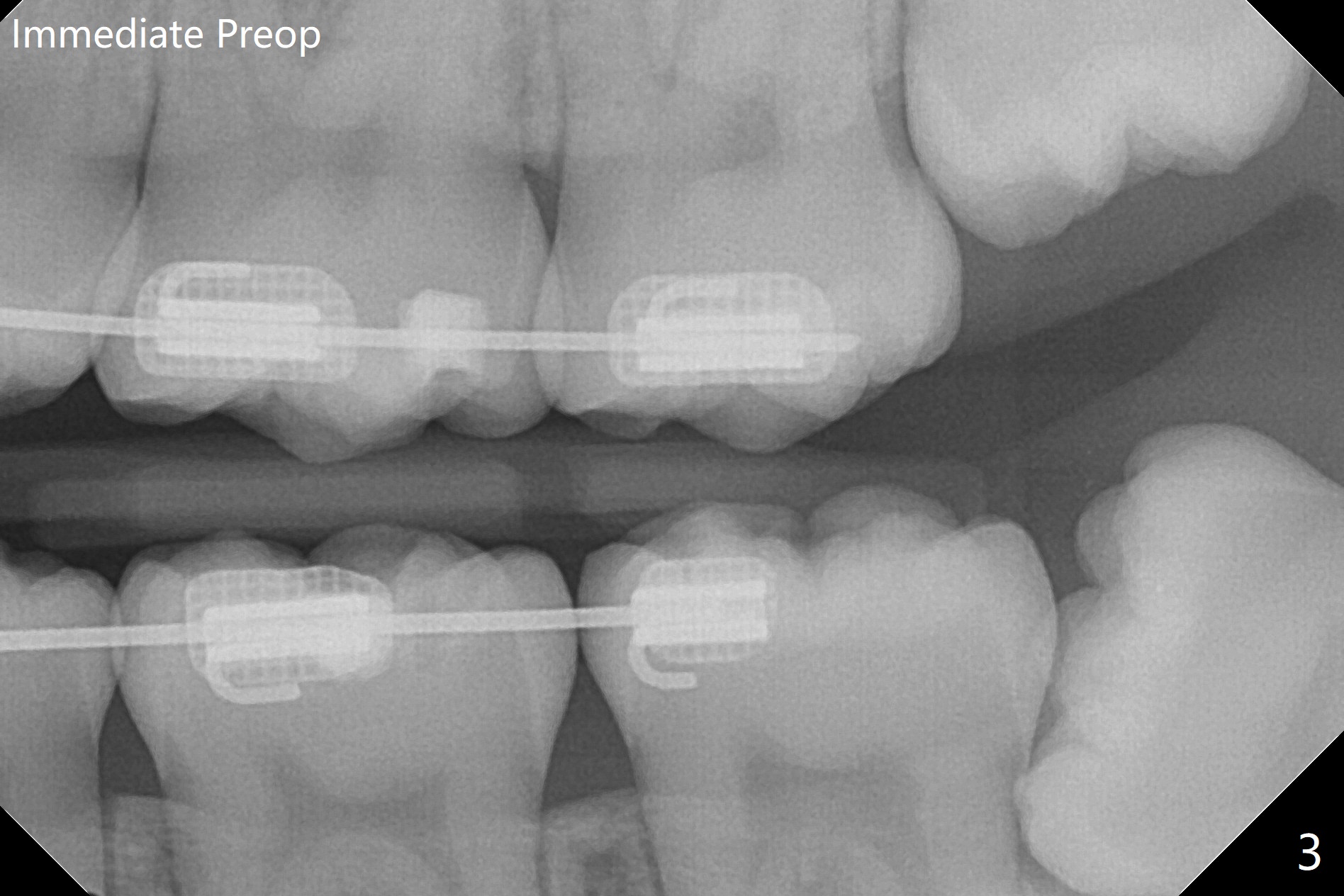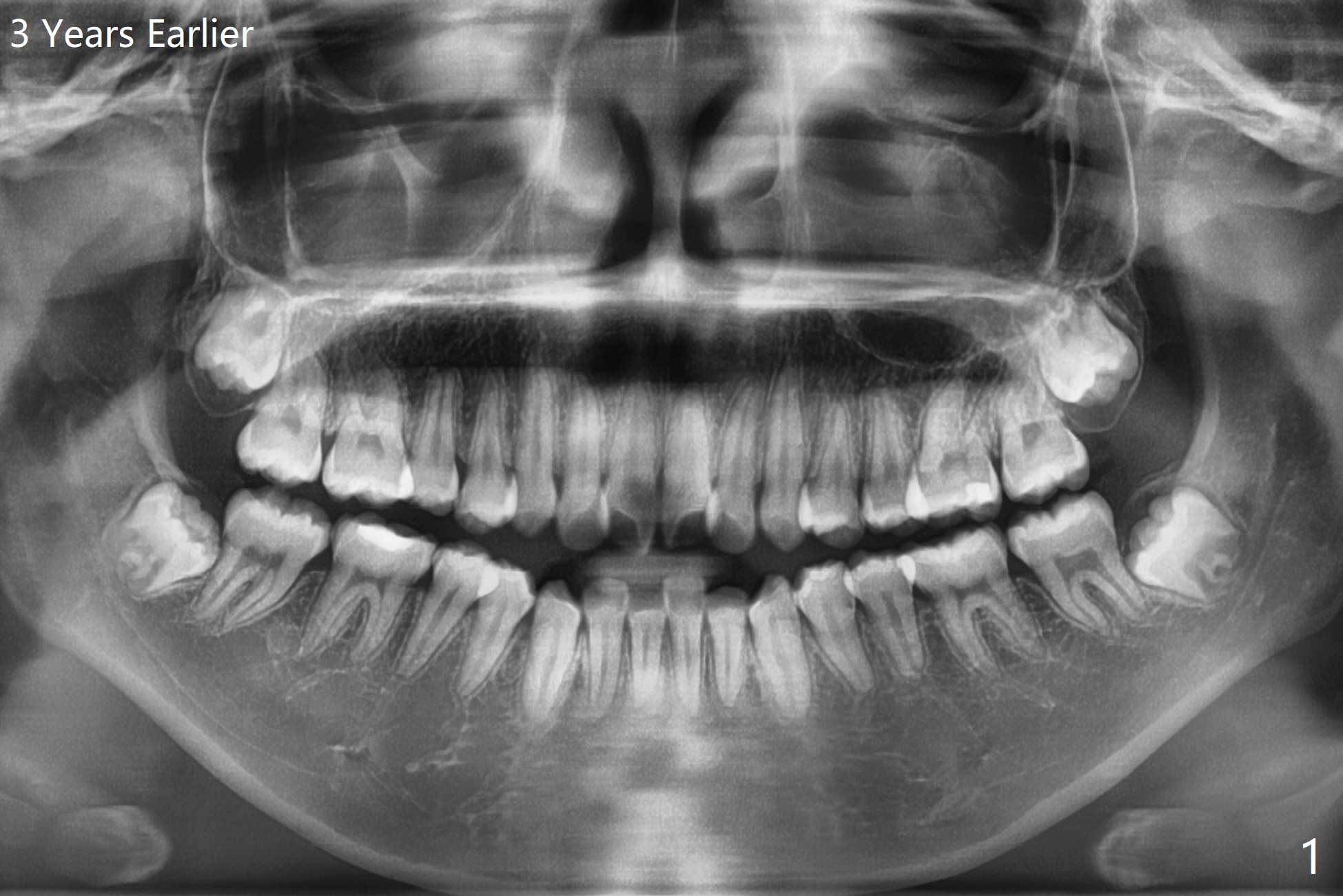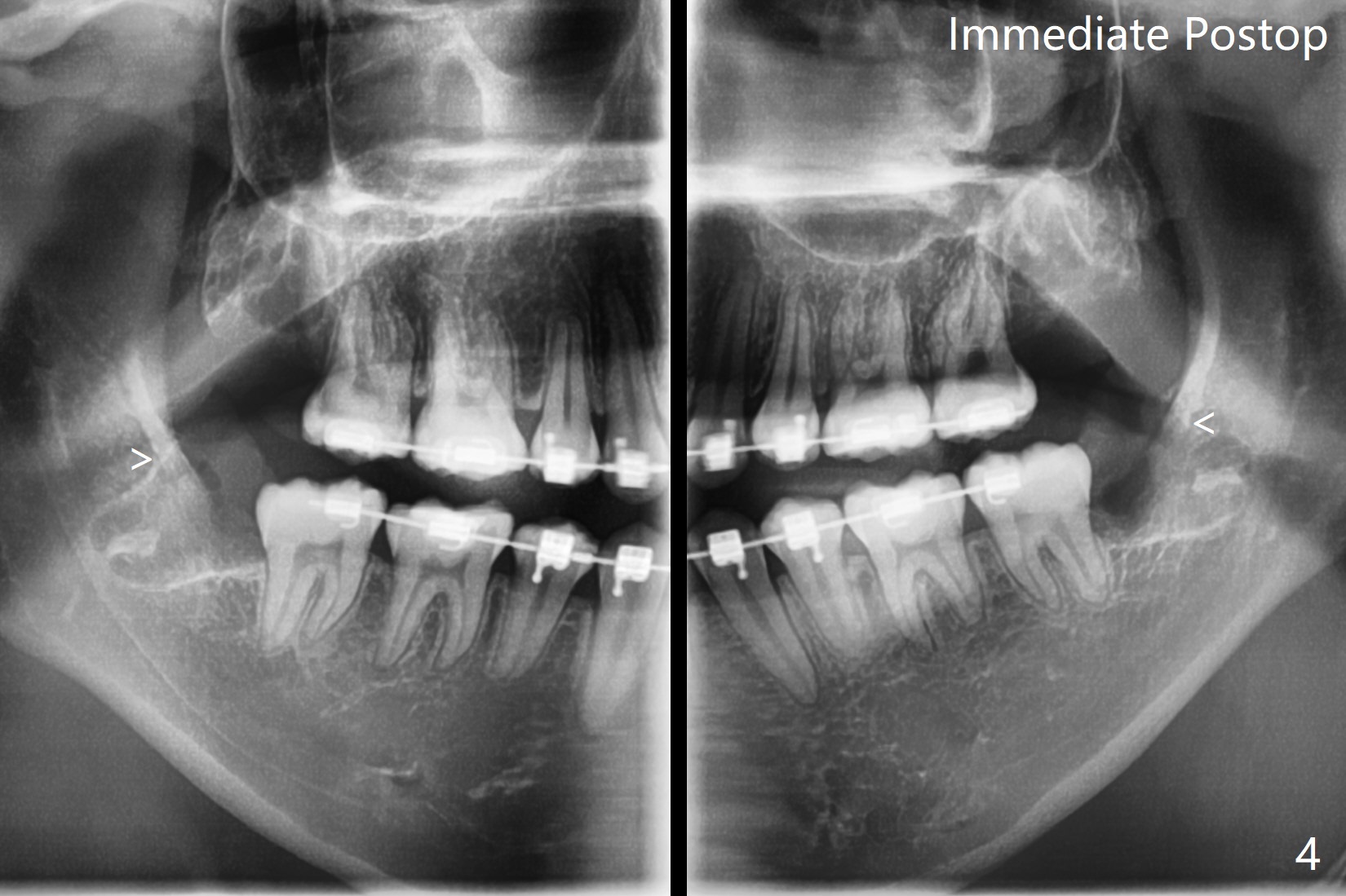 17岁女孩3年前拍摄全景片后拔除4个第一双尖牙(图一),在别的诊所进行矫正(图二,三),在局麻下拔除4个智齿,由于去骨,显得外斜嵴缺失(图四:箭头),放置胶原塞(防止干槽症),4-0含铬羊肠线缝合,预计外斜嵴6-12月能修复。
