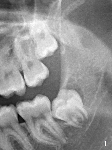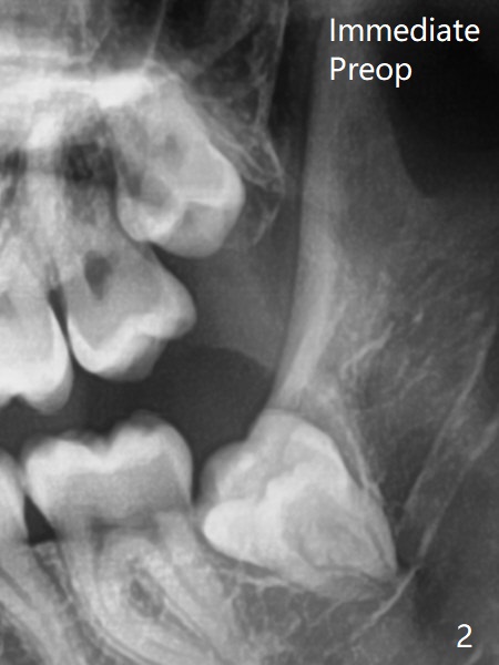 Two years 10 months between Fig.1 and 2. The chief complaint is mastication pain of the upper 3rd molars, as related to the thin gingiva upon incision. Overlapping and crowding are much more severe as seen intraop than X-ray indicates.