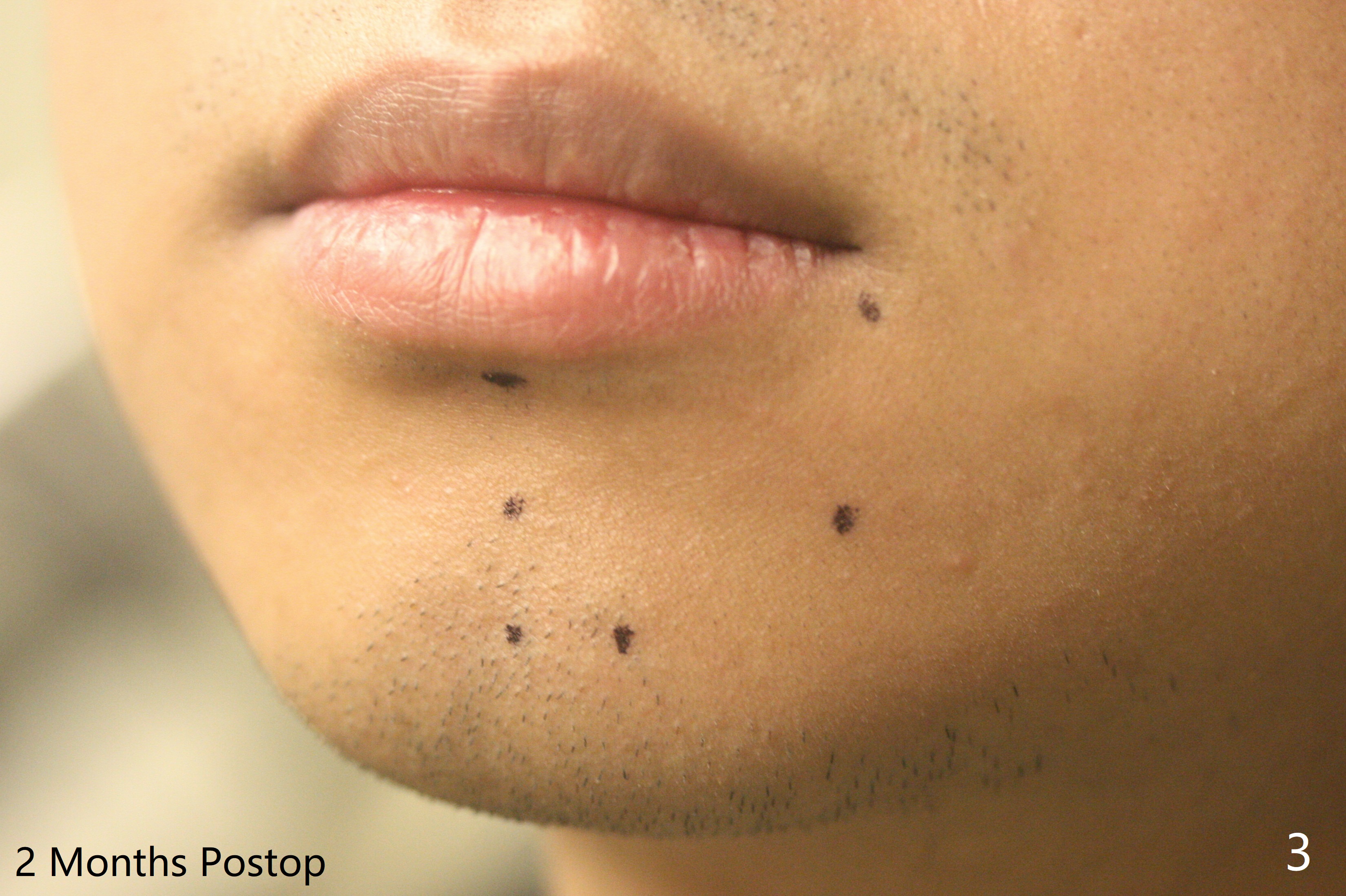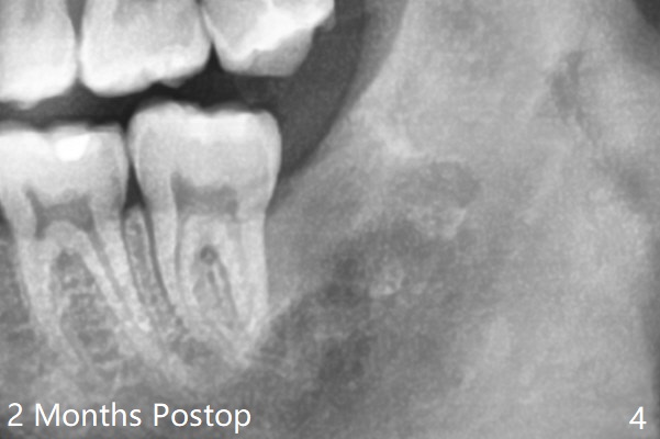 A 21-year-old man returns to clinic with pain and swelling at #17 (Fig.1,2). After multiple sectioning, the tooth is extracted with insertion of collagen plug post extraction in the late afternoon. The patient complains of sharp pain during local anesthetic injection. Postop paresthesia is gradually getting better, but gets worse 2 months postop (Fig.3,4). Neurotin is prescribed. Vitamin B1 and B12 are recommended. OMFS is suggested. 21岁男因左下智齿肿痛要求拔除(图一,二),术中发现轻度颊侧阻生,使用一只利多卡因,一只Septocaine,一般前者block anesthesia,后者infiltration。多次用手机切割牙齿,拔除后牙槽窝放置一个胶原塞(减少术后干槽症),4-0铬羊肠线缝合。术后两个月病人突然回来,主诉局麻注射造成剧痛,术后下嘴唇麻木开始逐渐好转,最近麻木突然加重(图三,四)。左下智齿牙槽窝已经愈合。处方:Neurotin;推荐维生素B1, B12;建议口外会诊。还能做什么?