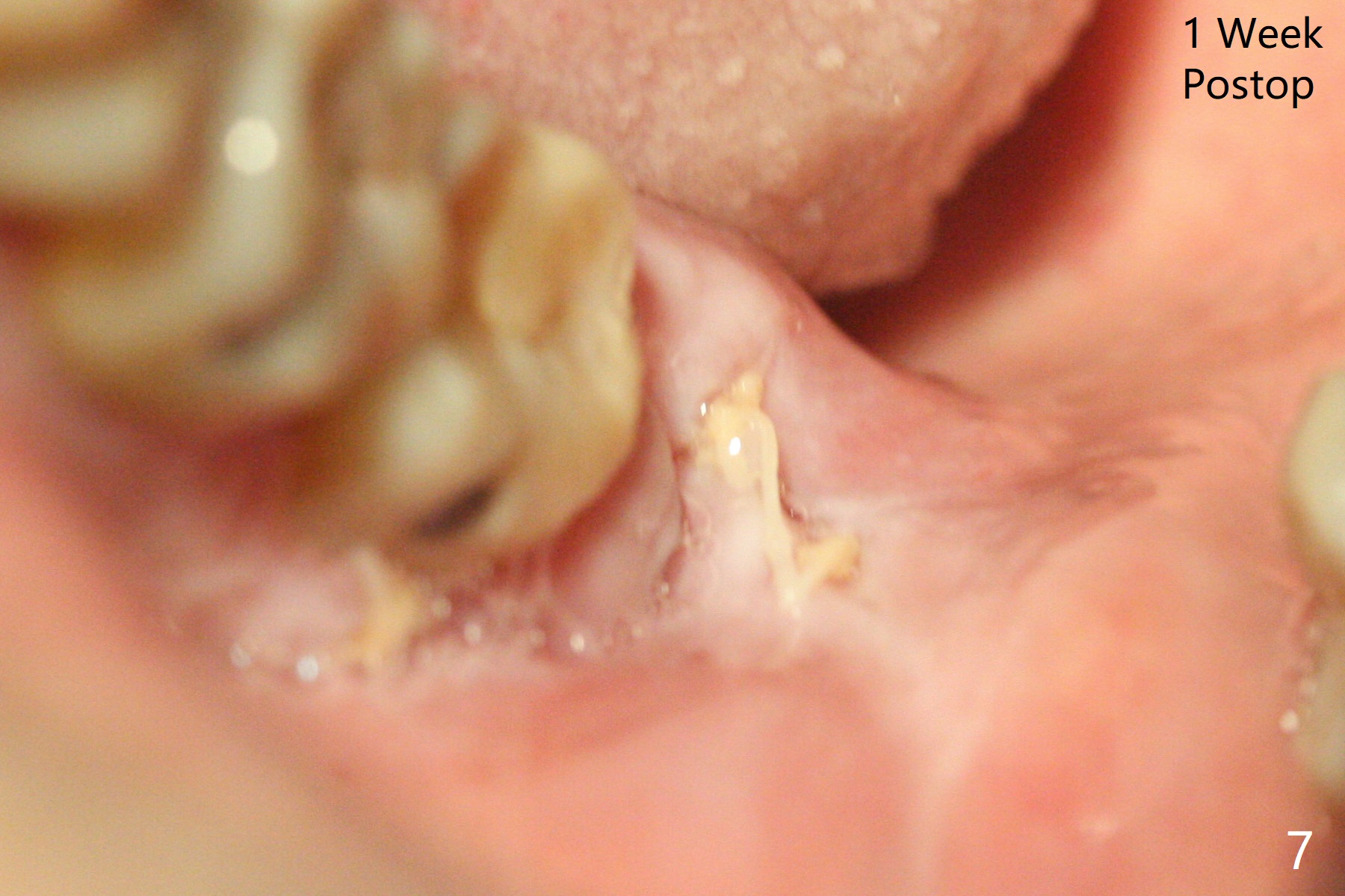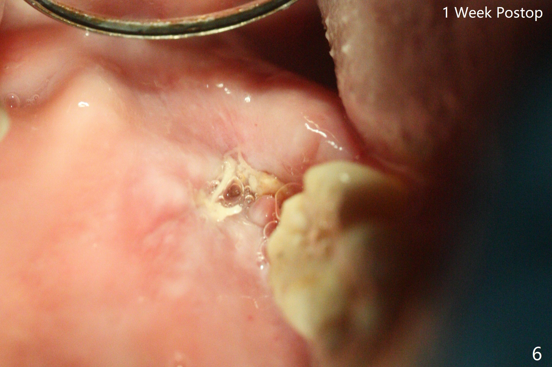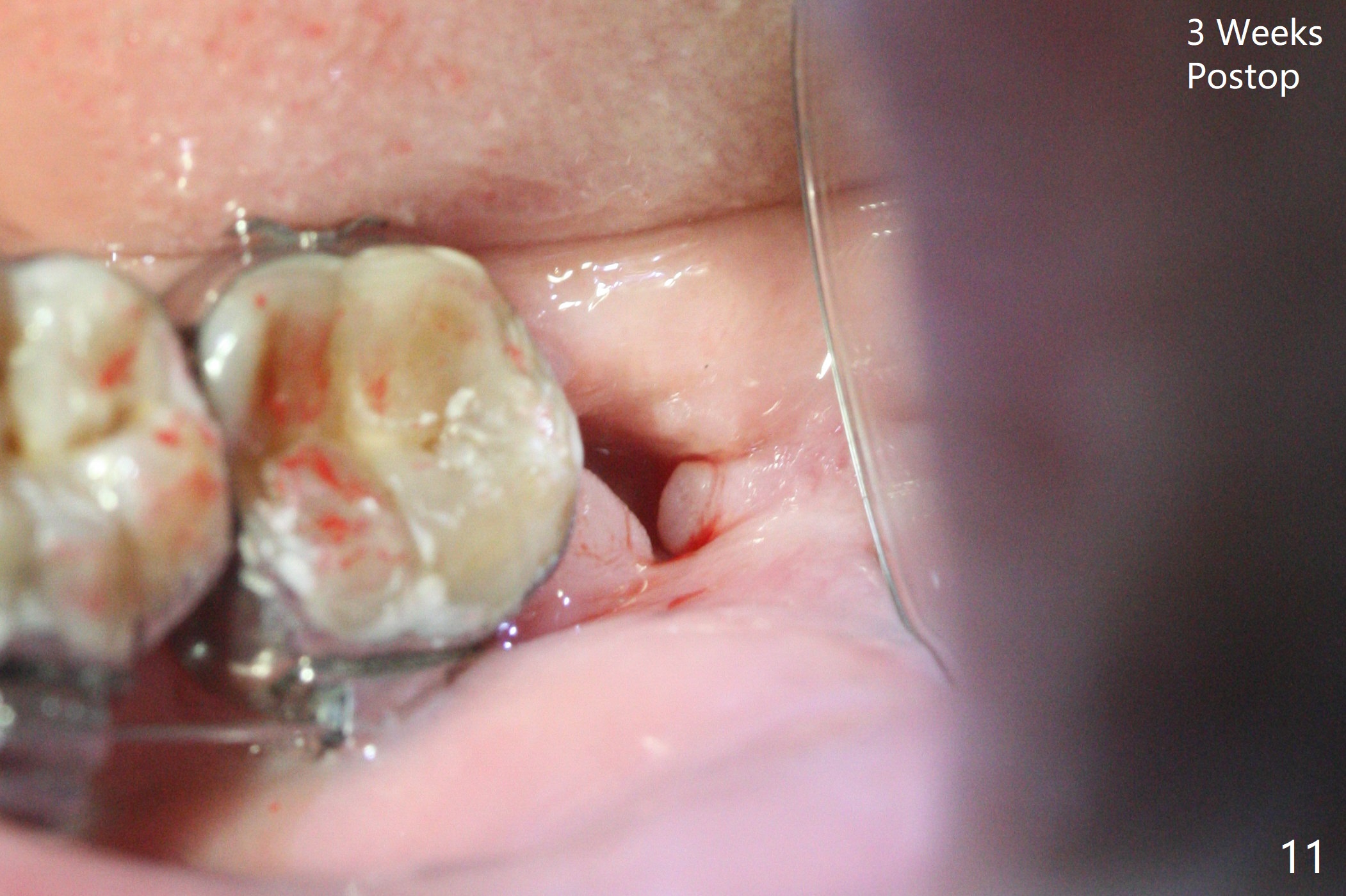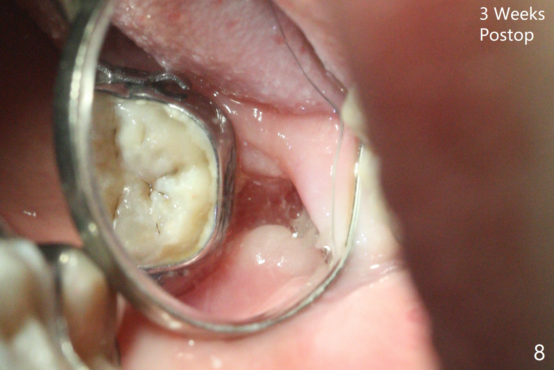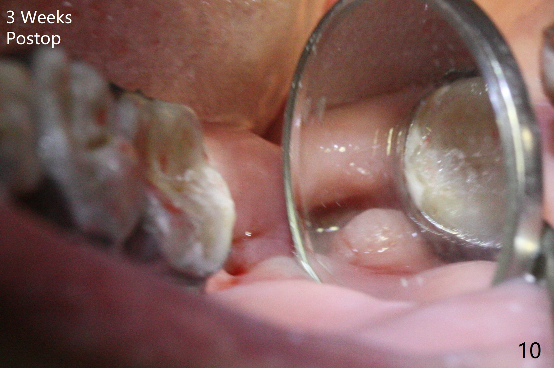 A 40-year-old man requests extraction of the teeth #17 and 32 (Fig.1). This case is designed to test that socket ossifies coronal when Collagen Plug is placed coronal. Release incision will be made both sides. Collagen plug will be placed at #32; none at #17. 4-0 PGA will be used to close the sockets. Photos will be taken immediate, 1 week, 1 month, and 3 months postop. PAs (sensor 1) will be taken immediate and 3 months postop. There is no wound dehiscence 1 week postop (Fig.6,7). The sockets reopen asymptomatic 3 weeks postop (Fig.8-11).