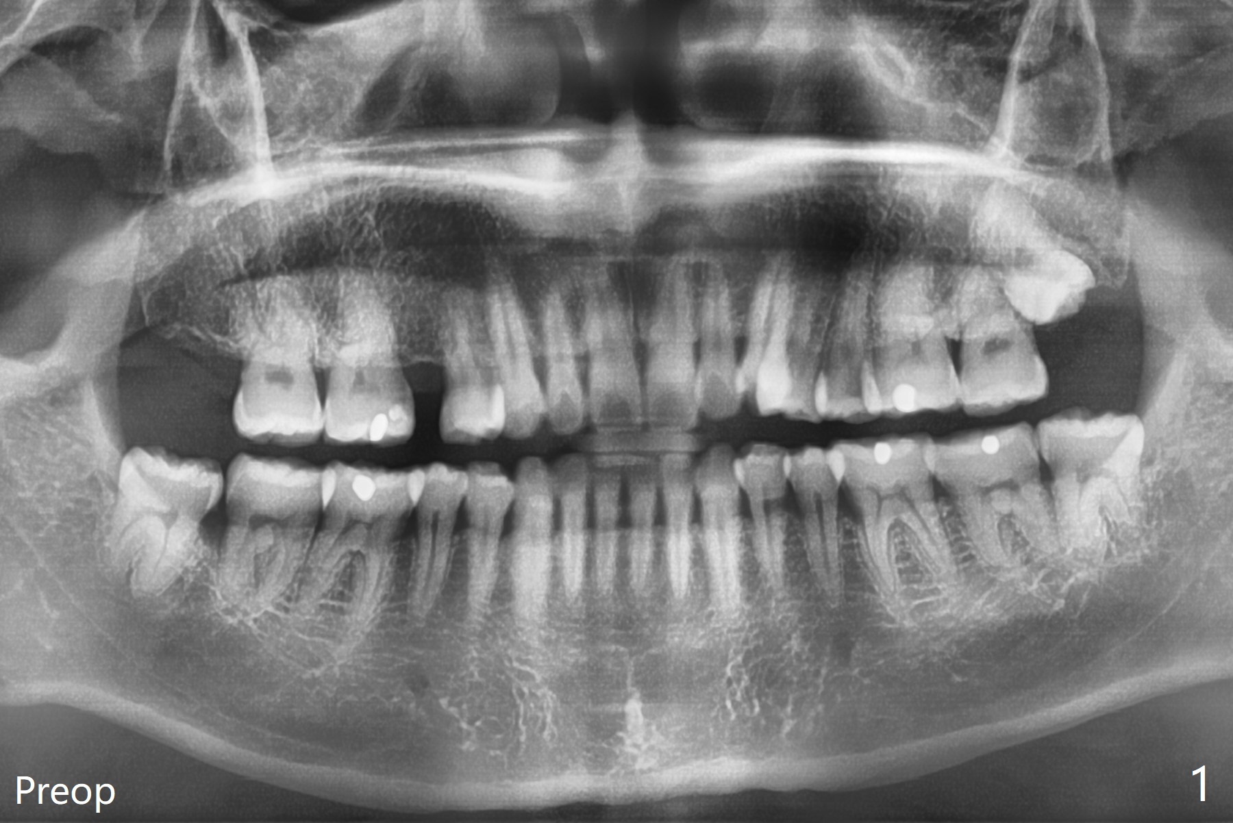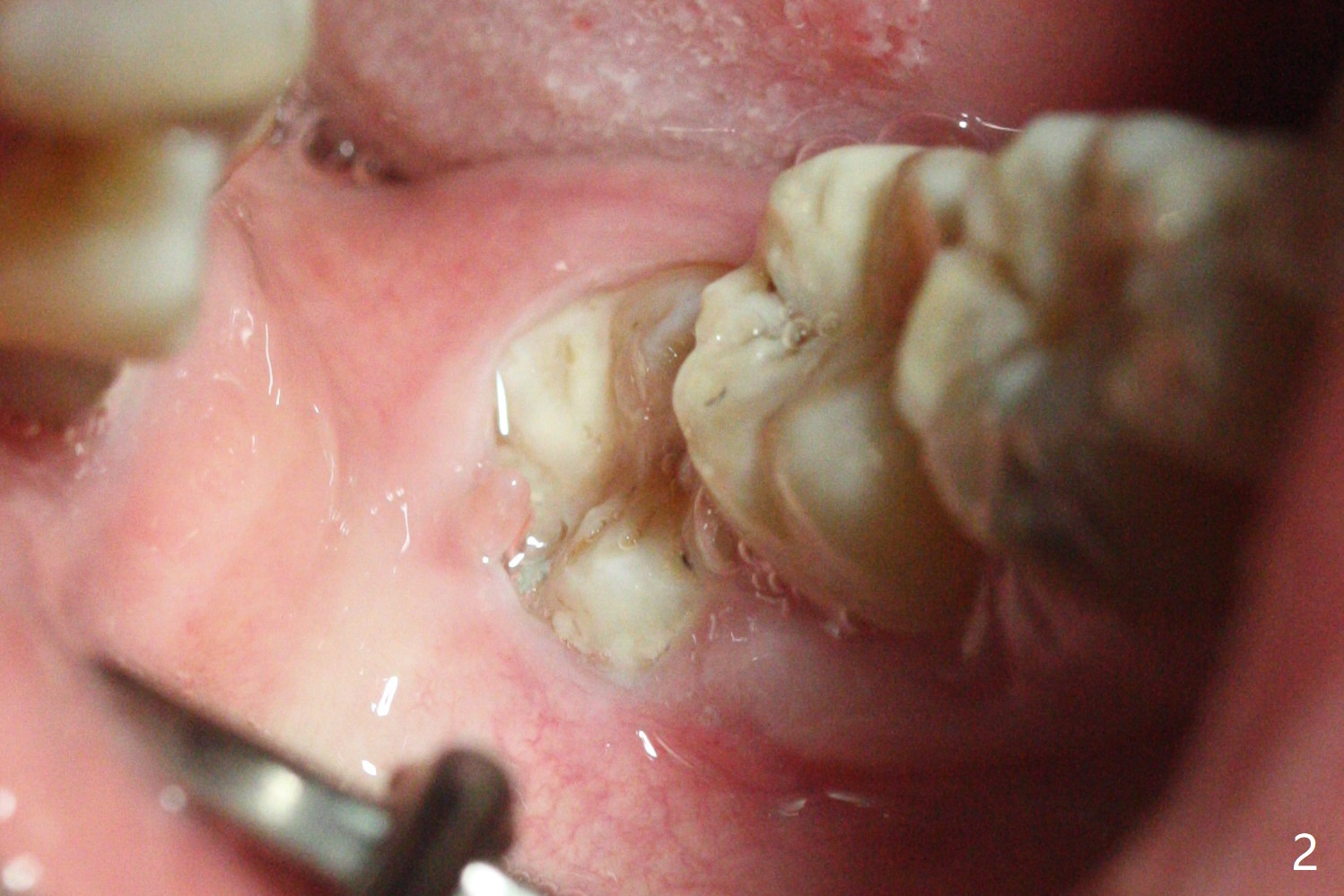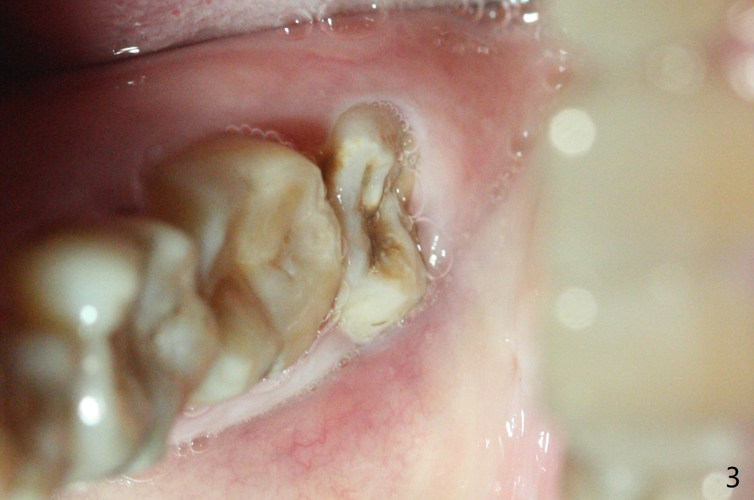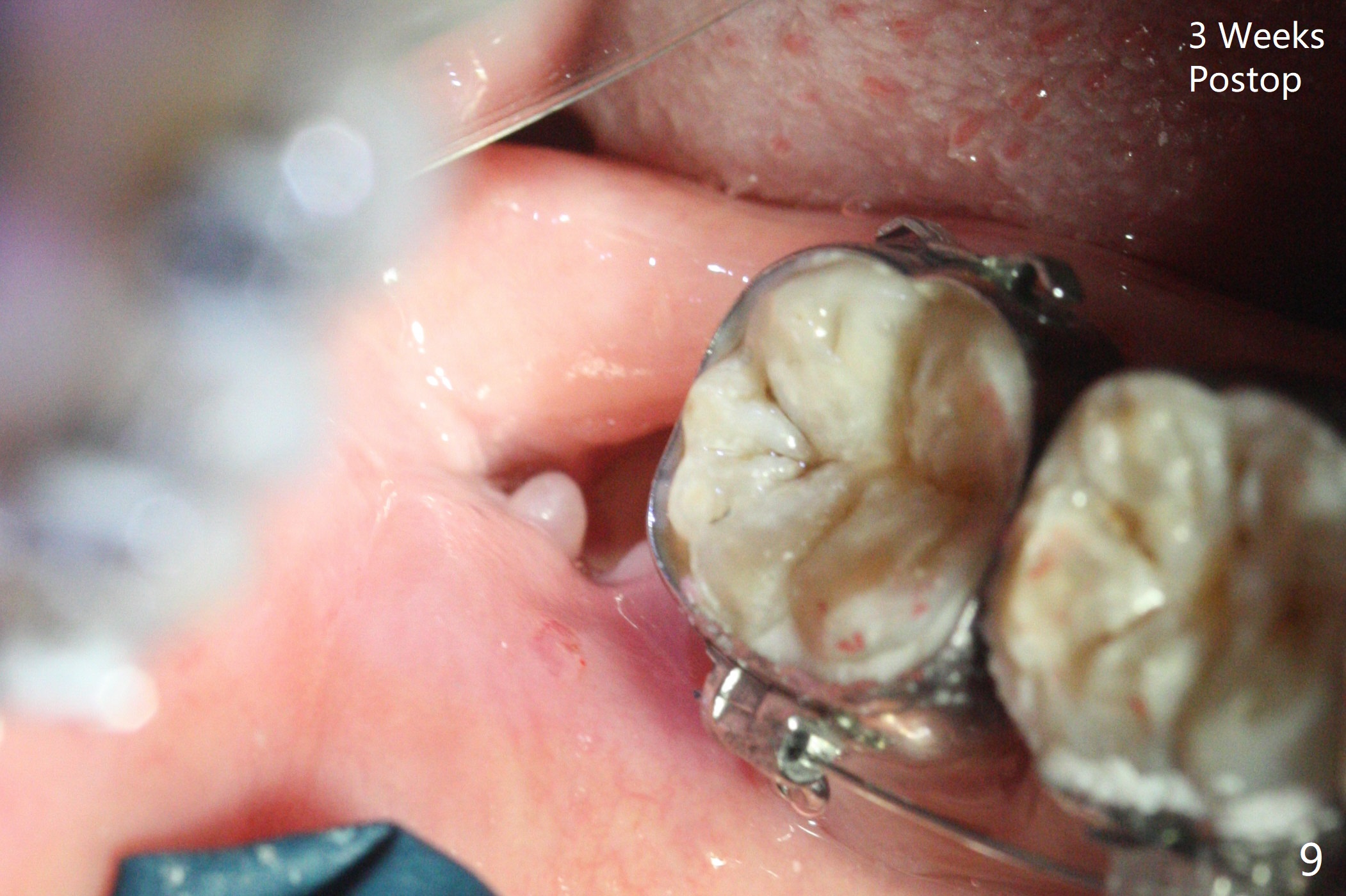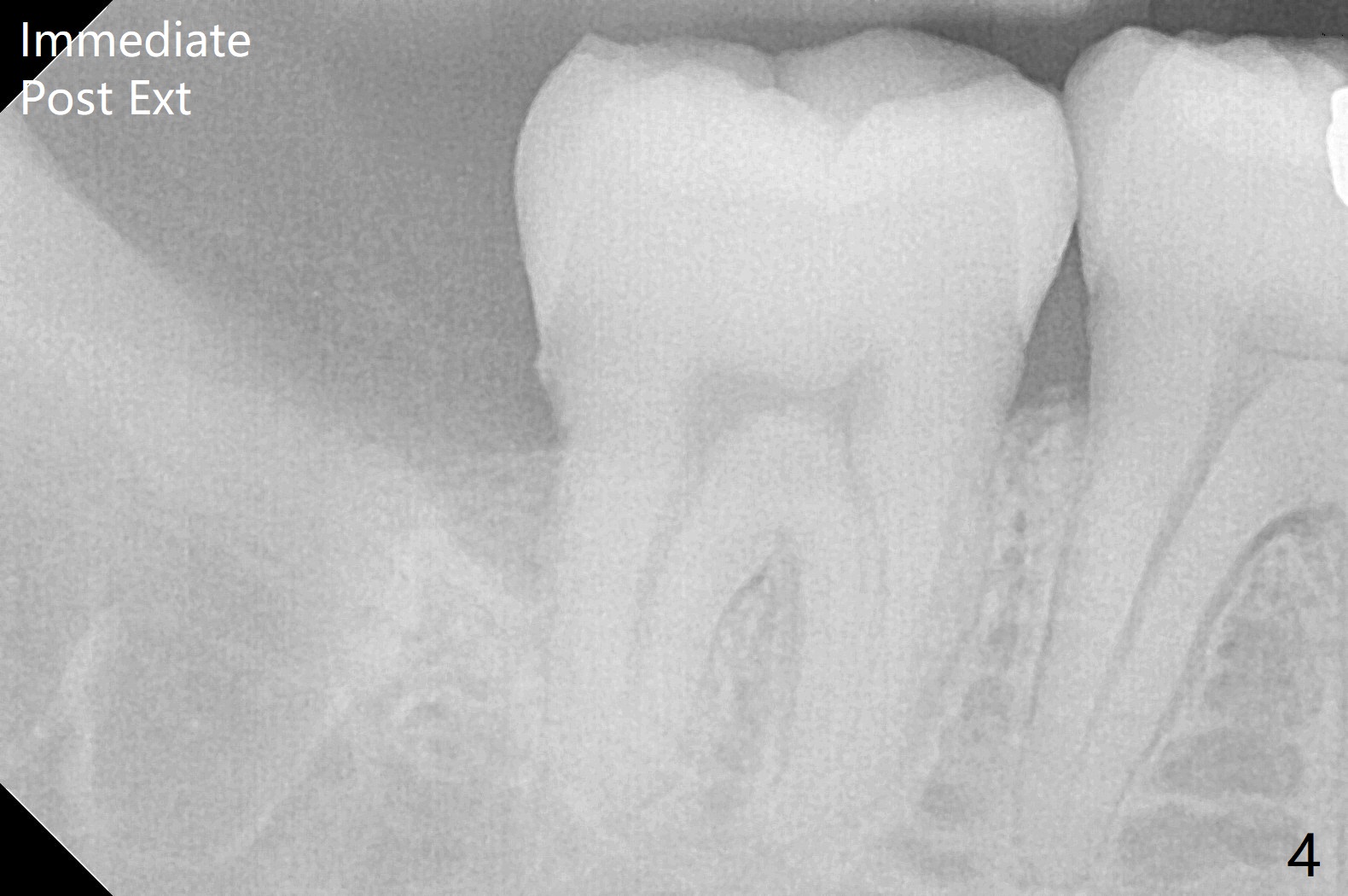 A 40-year-old man requests extraction of the teeth #17 and 32 (Fig.1). This case is designed to test that socket ossifies coronal when Collagen Plug is placed coronal. Release incision will be made both sides. Collagen plug will be placed at #32; none at #17. 4-0 PGA will be used to close the sockets. Photos will be taken immediate, 1 week, 1 month, and 3 months postop. PAs (sensor 1) will be taken immediate and 3 months postop. There is no wound dehiscence 1 week postop (Fig.6,7). The sockets reopen asymptomatic 3 weeks postop (Fig.8-11).