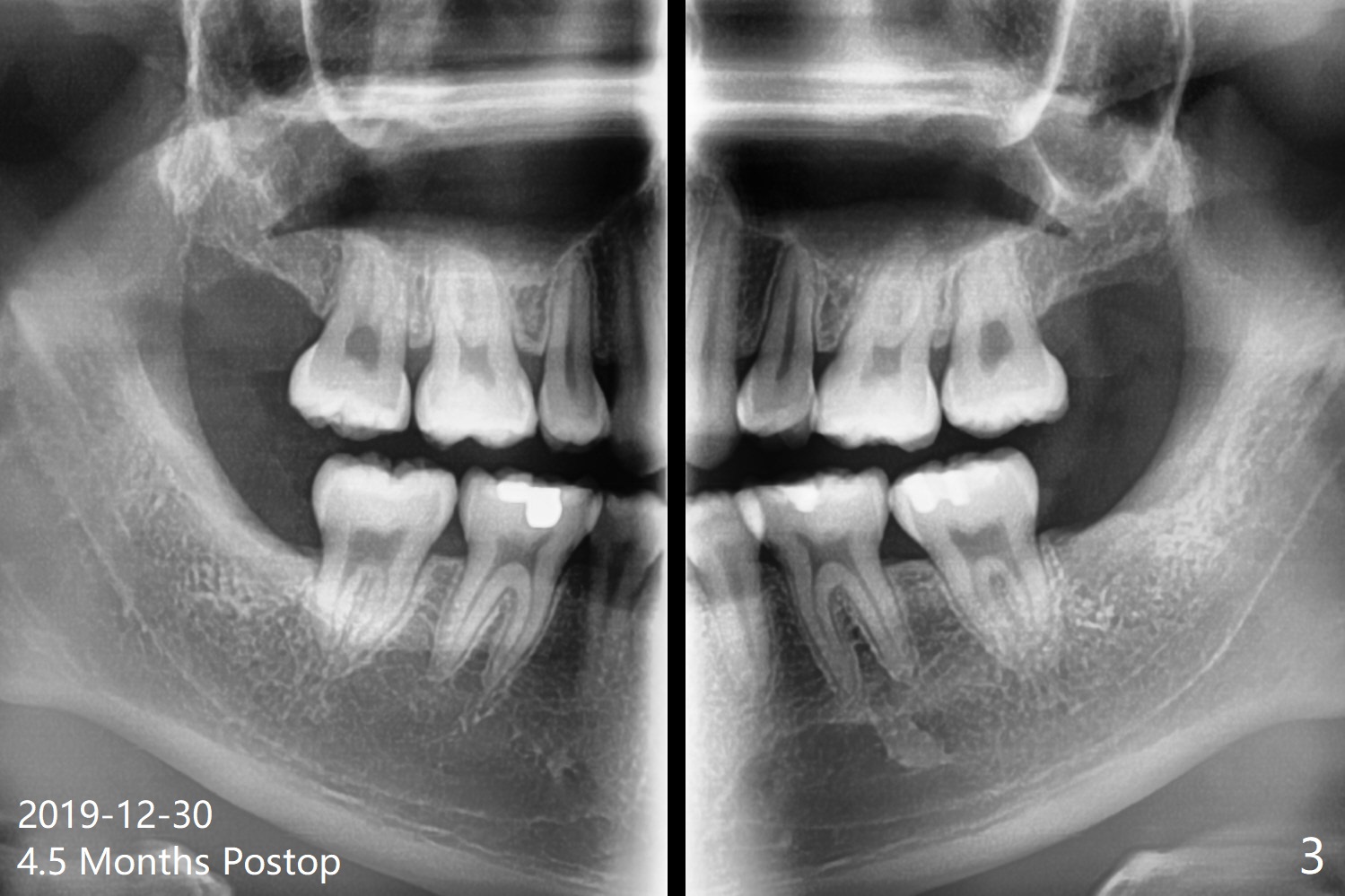 A 19-year-old man with history of orthodontic treatment (Fig.1,2) returns to office for #1,16,17,32 extraction with Collagen Plug placement at #17 and 32 (4-0 plain gut suture). The sockets heal in 4.5 months (Fig.3).