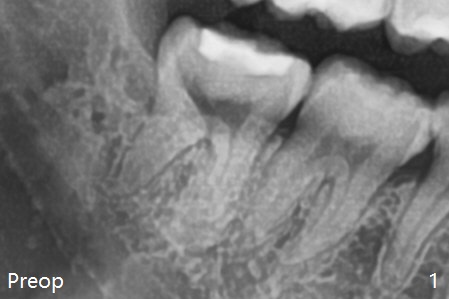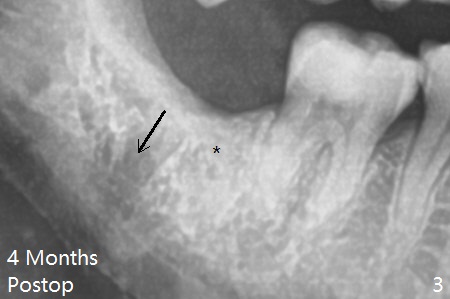 With incision, buccal trough is created at #32 for elevators so that the 2nd molar is not affected by elevation. Collagen plug is placed in the socket to prevent dry socket (Fig.2). The mesial socket is completely ossified (Fig.3 *), while the distal one partially ossified 4 months postop. The ossification in the distal socket seems to be from coronal to apical (Fig.3 arrow), in contrast to the traditional thinking of apico-coronal. The corono-apical growth may be related to Collagen plug placement. The plug is probably not originally inserted into the distal apical region.