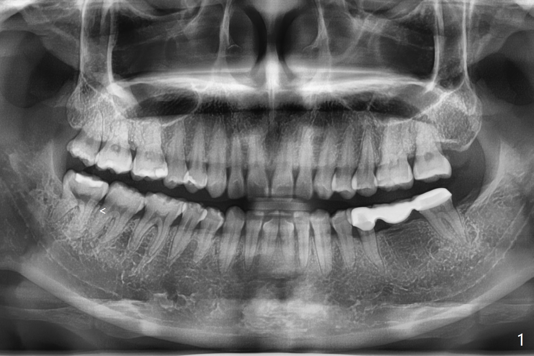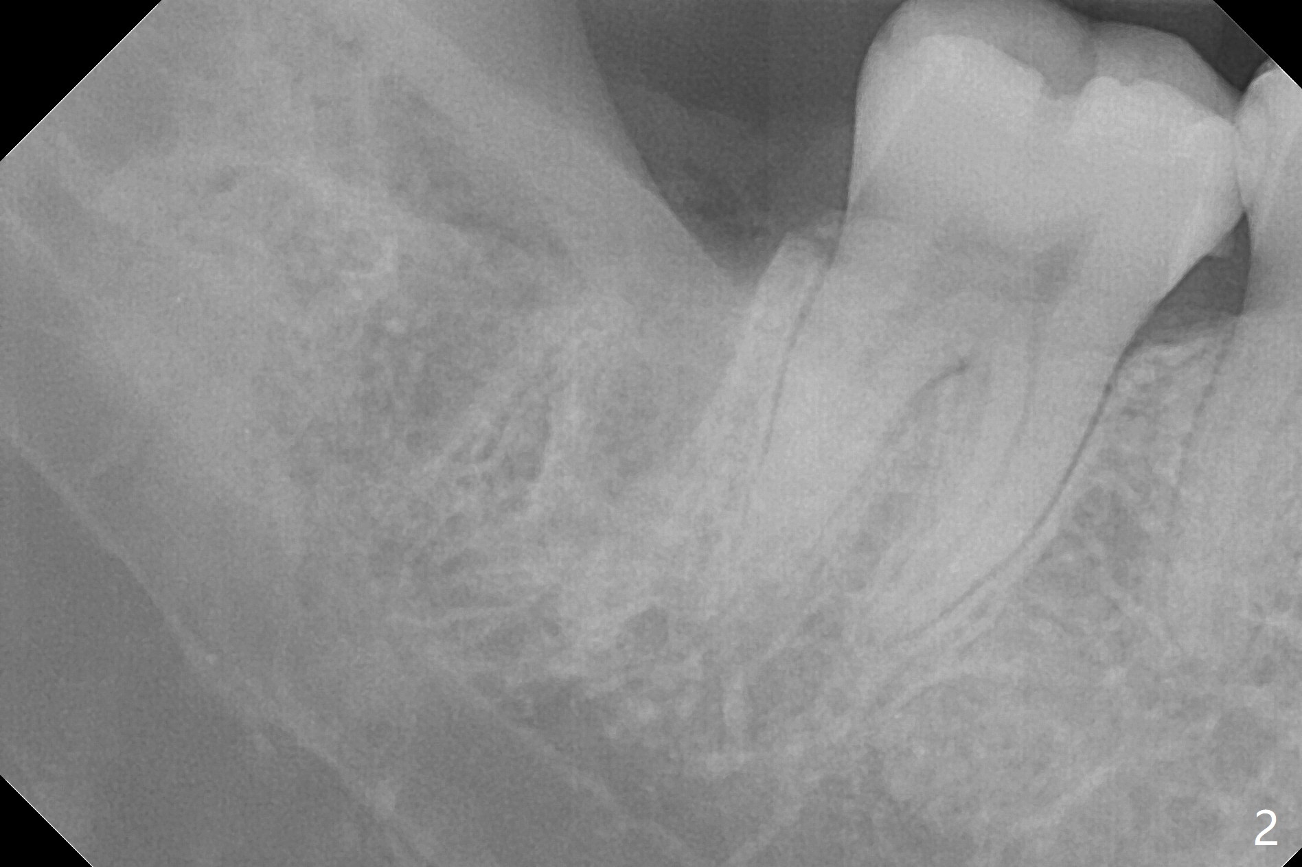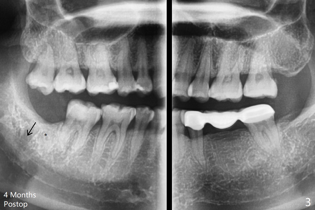 A 35-year-old woman has pericoronitis distal of #32. The bone between the 2nd and 3rd molars is high, but thin (Fig.1 <). With incision, buccal trough is created at #32 for elevators so that the 2nd molar is not affected by elevation. Collagen plug is placed in the socket to prevent dry socket (Fig.2). The mesial socket is completely ossified (Fig.3 *), while the distal one partially ossified 4 months postop. The ossification in the distal socket seems to be from coronal to apical (Fig.3 arrow), in contrast to the traditional thinking of apico-coronal.