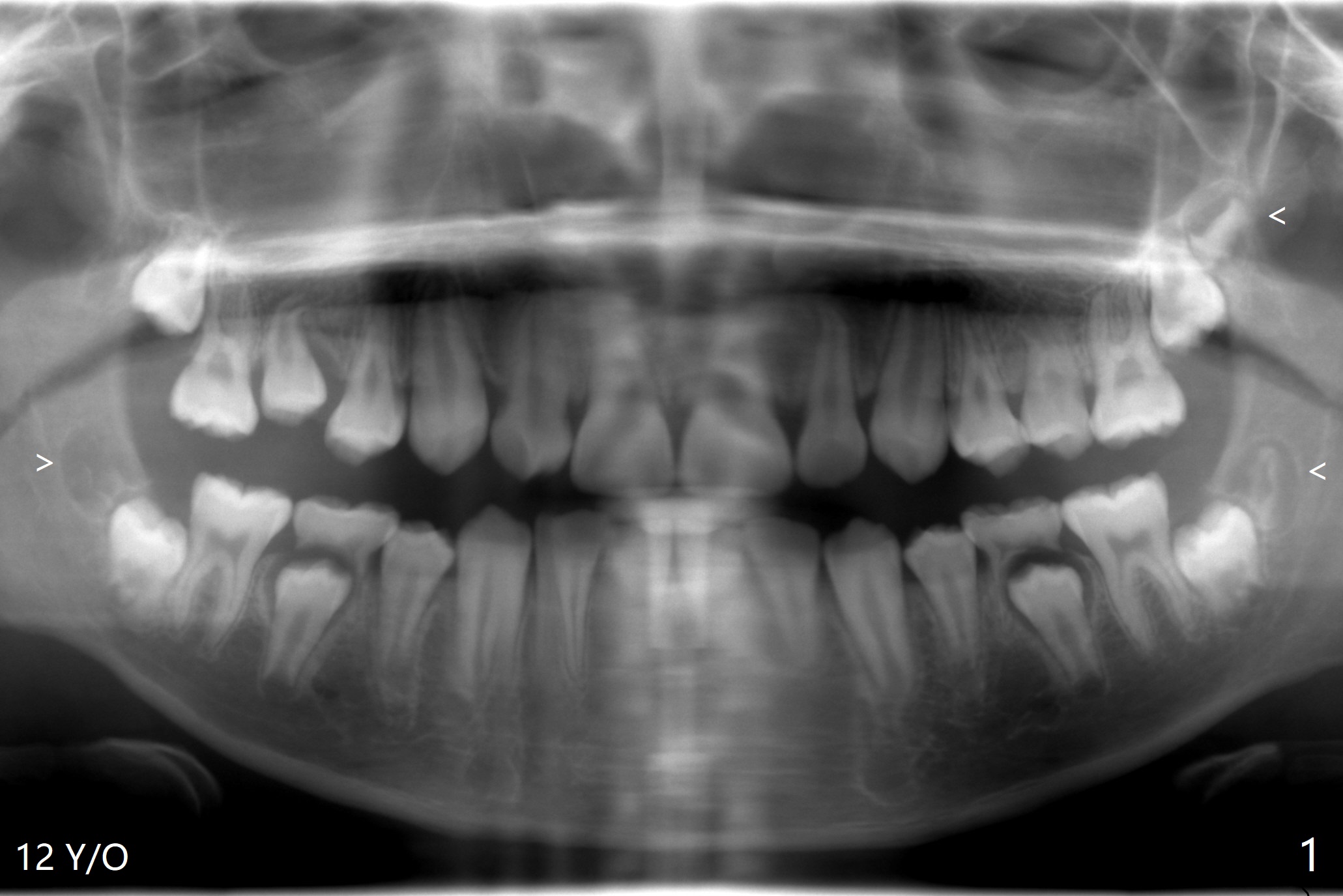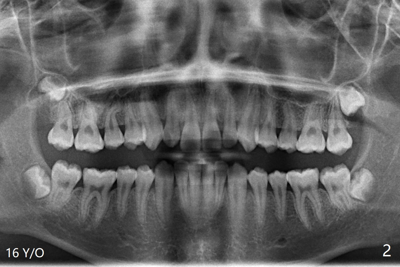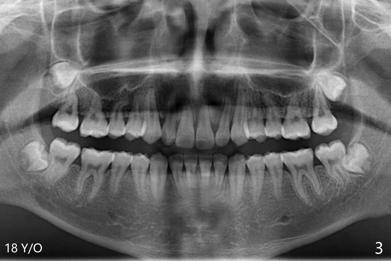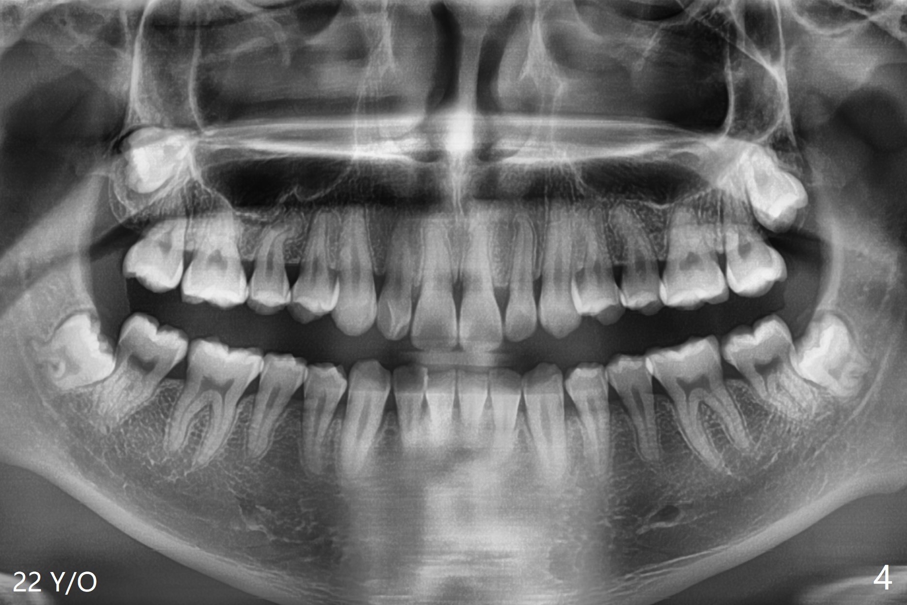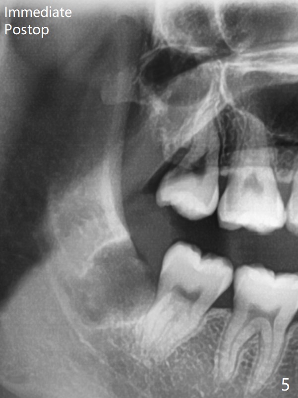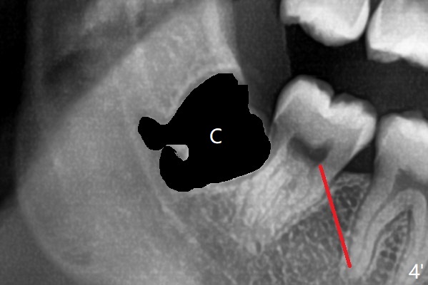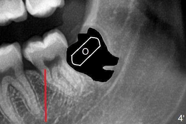 A 22-year-old man will return for 3rd molar extraction (4 of them, Fig.1-4). Prepare 2 or 3 #15 blades and 1-2 extra surgical burs. Since the third molars may overlap with the second ones, oblique incision (red line in Fig.4') will be mesial. Place Collagen and Osteogen plugs in the #32 and 17 sockets, respectively (Fig.4': C, O). As the roots are short and bone formation distal to the 2nd molars is critical, the plugs will be placed horizontally and coronally (Fig.4' white outline). No dovetail is needed. Pan 4 BW will be taken immediately and 3-4 months postop. The experiment will confirm whether collagen plug is enough to facilitate socket bone healing. In fact extraction of #1 turns out to be extremely difficult. There is not enough time for #16 and 17 extraction in one appointment (Fig.5).