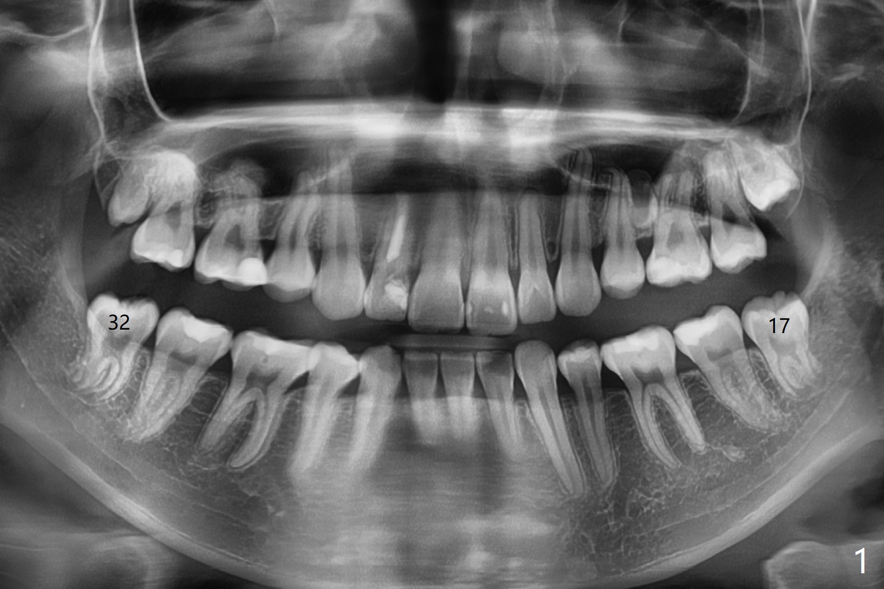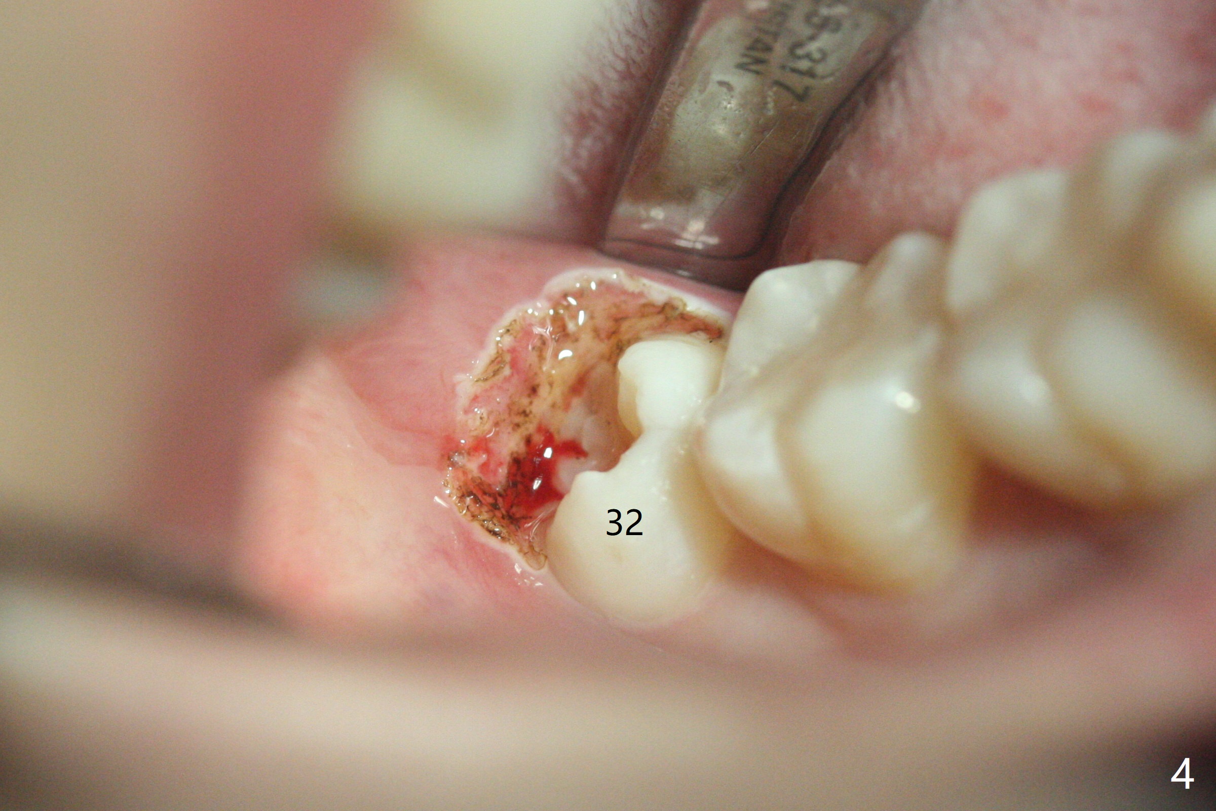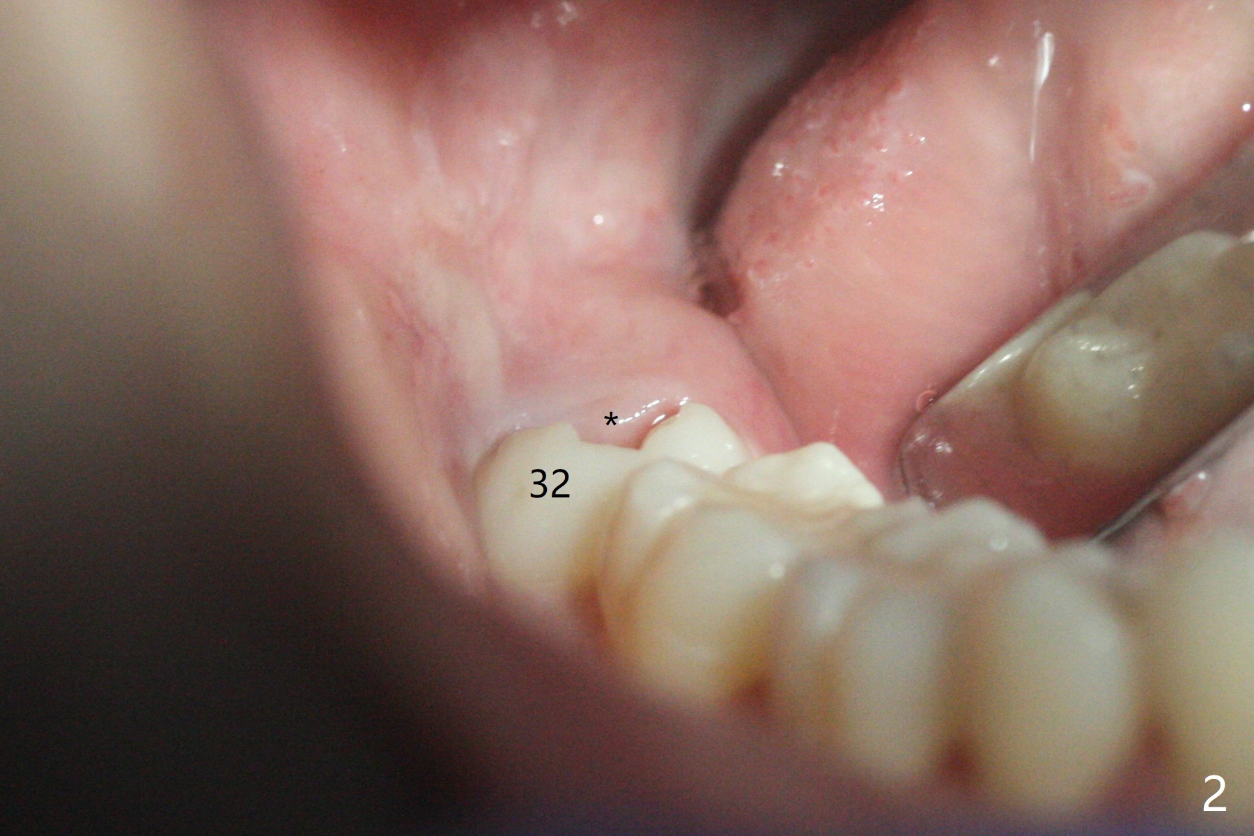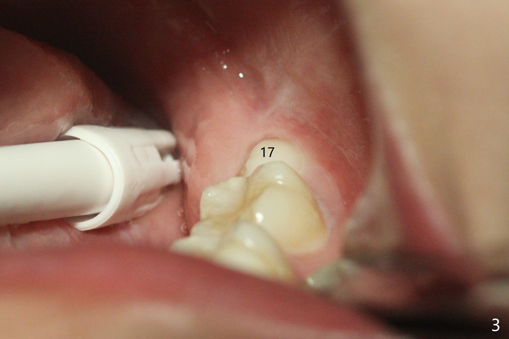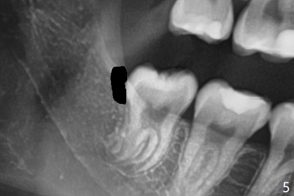 19岁女抱怨右下智齿远中龈下食物坎塞,不希望拔除,因为缺牙太多:先天性缺失一个下切牙,为了矫正又拔除4个双尖牙(图一)。临床检查32号牙远中牙龈覆盖(图二:*),而17号牙萌出不多(图三),没有食物坎塞史。局麻下,使用Diode Laser (Picasso)切除牙龈直到智齿远中咬合面暴露(图四)。术后突然意识到为了防止牙龈重新覆盖,必须做crown lengthening,也就是切除远中骨质(图五(黑色),与图一’对比),是吗?随访时利用Shining口扫记录,拍摄角度好。