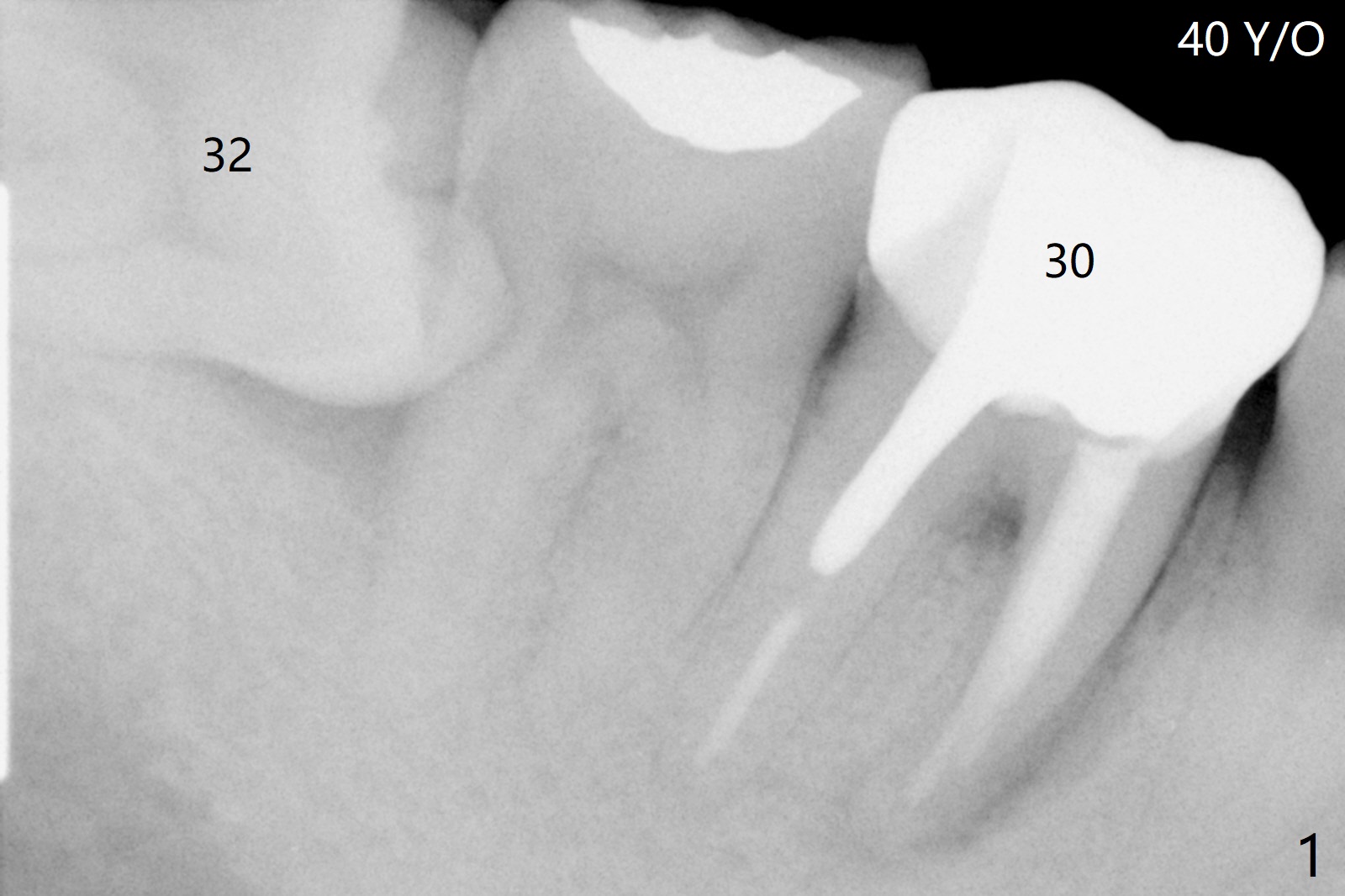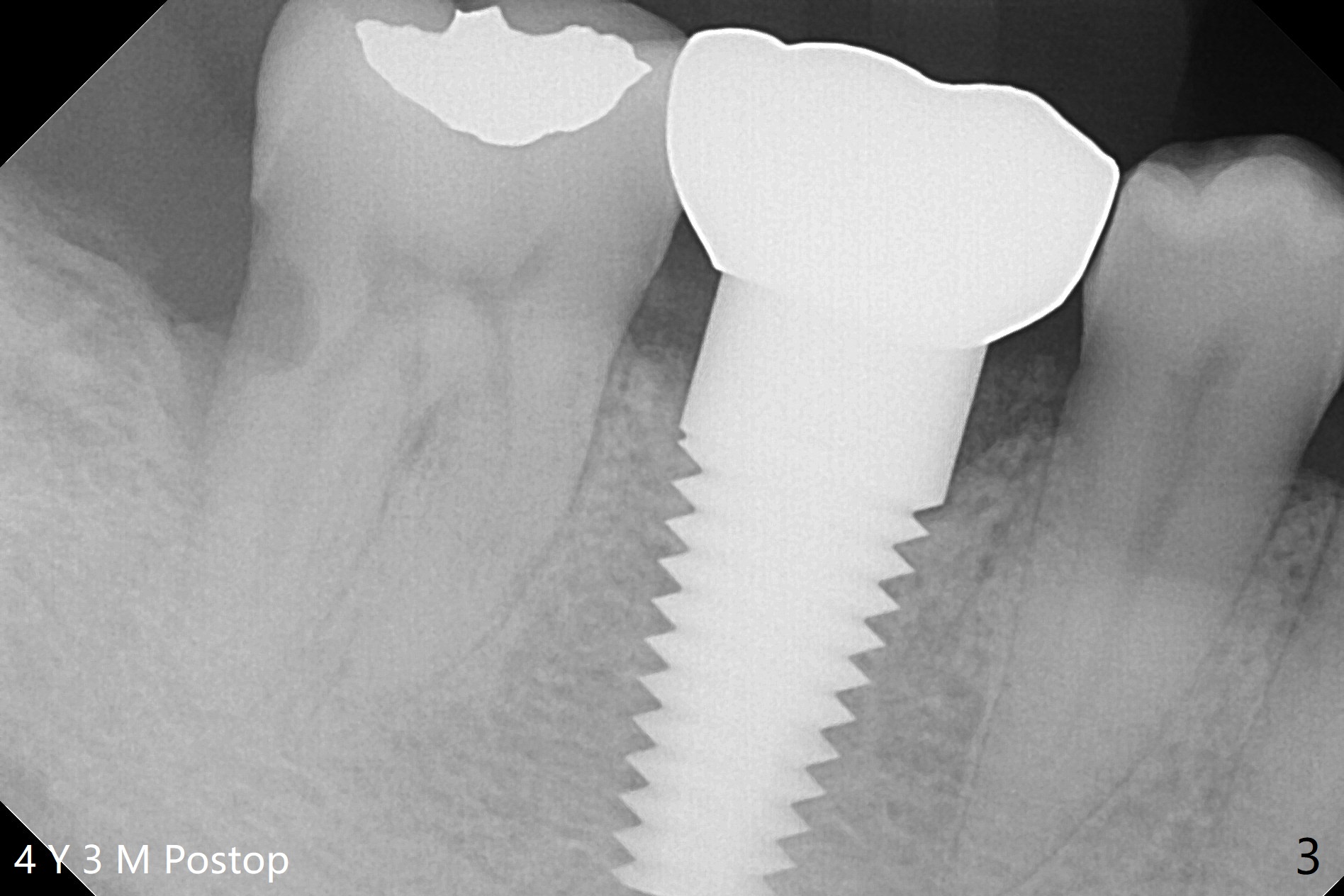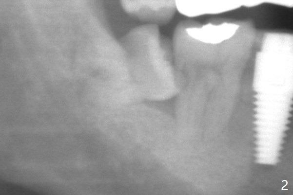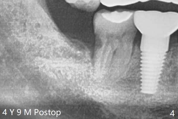 A 40-year-old man had the tooth #32 extracted without bone graft immediate post #30 implant placement (Fig.1,2). The distal bony defect of the tooth #31 appears to have been repaired 4 years postop (Fig.3,4).