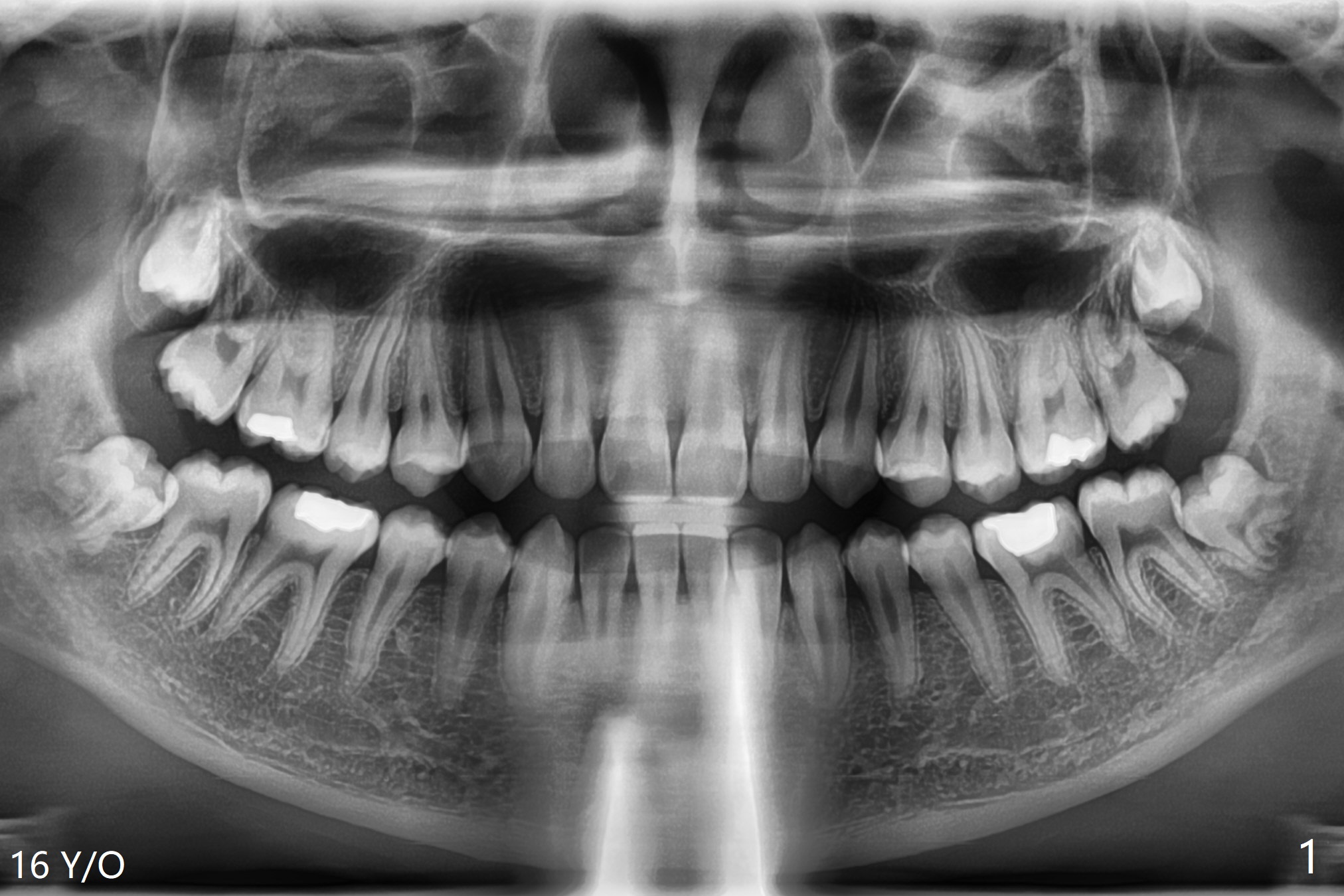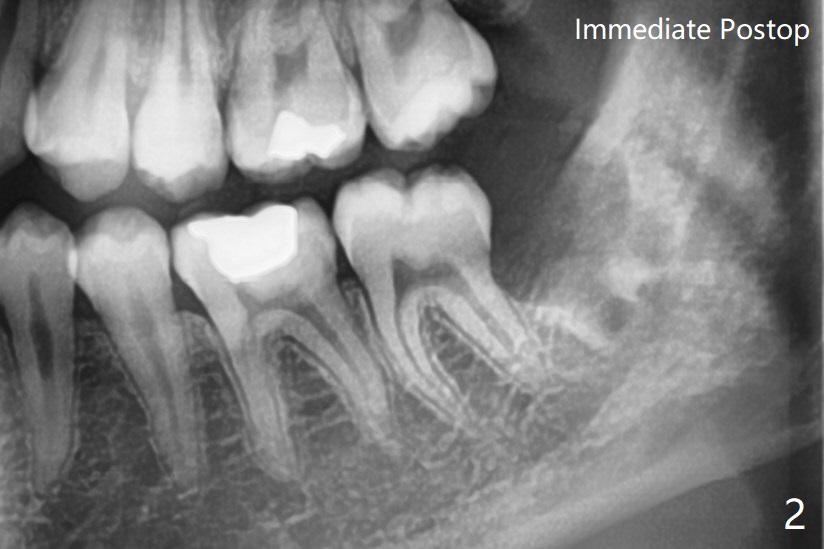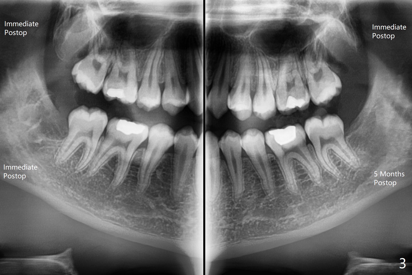 左下智齿疼痛(图一),截骨后牙齿容易松动,然后切断两次,顺利拔除,放置Osteogen Plug,4-0 铬羊肠线缝合(图二)。5个月后另外三个智齿拔除(右下放置胶原塞;上智齿拔除盲目,困难,稍微早些),左下智齿牙槽窝愈合(图三);近中牙槽嵴重建。