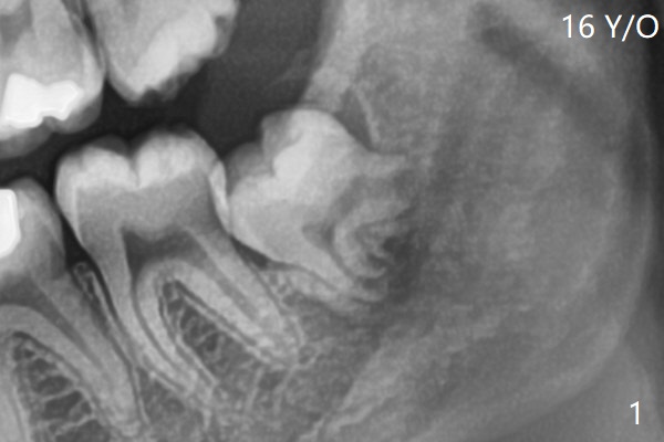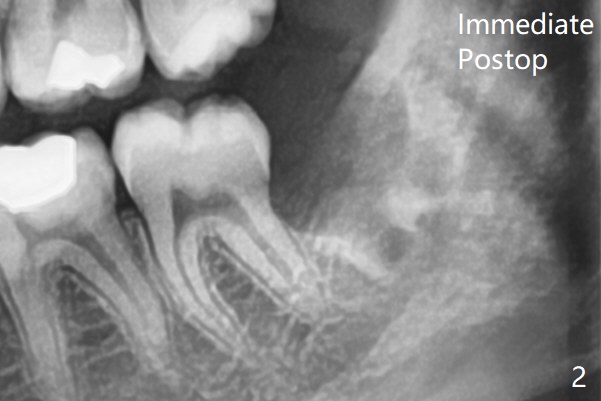 截骨后牙齿容易松动,然后切断两次,顺利拔除,放置Osteogen Plug,4-0 铬羊肠线缝合(图二)。近中牙槽嵴中断。