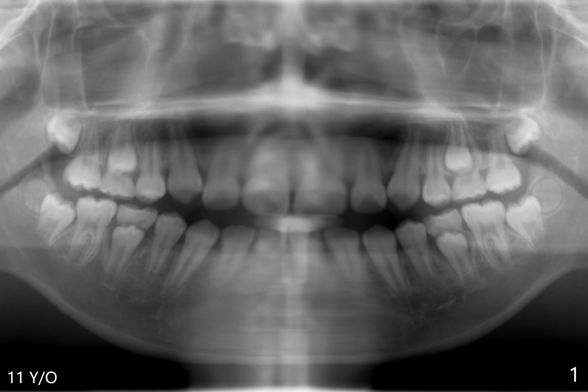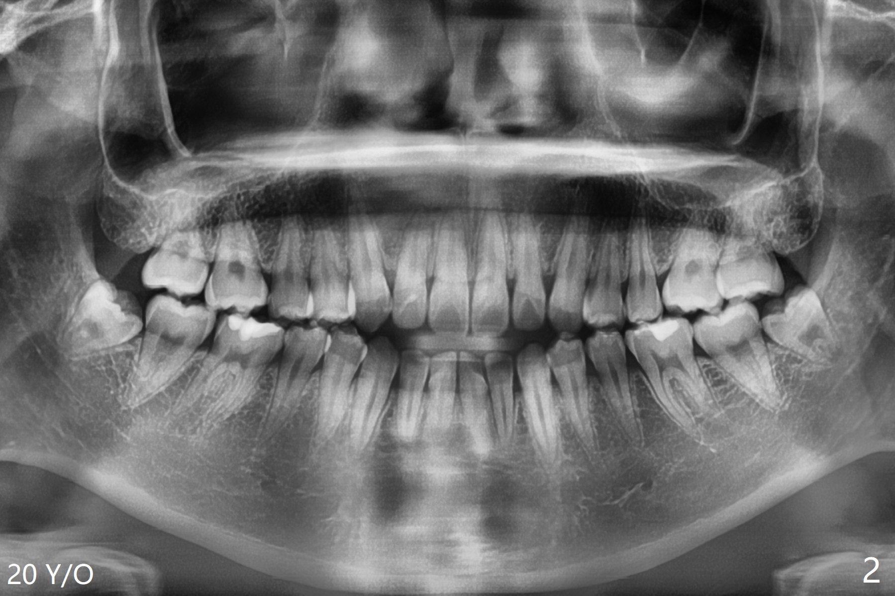 The teeth #17 and 32 are developing at the age of 11 of a woman (Fig.1). She requests extraction at the age of 20 (Fig.2 (anterior open bite)). While buccodistal trough is created for both of them, the one at #32 needs a sectioning before removal. Osteogen plug is applied for both of them. Postop hemorrhage occurs at #32 for 2 days.