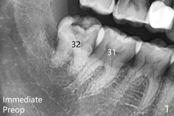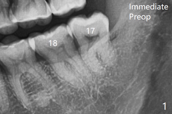 There is limited bone between the lower 2nd and 3rd molars (Fig.1). Purchase point is made buccal to #17 for elevation.