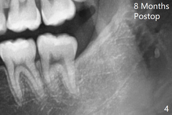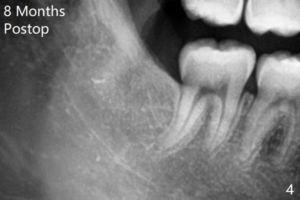 1.5年智齿牙根长长(图二)。1.5月后下颌智齿拔除放置Osteogen Plug(图三)。八个月后牙槽窝愈合(图四)