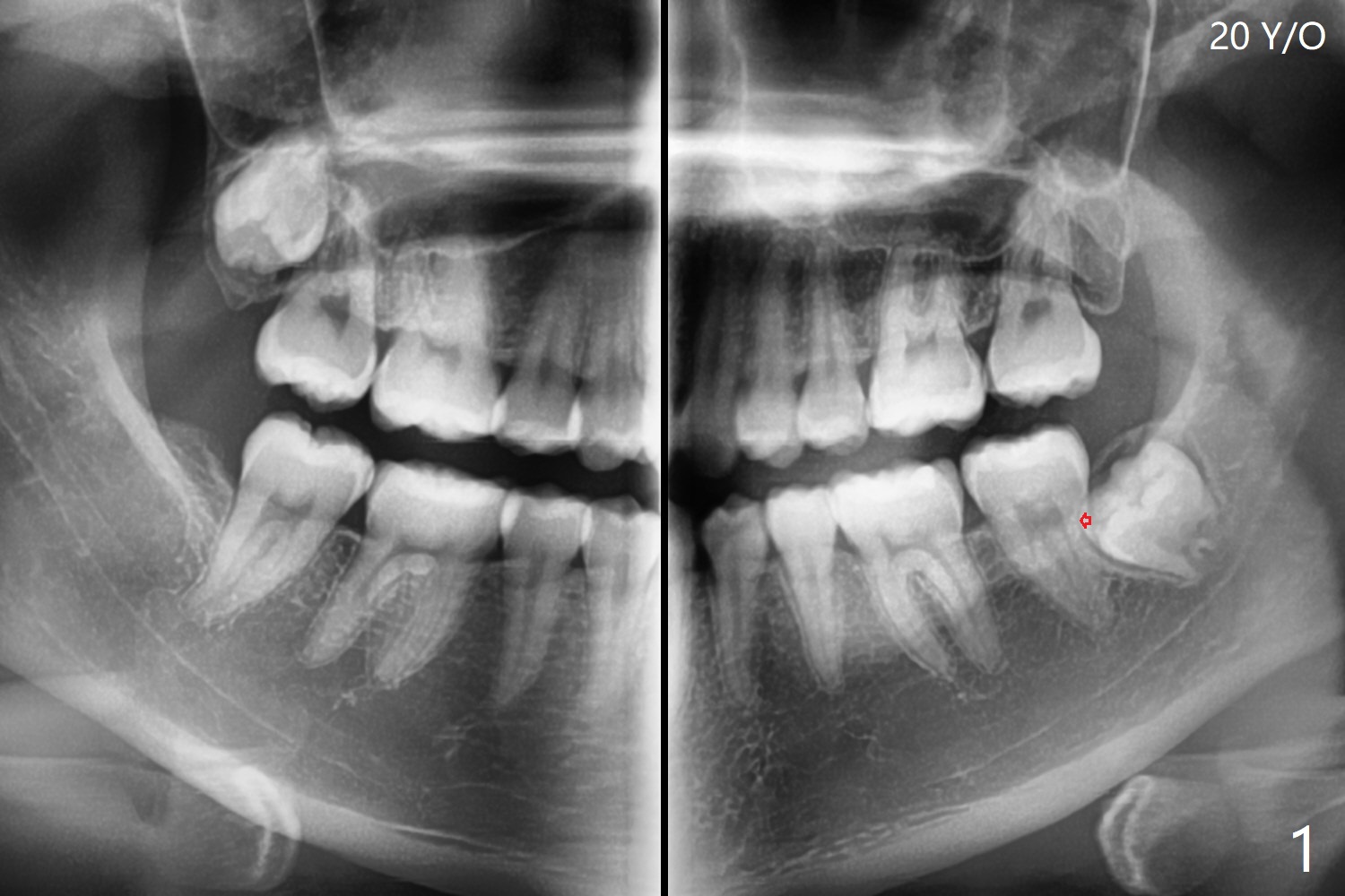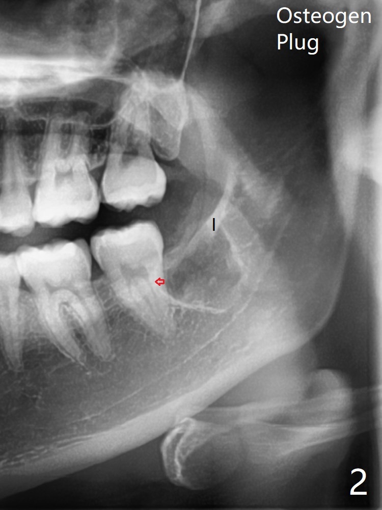 A 20-year-old woman requests extraction of the lower left 3rd molar (Fig.1). In fact the tooth being buccal to the 2nd molar is ignored preop (Fig.1,2 red arrow). The vertical incision is placed too distal with subsequent elevation of the mesial flap. From now on every panoramic X-ray should be viewed with magnification before surgery! After extraction, one piece of Osteogen Plug is placed; the anterior end of the Internal Oblique Ridge (Fig.2 I) is located in the posterior of the socket. As the socket heals, the anterior end of the ridge is expected to advance.