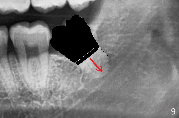 这时试图松动根尖,可能增加根尖或者工具进入神经管可能性(图九:箭头)。