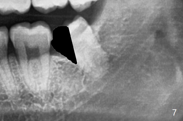 下牙槽神经管(*)位于智齿根尖下方(图一);而没有颊侧沟形成,也没有大量松动智齿,包括牙根,直接切割牙(图六:黑线),去除近中牙齿(图七:黑色)