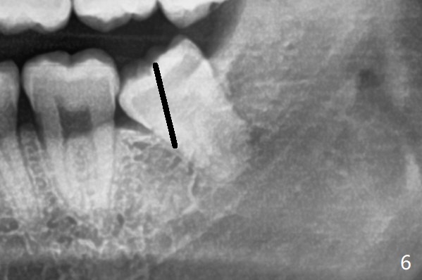 下牙槽神经管(*)位于智齿根尖下方(图一);而没有颊侧沟形成,也没有大量松动智齿,包括牙根,直接切割牙(图六:黑线)