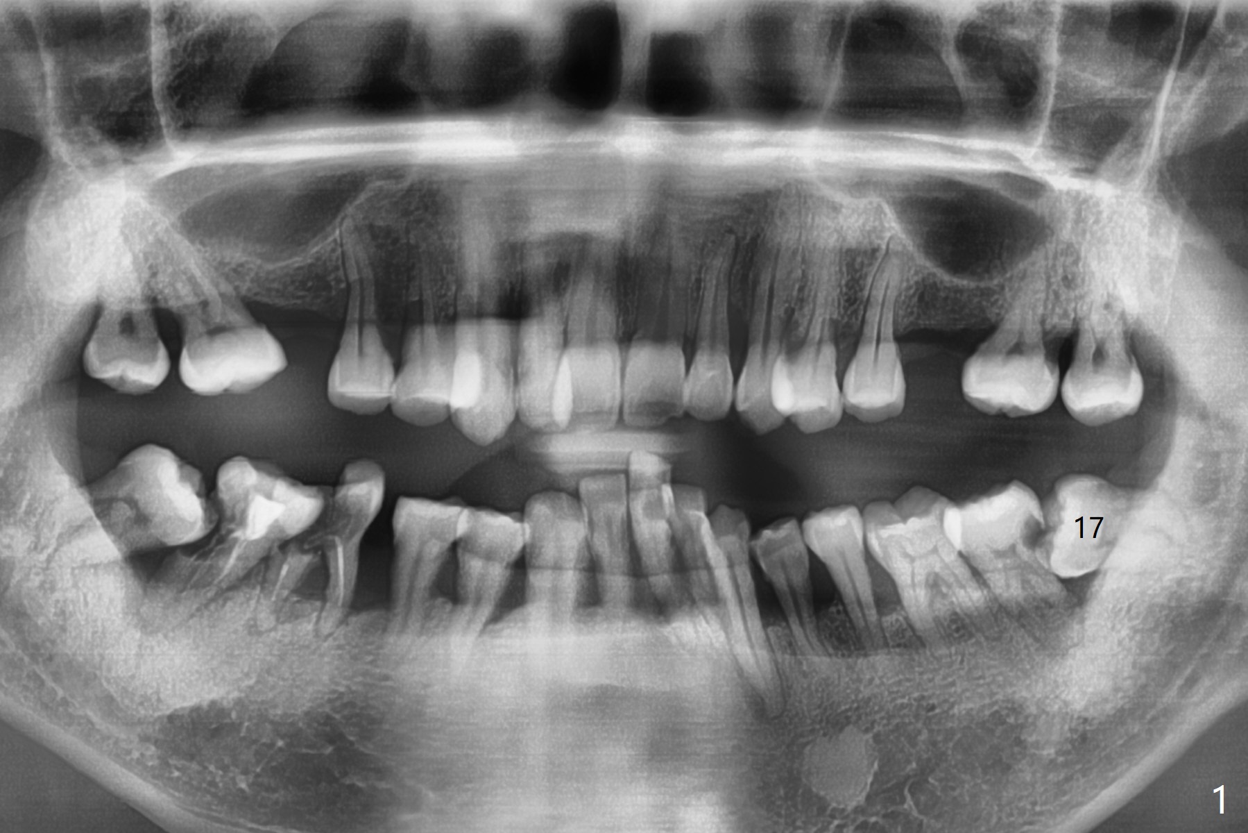 A 48-year-old man with poor dentition and financial constraint returns for treatment. His complaint appears to be related to #18 DO caries/pulpitis (Fig.1). After #17 surgical extraction, #18 caries is removed with pulpal exposure. The majority of the distal surface of the distal root of #18 is exposed. IRM is placed. Osteogen plug is inserted at #17 with 4-0 Chromic suture.