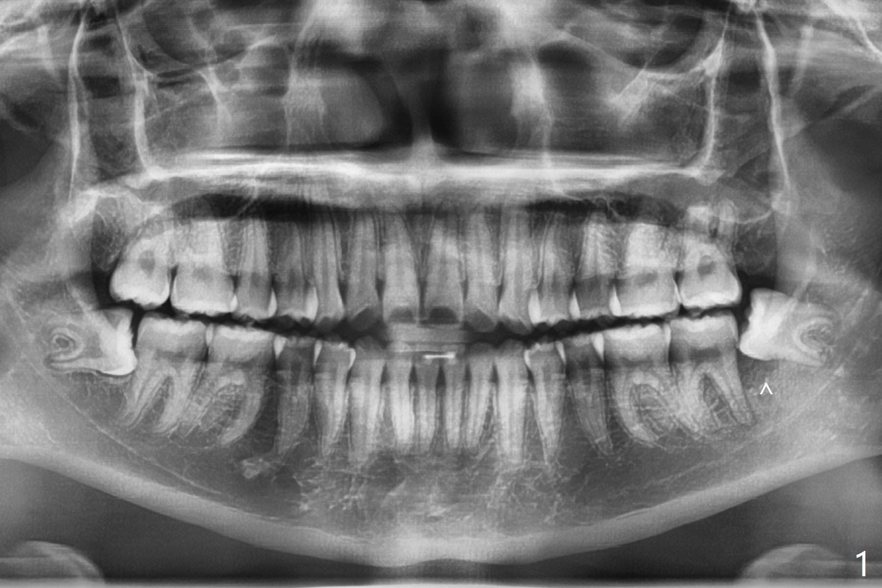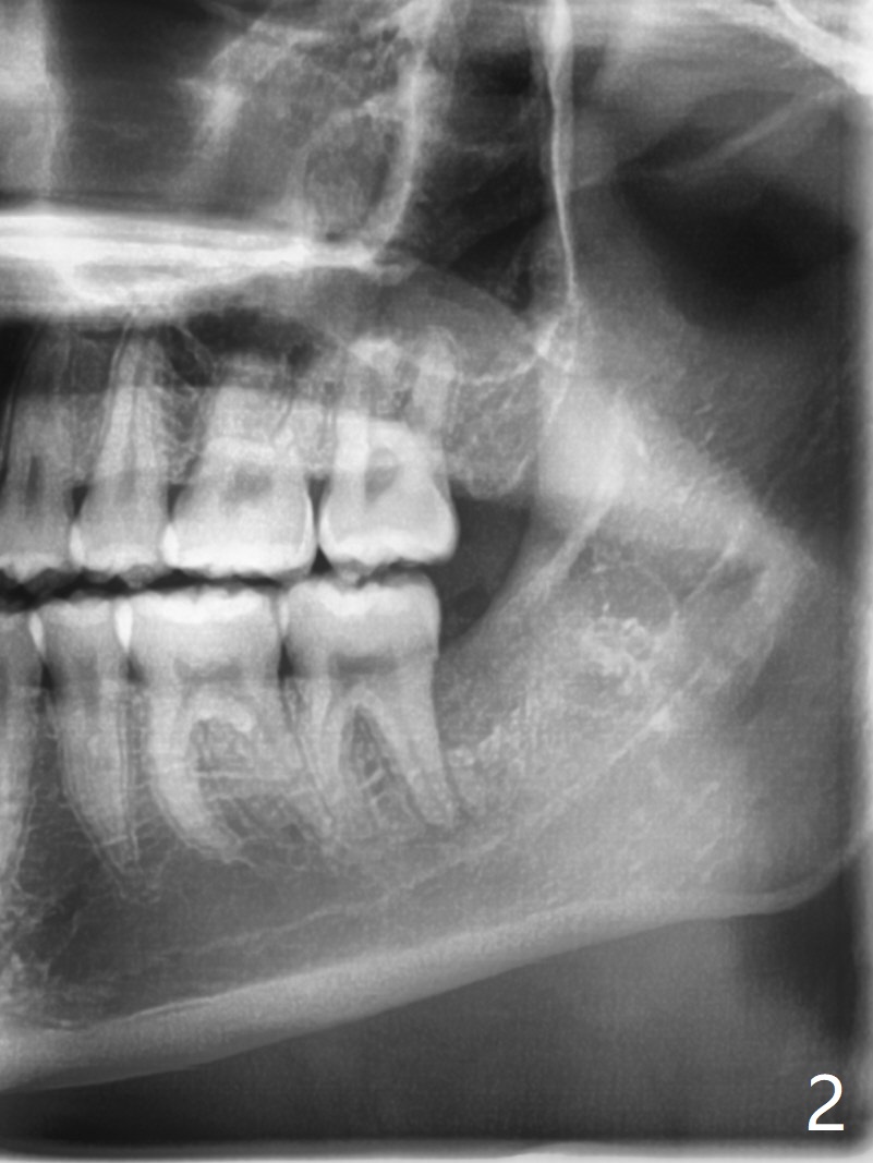A 15.5-year-old woman with poor oral hygiene has pericoronitis at #17 extending to the left 2nd molar, corresponding to bone loss between them (Fig.1 ^). After extraction, a piece of Osteogen plug is placed horizontally as mesial as possible (Fig.2).