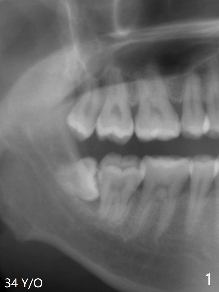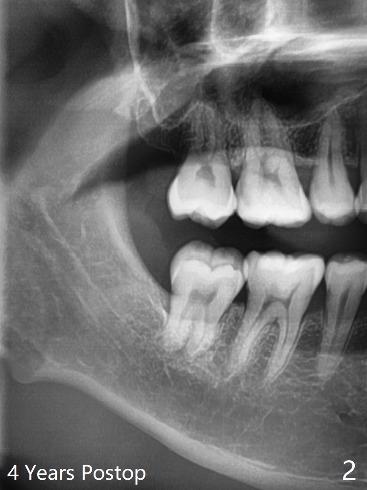 A 34-year-old man requests extraction of #1 and 32 (Fig.1). With placement of Osteogen Plug at #32 after extraction, the socket is filled with bone 4 years postop (Fig.2).
