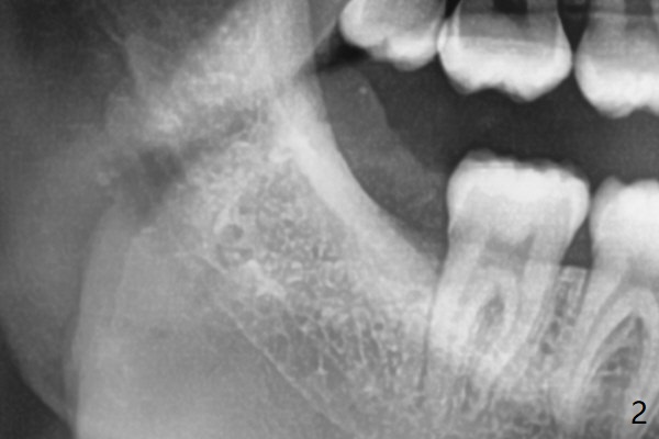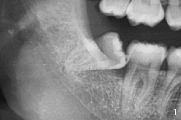 #32 has fused apices, which need sectioning before removal (Fig.1). A piece of Osteogen plug is inserted to the socket before suturing (Fig.2).