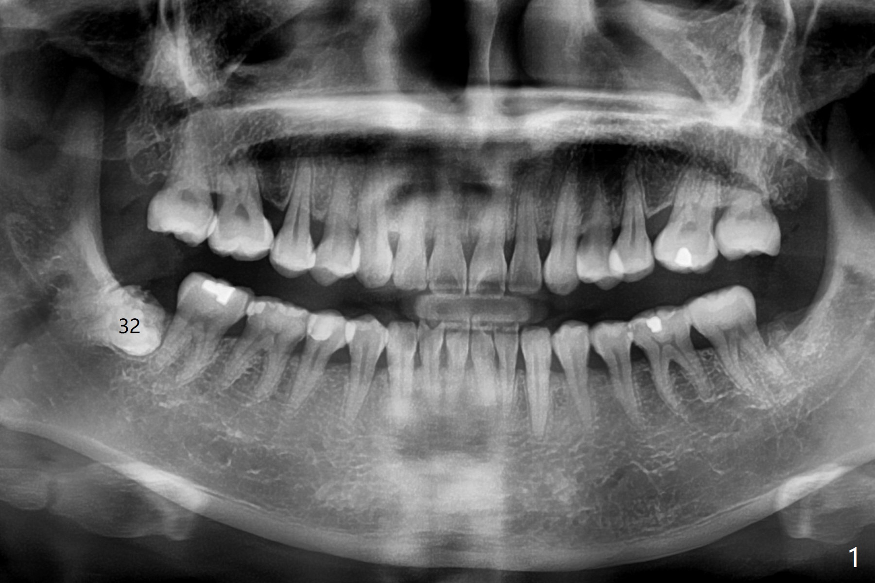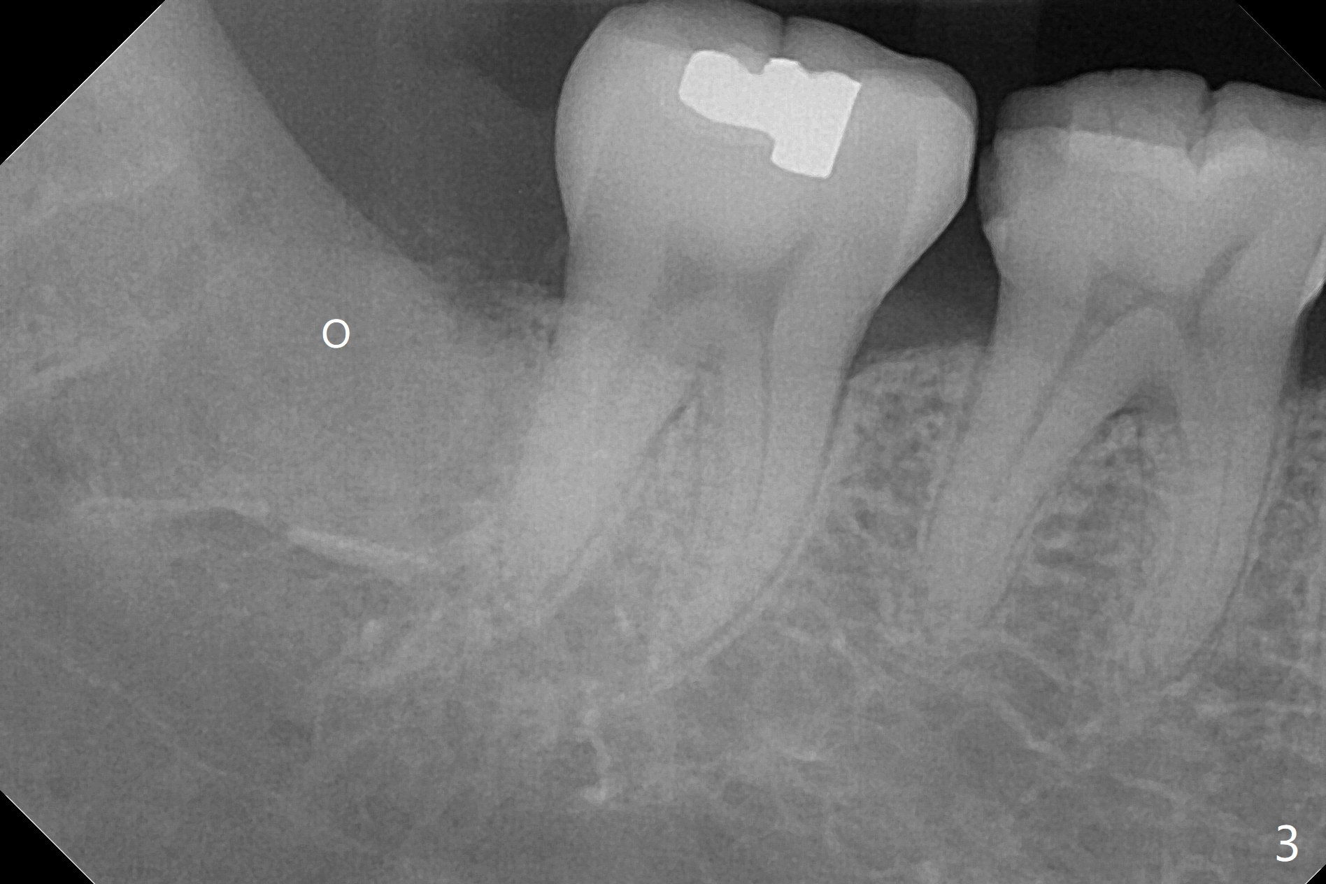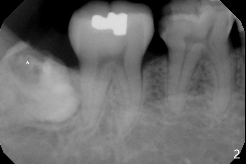 A 51-year-old woman presents to clinic because of infection in the lower right third molar (Fig.1). Although the tooth seems to be fully bony impaction, there is a sinus track with light purulent discharge after oral Amoxicillin for 5 days. In fact there is subgingival caries (Fig.2 *). The accessory incision is made mesiobuccal of #31 due to horizontal impaction. In fact the tooth is buccal and slightly mesial to #31. The impacted tooth requires several sections to be removed. Osteogen Plug is placed because of the thin bone between #31 and 32 (Fig.3 O).