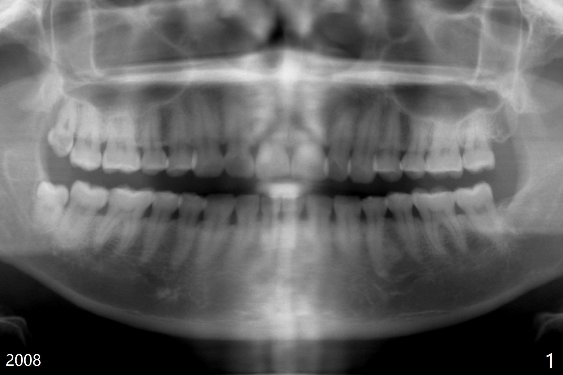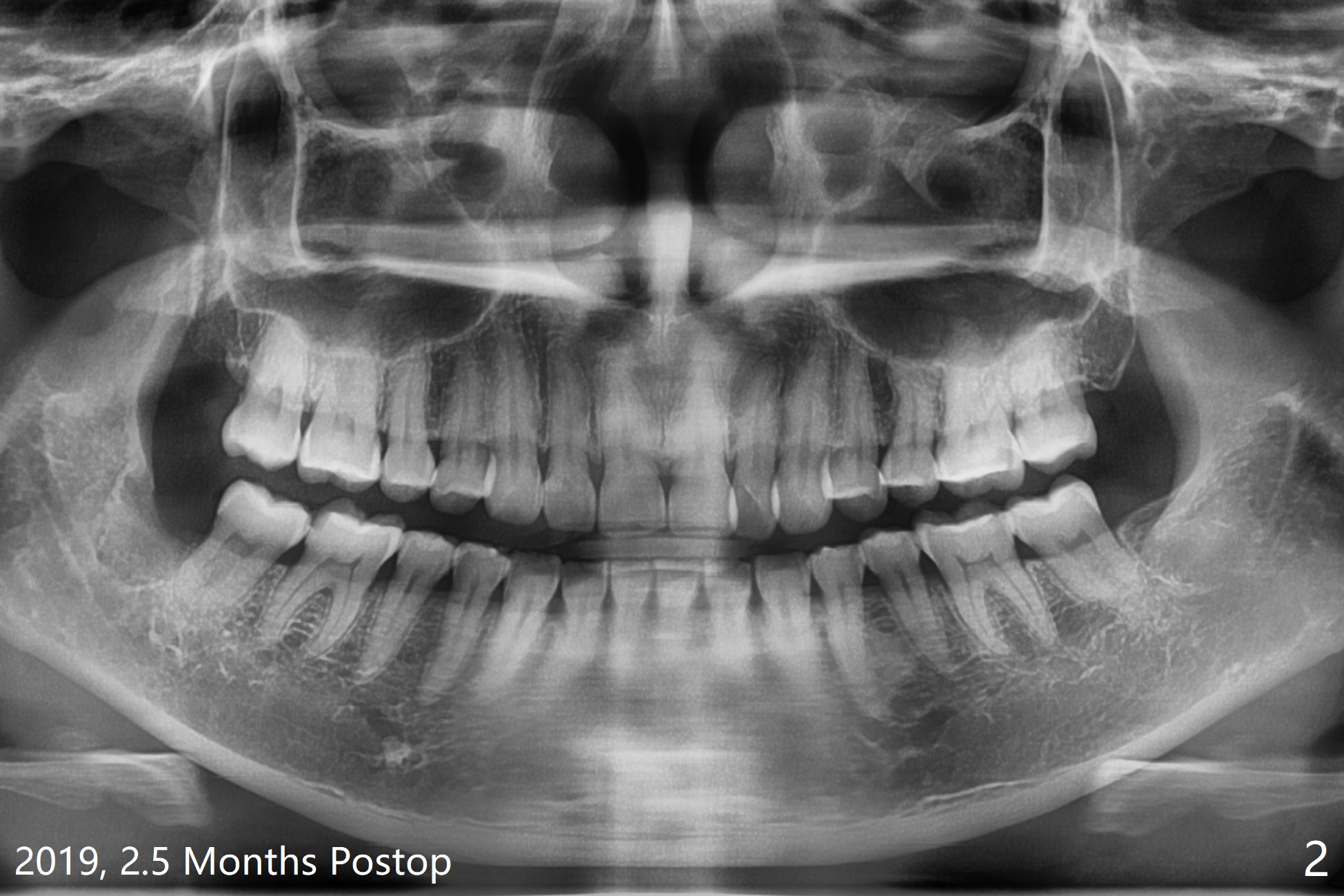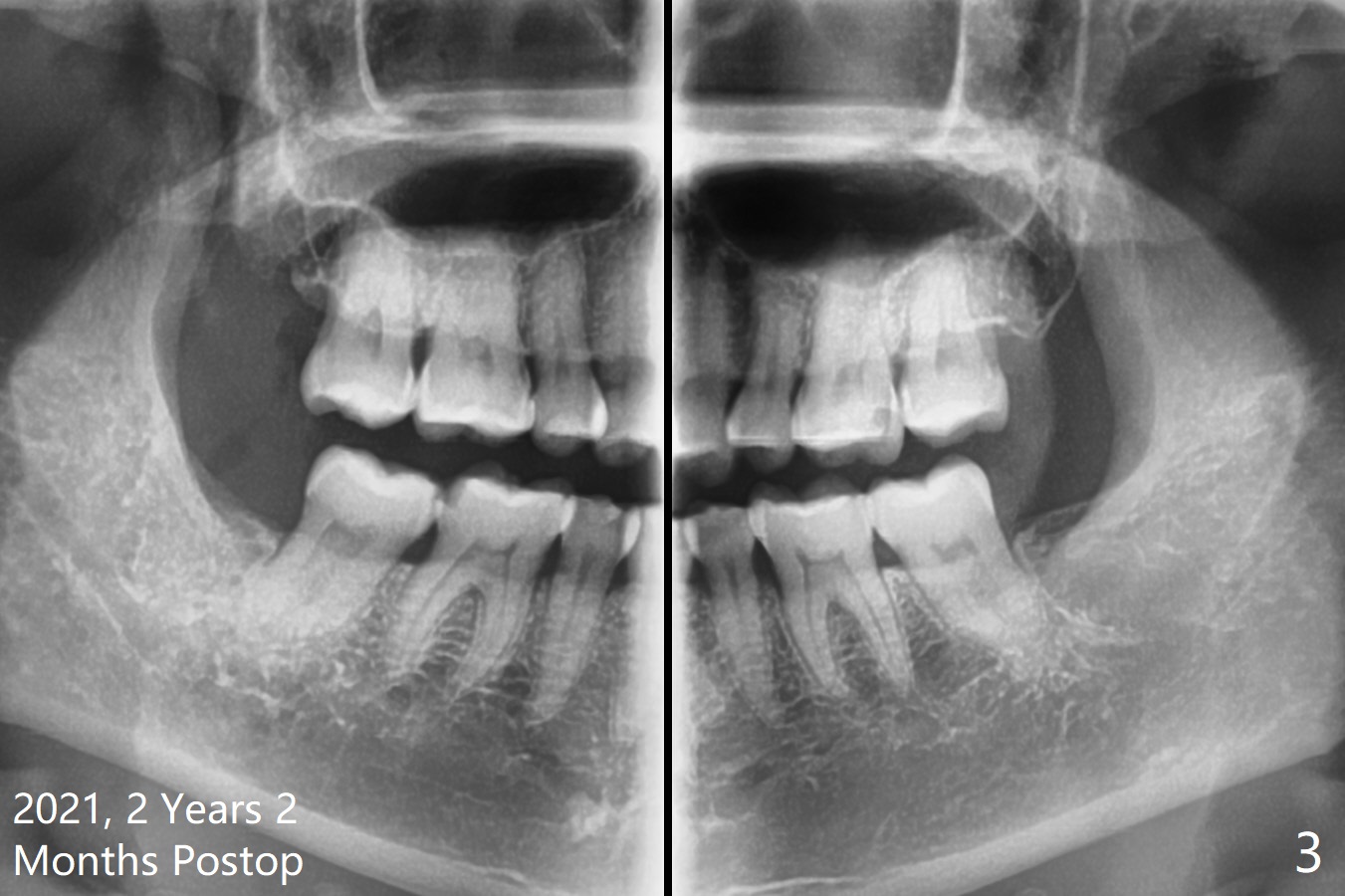 51岁女要求拔除#32(图一),劈牙两次,牙槽窝塞入胶原骨(Osteogen Plug),缝合,术后12天有不典型干槽症。术后2.5月第二,三磨牙之间牙槽嵴薄(图二:>),术后2年2个月#32牙槽窝密度高于#17(术后至少13年,图三)。