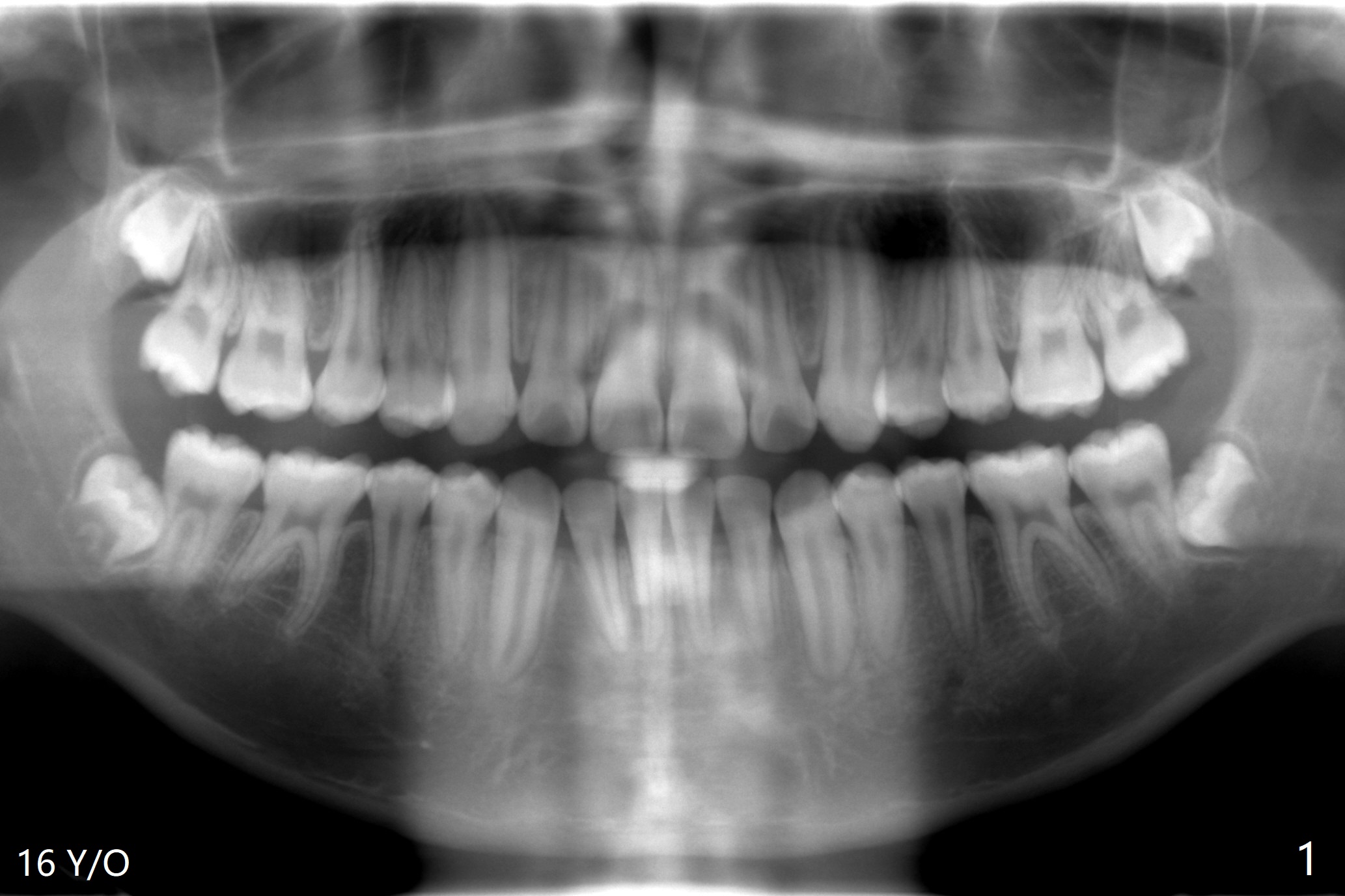 16岁男孩,上颌智齿在第二磨牙CEJ之上,太早拔除。下颌智齿牙根尚未形成,拔除困难,观察。