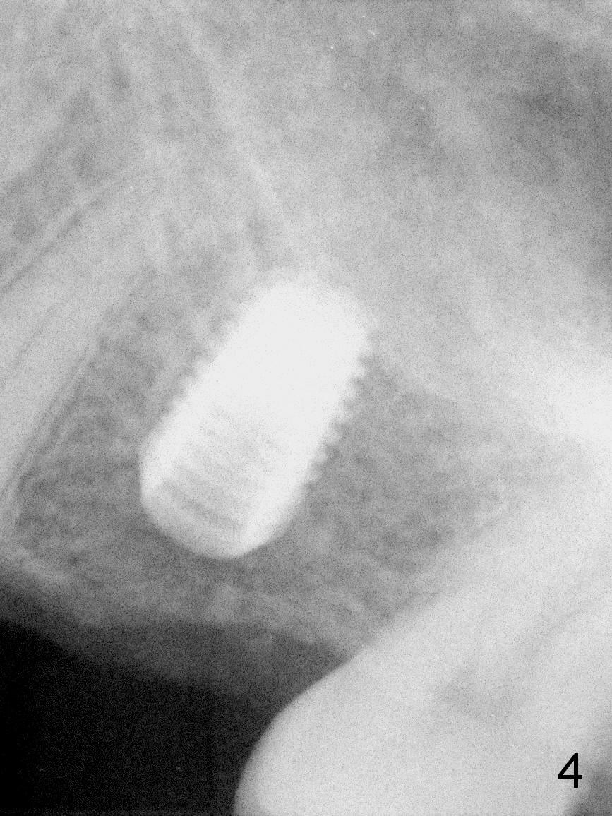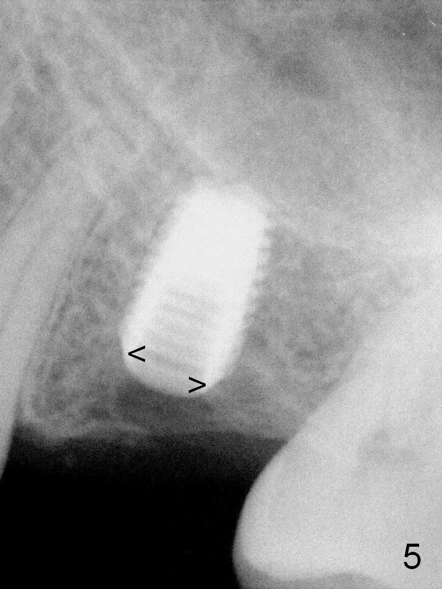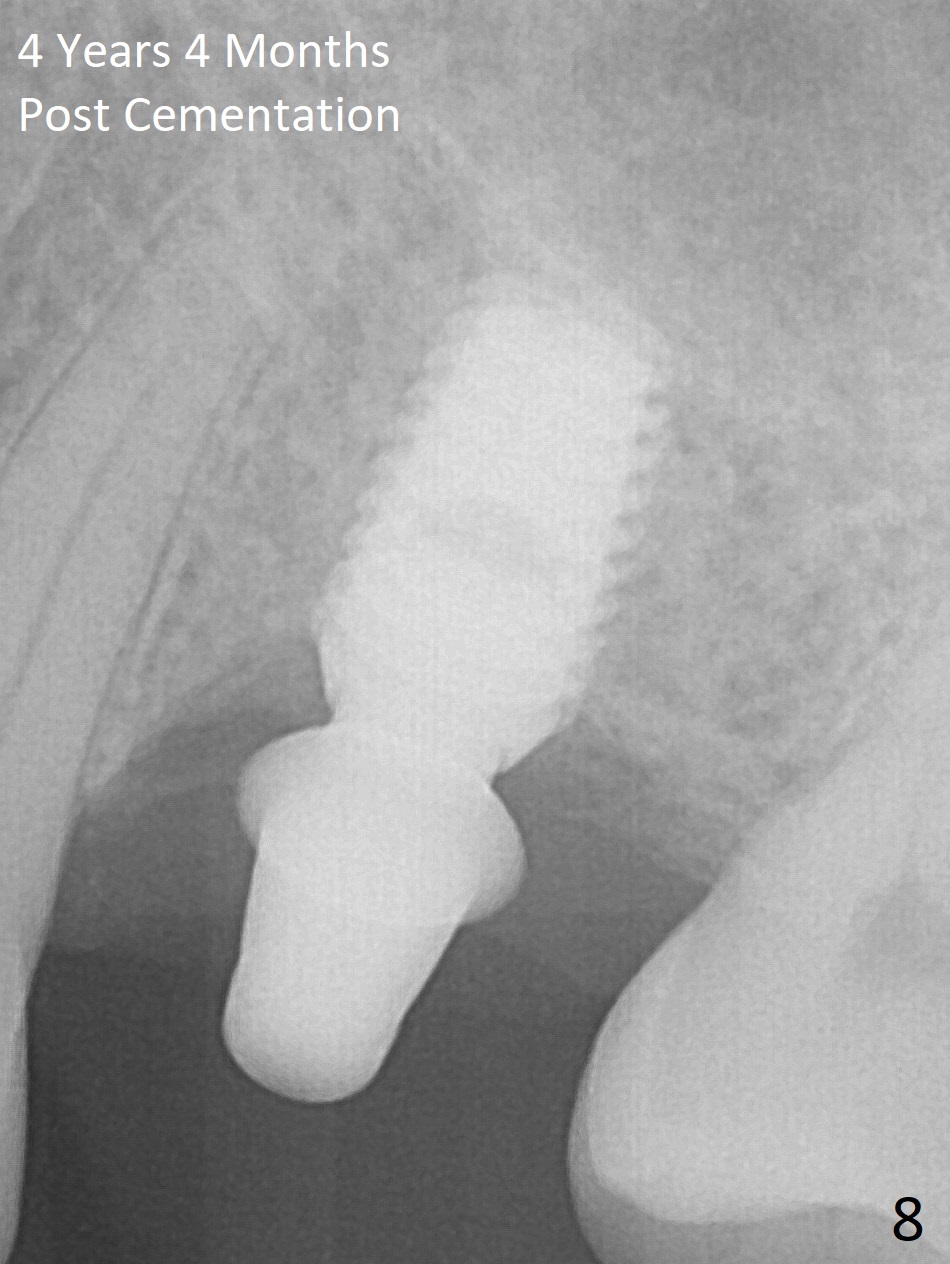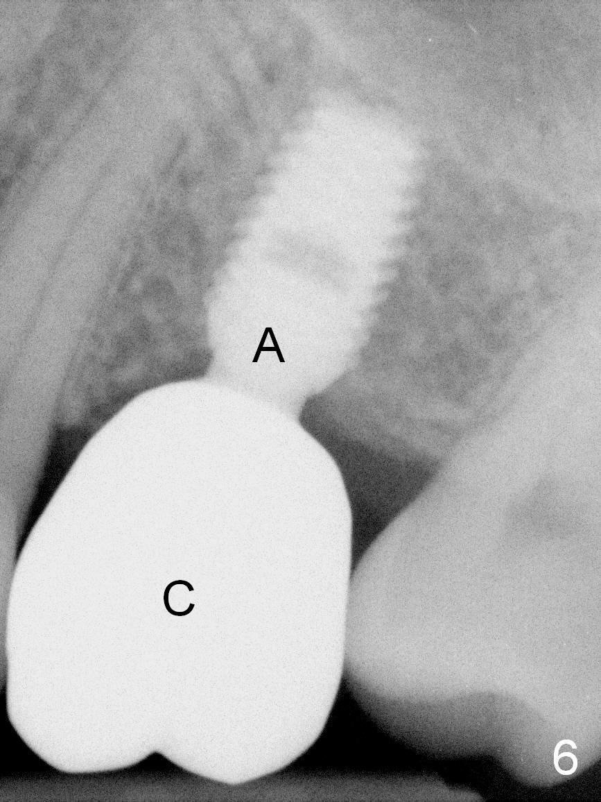 A 49-year-old man is an engineer. The tooth #14 is missing (Fig.1,2). He wonders how a one-rooted implant can replace a three-rooted tooth. Anyway, osteotomy is initiated at the site with 2.5 mm reamer in place (Fig.3). A 5x8 mm Bicon implant is placed (Fig.4). Seven and a half months later, the bone density next to the implant plateau appears to increase (Fig.5 arrowheads, as compared to Fig.4). The beauty of Bicon implant is that the crown (Fig.6 C) can be extraorally cemented to the abutment (A) prior to re-seating. Two years and 3 months post cementation, while no residual cement is visible, the bone density at the crest has increased (Fig.7 arrowheads). The crown is de-cemented 4 years 4 months post cementation; it appears that the abutment is small and short (5x2 mm 10 degree stealth). The bone density of the cortex around the implant (Fig.9 ^) is higher than that at #15 and #3.