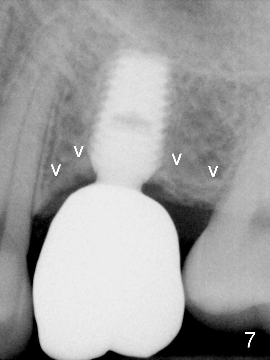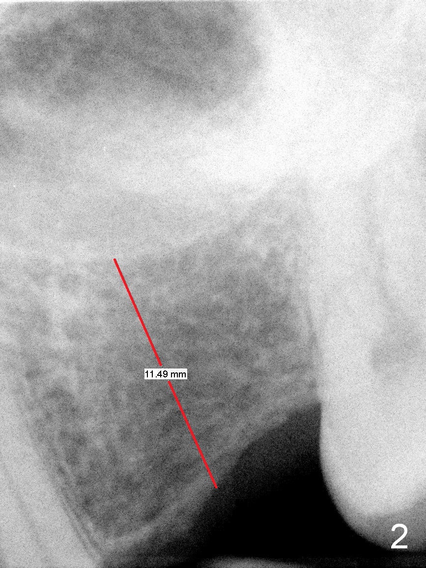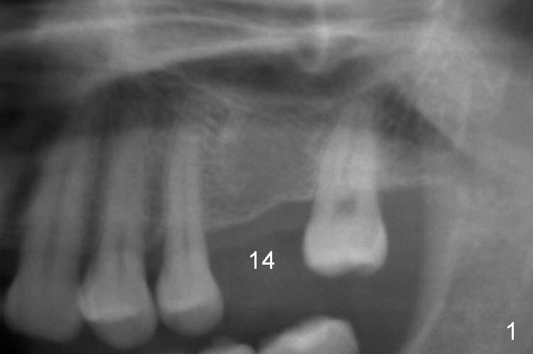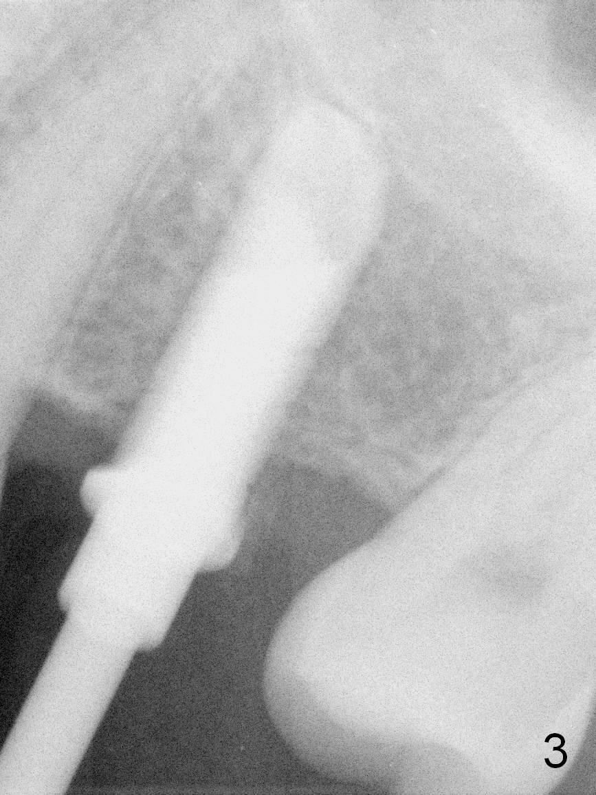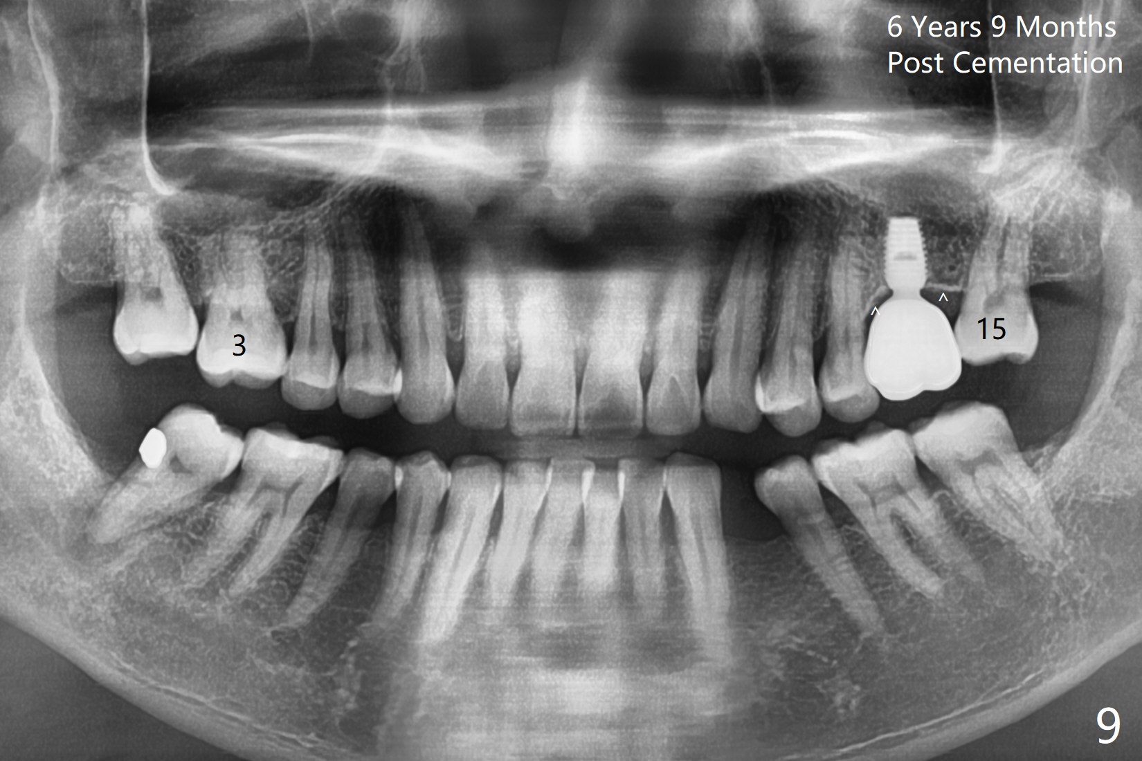 A 49-year-old man is an engineer. The tooth #14 is missing (Fig.1,2). He wonders how a one-rooted implant can replace a three-rooted tooth. Anyway, osteotomy is initiated at the site with 2.5 mm reamer in place (Fig.3). A 5x8 mm Bicon implant is placed (Fig.4). Seven and a half months later, the bone density next to the implant plateau appears to increase (Fig.5 arrowheads, as compared to Fig.4). The beauty of Bicon implant is that the crown (Fig.6 C) can be extraorally cemented to the abutment (A) prior to re-seating. Two years and 3 months post cementation, while no residual cement is visible, the bone density at the crest has increased (Fig.7 arrowheads). The crown is de-cemented 4 years 4 months post cementation; it appears that the abutment is small and short (5x2 mm 10 degree stealth). The bone density of the cortex around the implant (Fig.9 ^) is higher than that at #15 and #3.