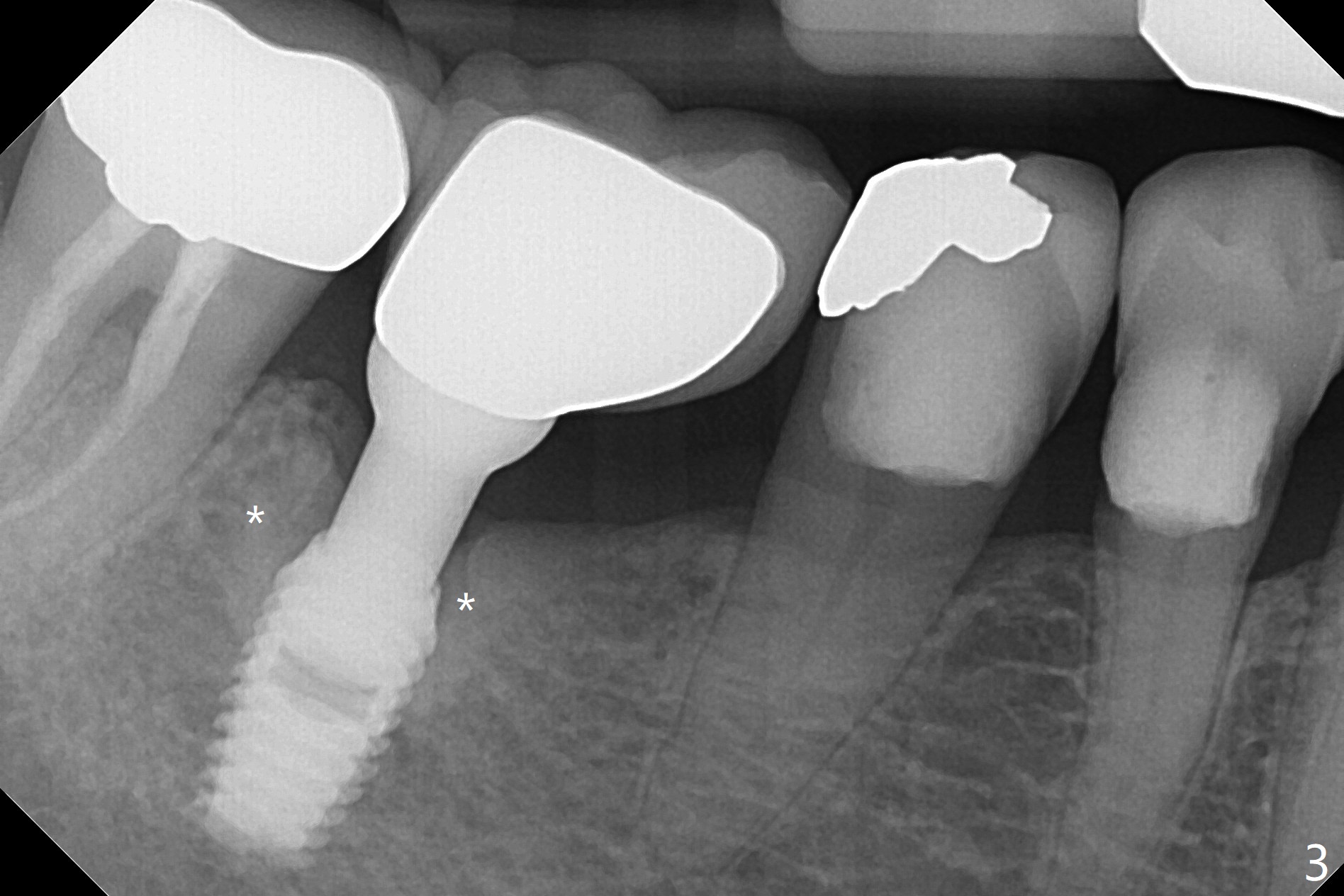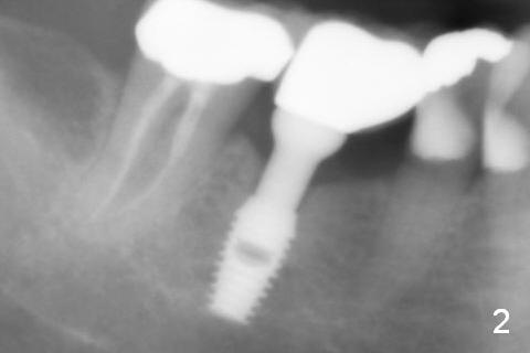 A 74-year-old woman with history of osteoporosis treatment had panoramic X-ray taken 7.5 years post cementation (Fig.2), eight years post Bicon implant placement (Fig.1). Bone density increases around the implant 9 years 7 months post cementation (Fig.3).