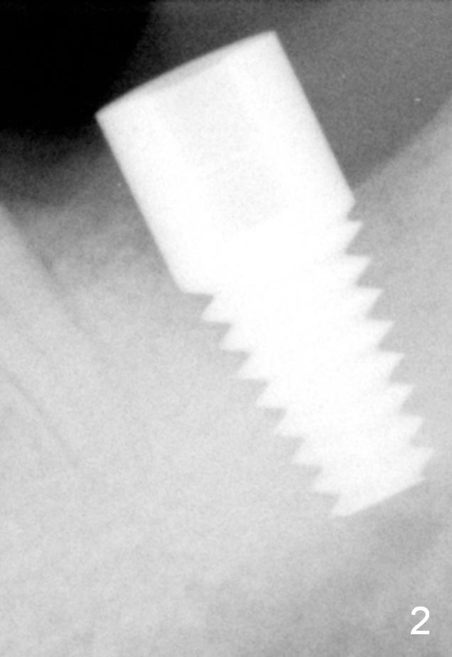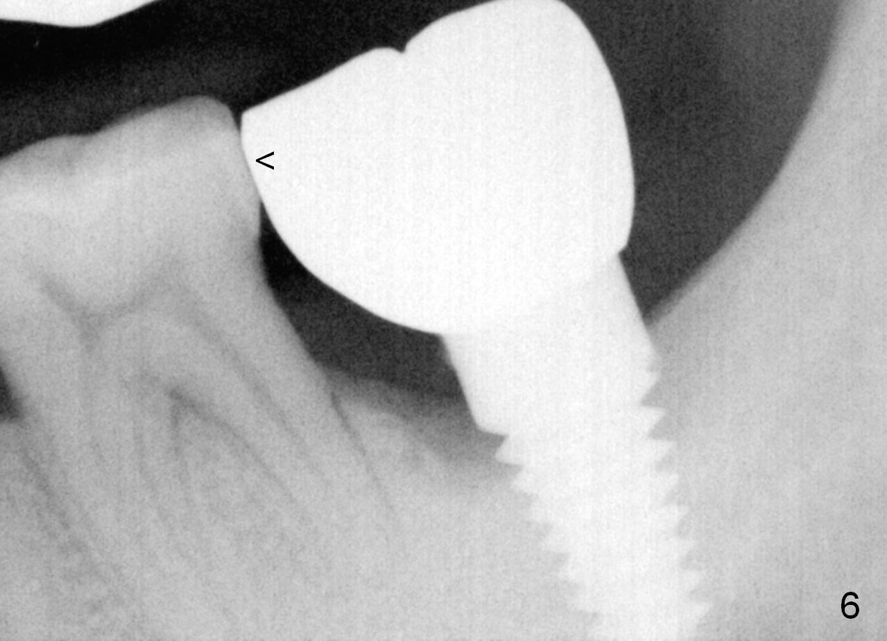 When a new crown is fabricated and cemented, the contact seems to be normal (Fig.6 (trimmed from a bitewing) <). The bone loss does not look as severe as before (Fig.5). Clinically, the gingiva is firmly attached to the implant without sign of inflammation. The case will be closely followed up.