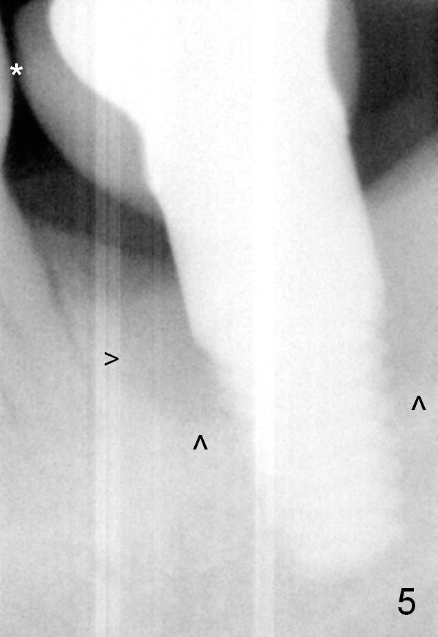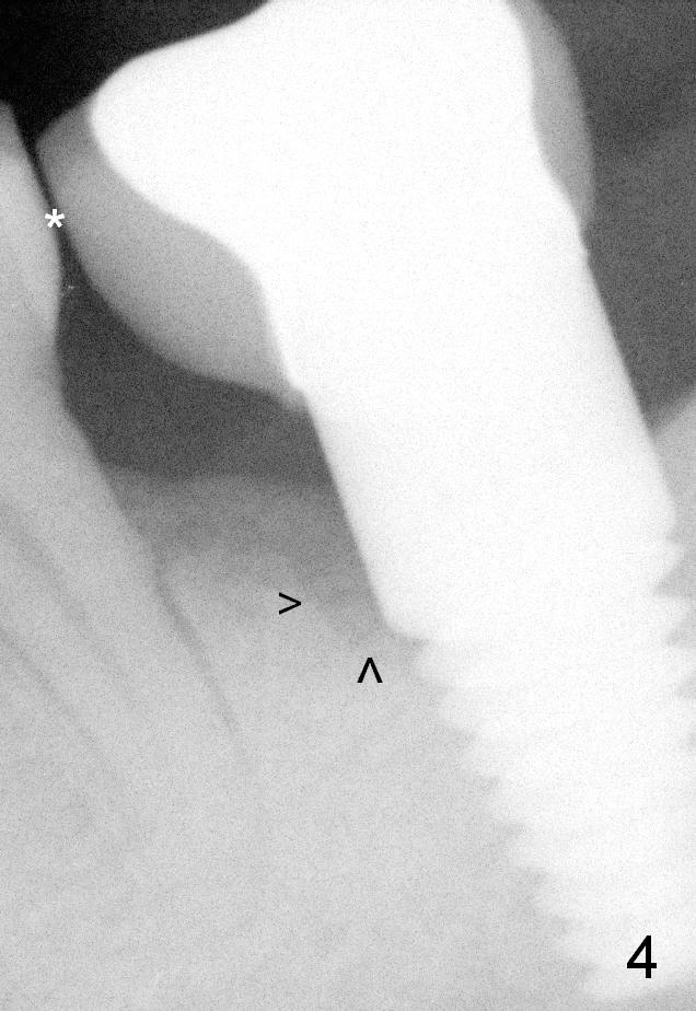 In spite of history of chronic periodontitis, the patient does not return for regular maintenance. There appears mild bone loss around the implant 2 years 3 months post cementation (Fig.4 ^). The bone loss appears to increase, accompanied by loose contact with the neighboring tooth 3 years 10 months post cementation (Fig.5 *, compare to Fig.4).