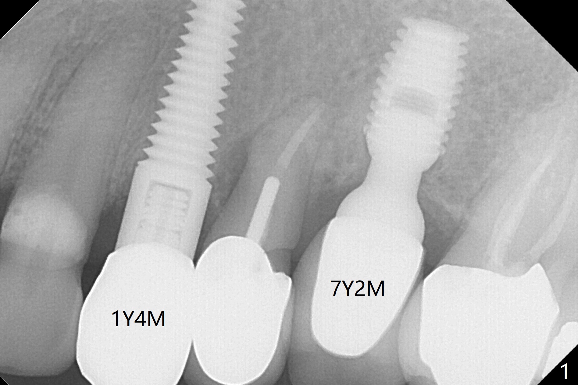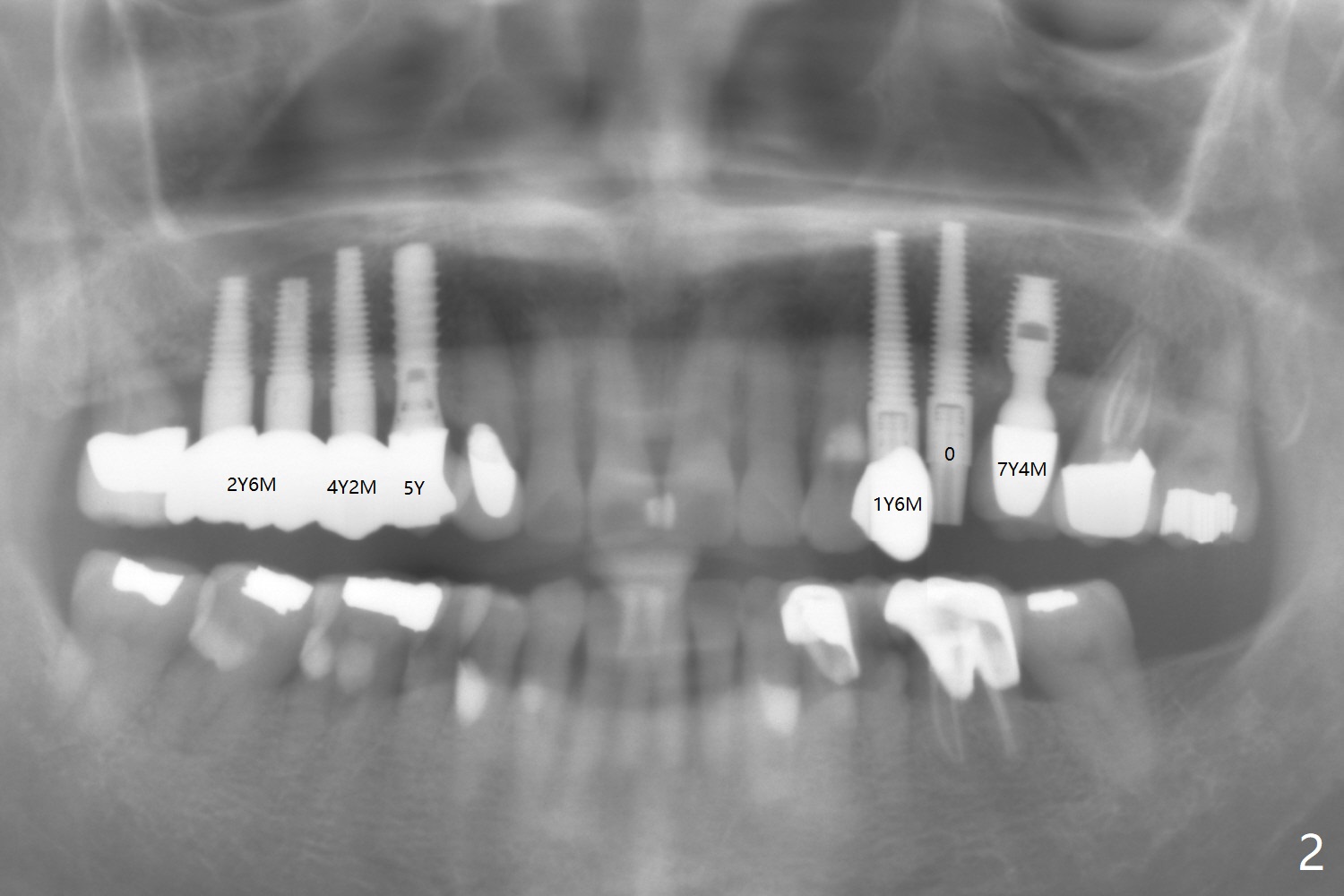 A 60-year-old woman appears to be a bruxer with pristine oral hygiene. There is minimal bone resorption post cementation (y: year; m: month, Fig.1,2).