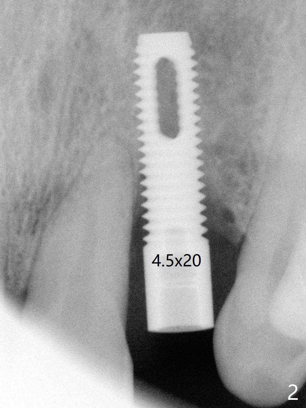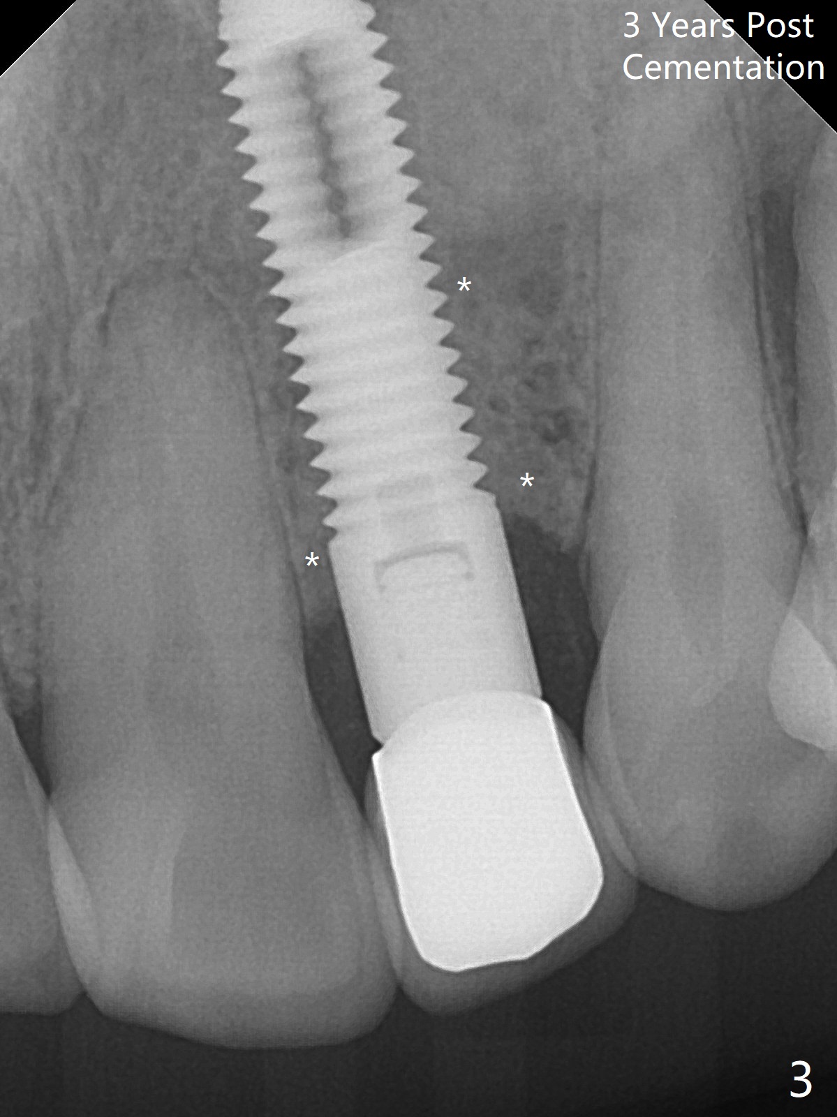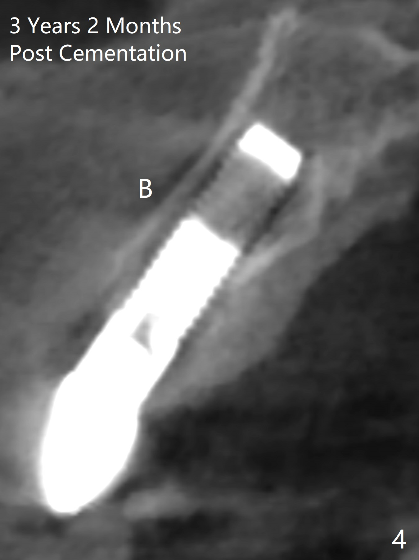 A 61-year-old man has chronic periodontitis and bruxism (Fig.1). Immediately after extraction and Clindamycin socket treatment, osteotomy is initiated with a 2 mm pilot drill at 20 mm in the lower 1/3 of palatal wall with normal saline irrigation, followed by 2.5-4 mm reamers at 20 mm (bone saved, Type III bone). A screw Implant (4.5x20 mm) is placed (45-50 Ncm, Fig.2). The root measurements were B-L 6.5 mm and M-D 5 mm. Autogenous bone is mixed SynthoGraft (size 50-500) ~ .3 g and blood. A 3.5x5 mm abutment is immediately cemented with an immediate provisional. There is positive bone growth 3 years post cementation (Fig.3 *). There is no buccal plate bone resorption 3 years 2 months post cementation (Fig.4 CT).