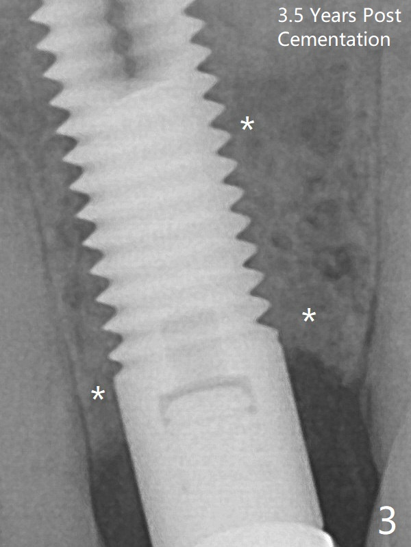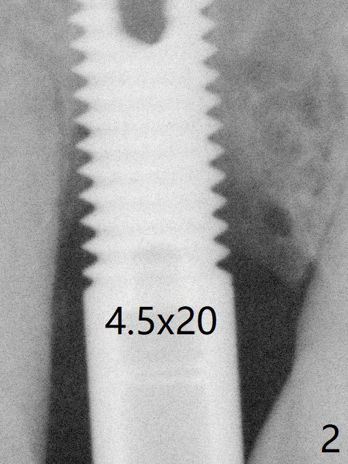 A screw Implant (4.5x20 mm) is placed (45-50 Ncm, Fig.2). The root measurements were B-L 6.5 mm and M-D 5 mm. Autogenous bone is mixed SynthoGraft (size 50-500) ~ .3 g and blood. A 3.5x5 mm abutment is immediately cemented with an immediate provisional. There is positive bone growth 3.5 years post cementation (Fig.3).