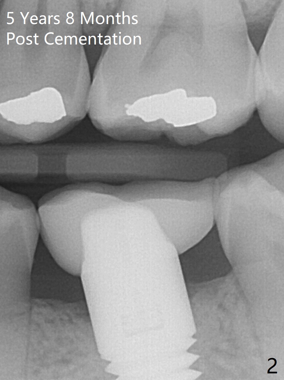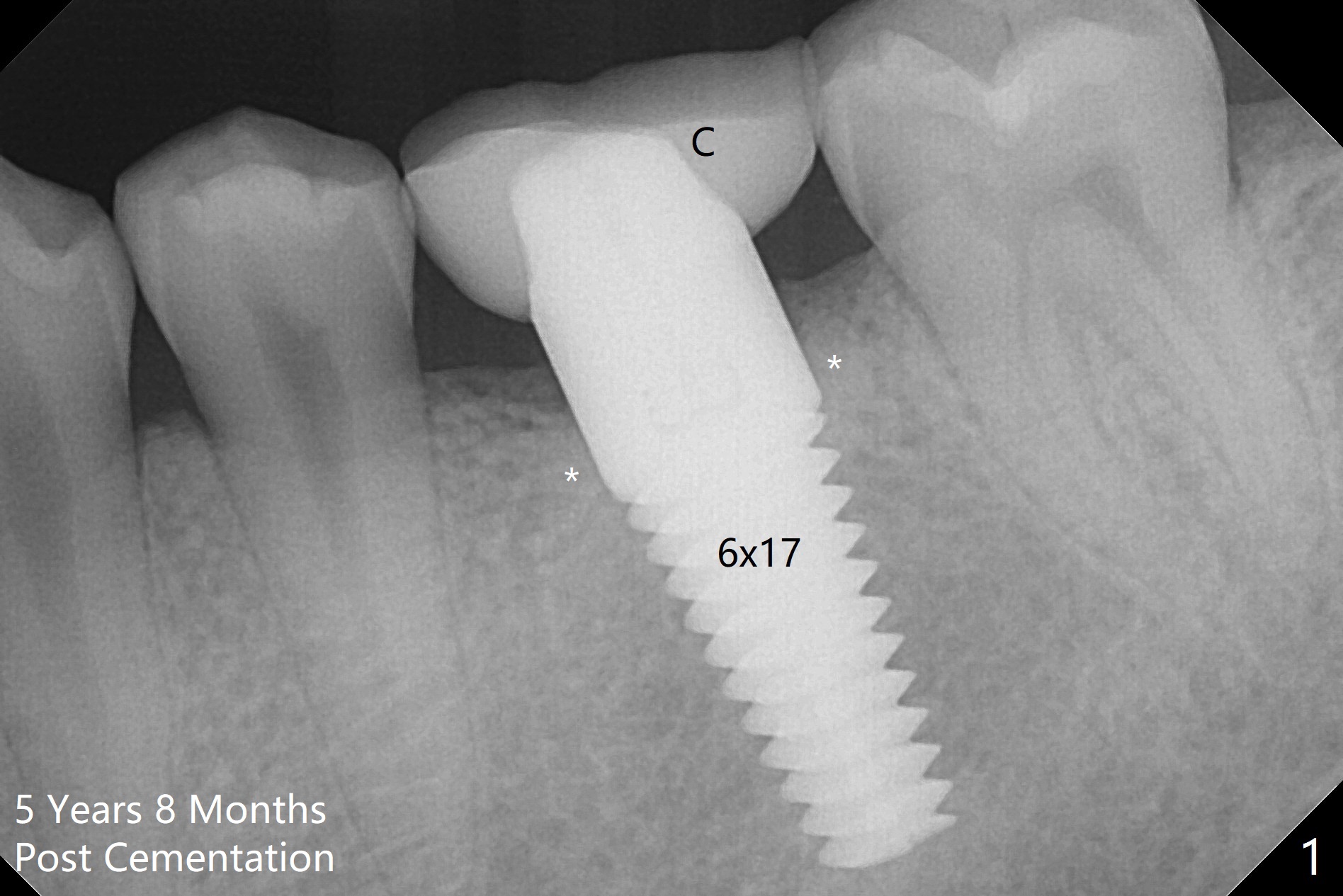 A 29-year-old man returns for follow up 5 years 8 months post cementation of the crown at #19 (Fig.1; 2 (bitewing)). The bone density around the coronal end of the 6x17 mm tissue-level implant (8 months post extraction without socket preservation) is high (*). Why is the implant crown (C) short?