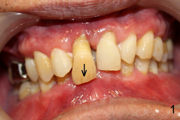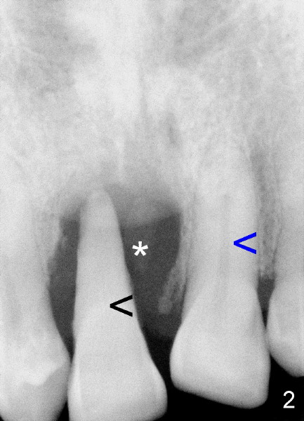 Sixty-one-year-old otherwise healthy man requests extraction of the upper right central incisor, which is mobile and supraerupted (Fig.1 arrow). He denies the history of trauma, although X-ray shows sclerosed canal of the affected tooth (Fig.2 black <, as compared to that of the left central (blue <).
