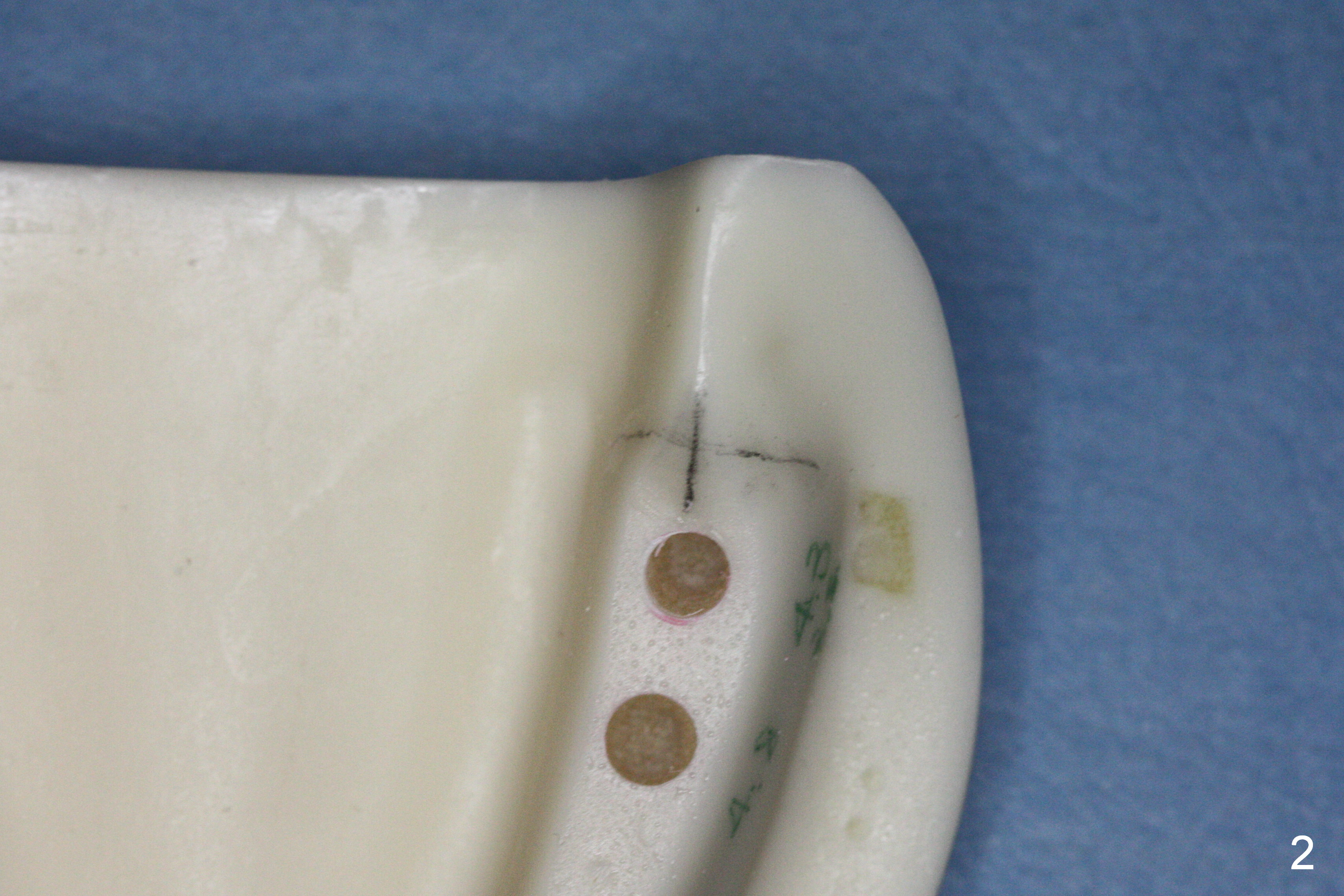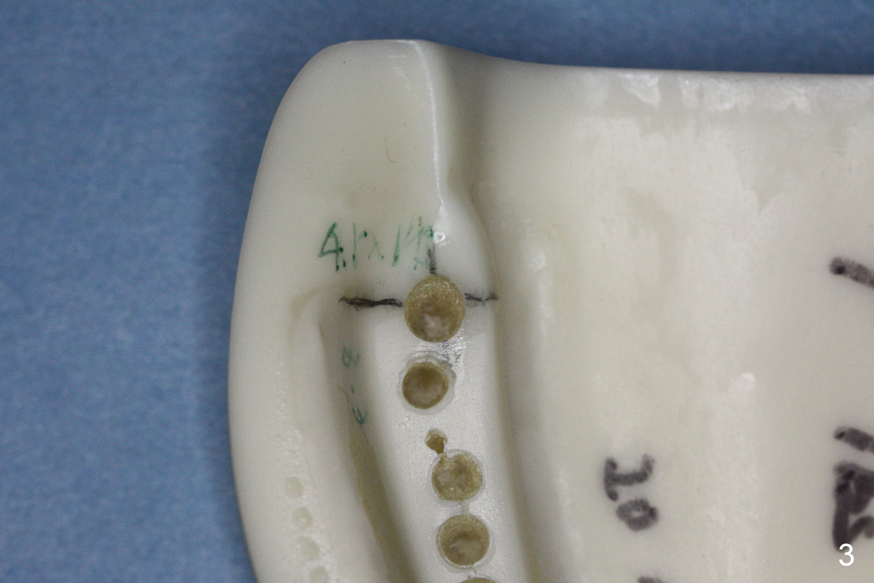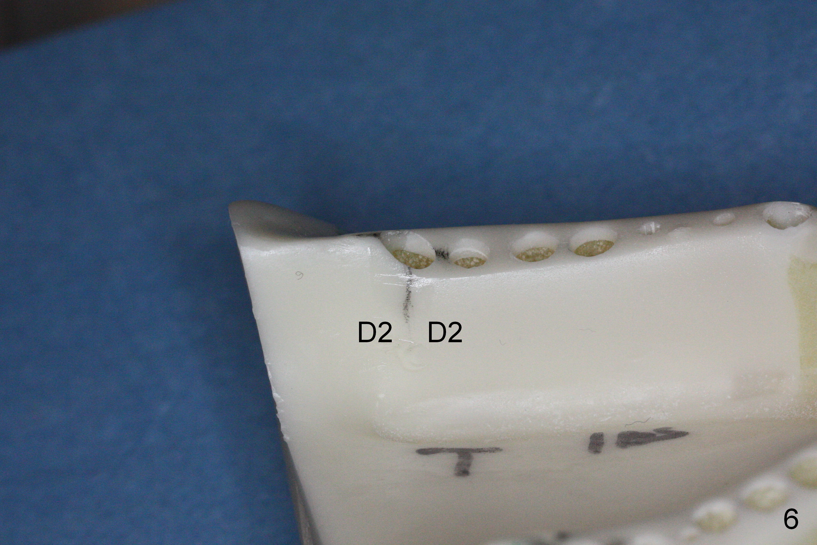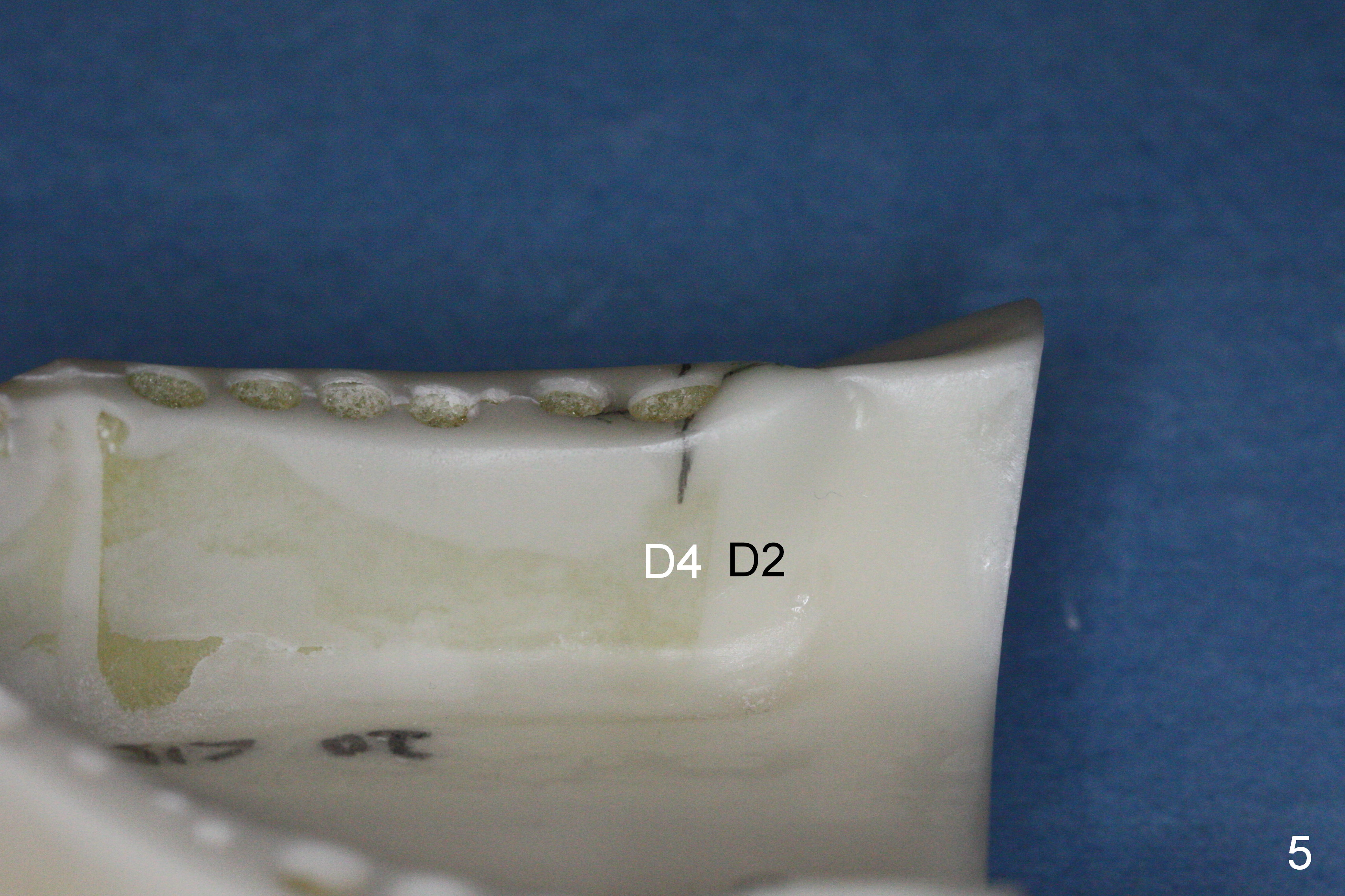 Turn the models so that we look at the lingual aspect. The right mandible seem to consist of two portions of bone at the retromolar region: D4 and D2 (Fig.5), whereas the left mandible appears to have one type of bone mesial and distal to the drawn line: D2. (Ted: ask Dr. Wang whether the assumption/observation is right or not)