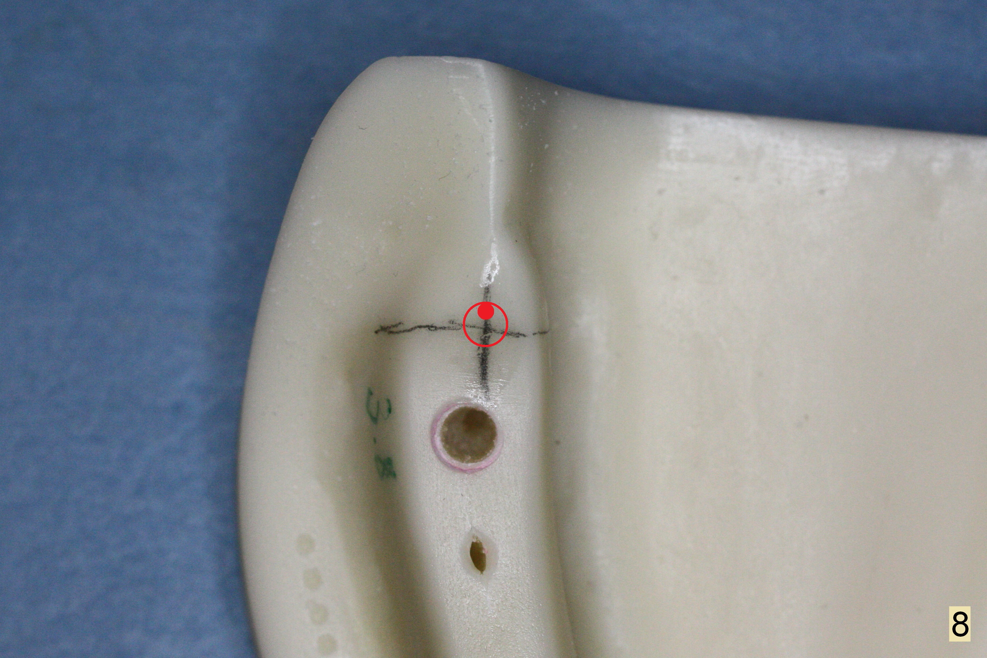 The buccal plate of the extraction socket is lower, thinner and more porous than the lingual one. Buccal drifting of osteotomy are associated with two drawbacks. The buccally-placed implant may cause bone resorption of the buccal plate. It is difficult to restore. To compensate for drifting clinically, initial osteotomy starts away from the less resistance area (lingually (clinically); distally (in model, Fig.7)). By the time of final osteotomy is finished using MD system, the center of the osteotomy is most likely in the center of occlusal table (Fig.8).