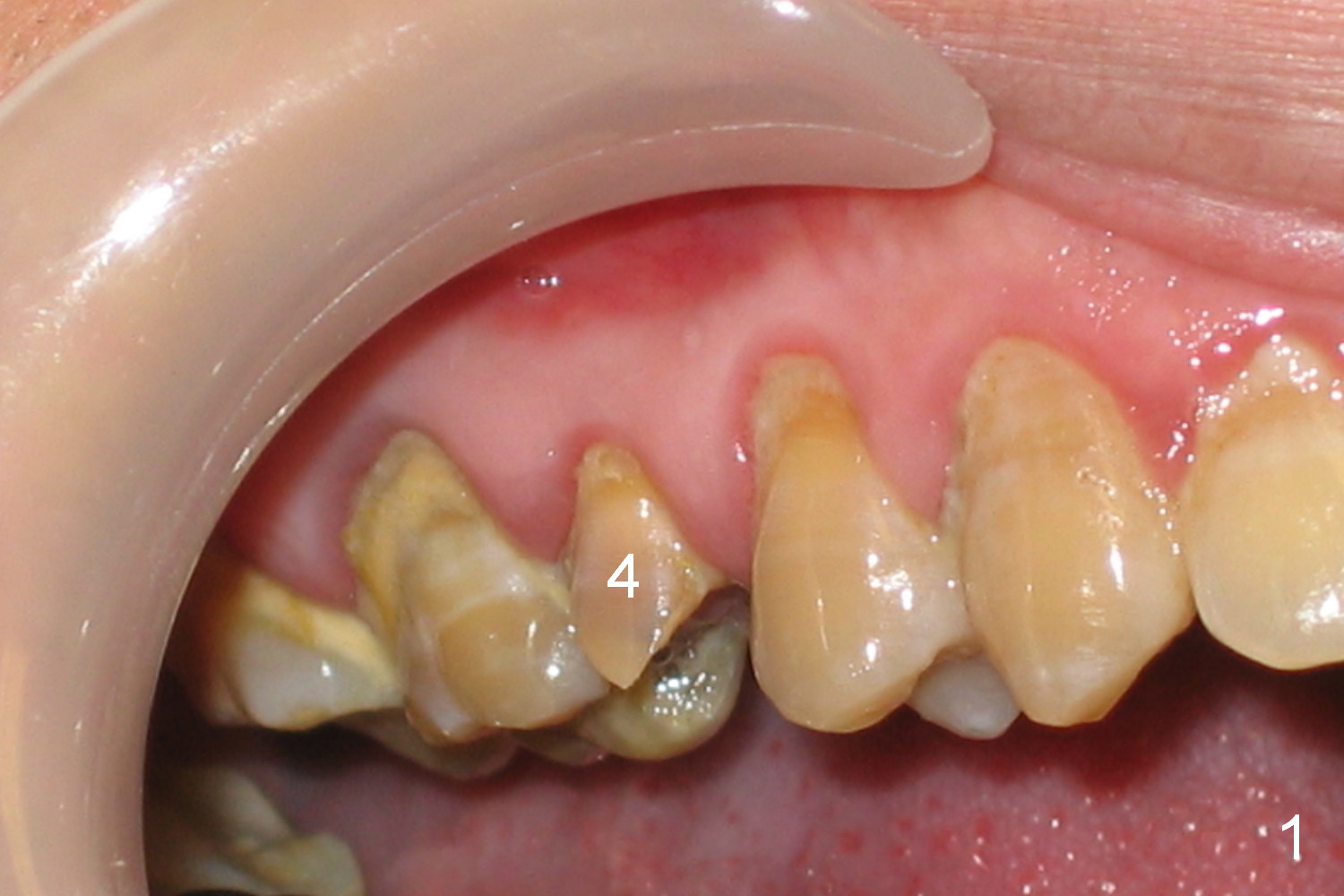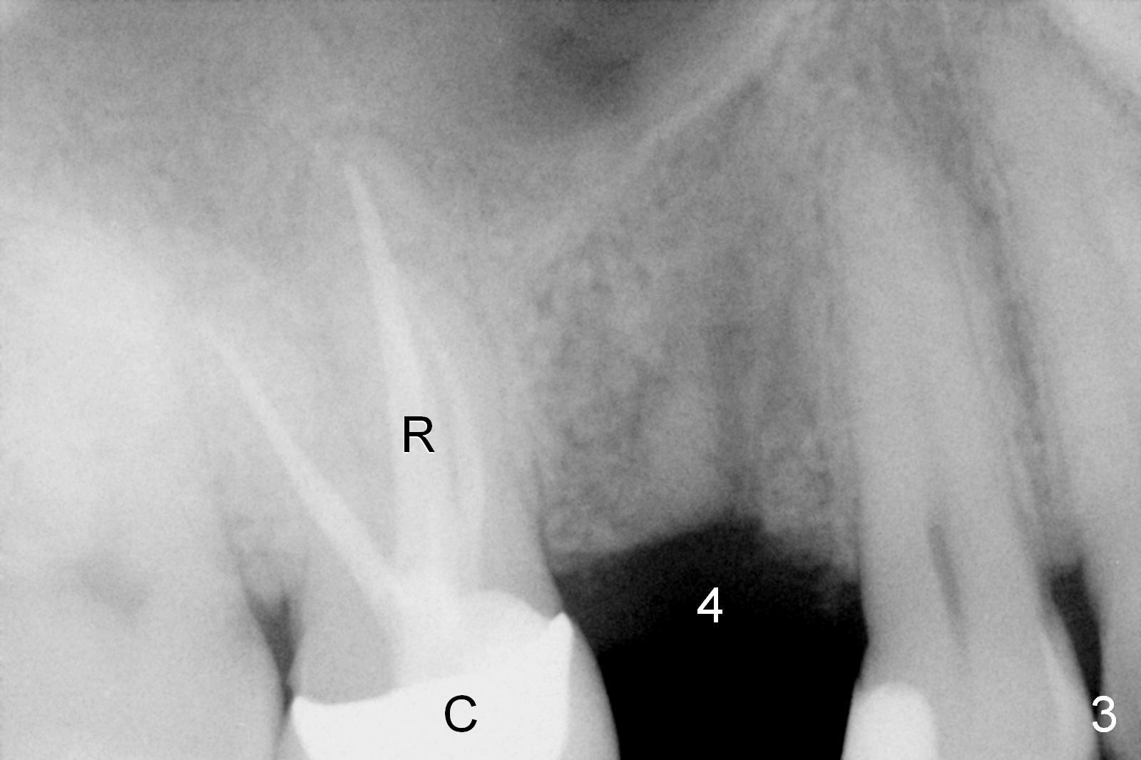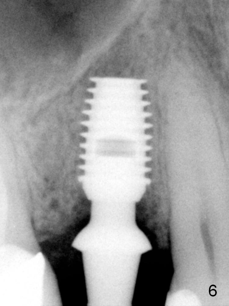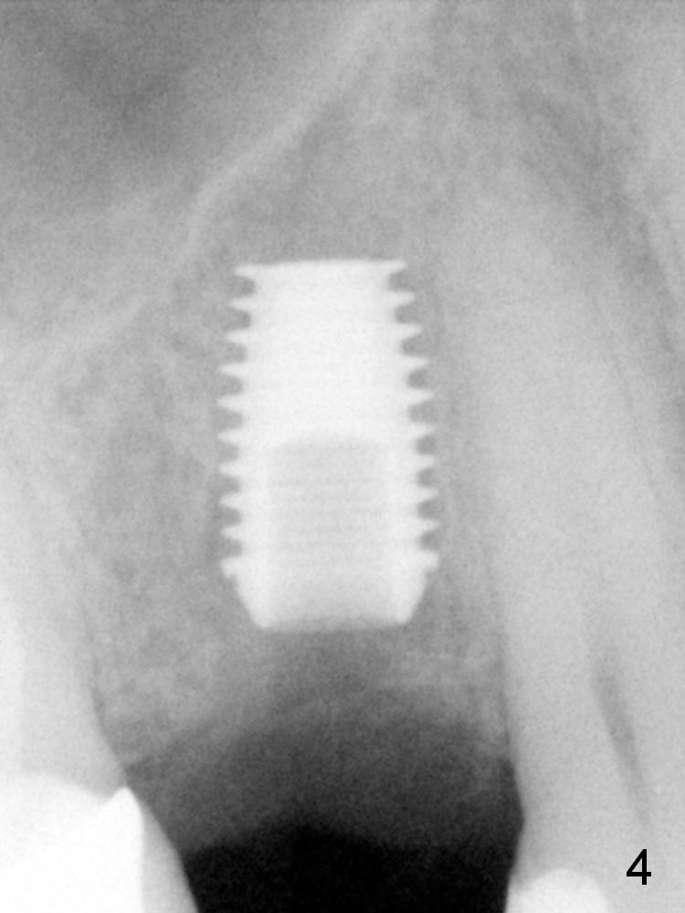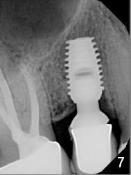 ZC is a 36-year-old man without significant medical history. His chief complaint is "I have Pain sometimes". His oral hygiene is poor (Fig.1). The tooth #3 has large MO caries with periapical radiolucency (*). The tooth #4 is non-salvageable (Fig.1,2). Four months after scaling & root planing, RCT and crown for #3 and extraction of #4 (Fig.3), a 5x8 mm Bicon implant is placed at the site of #4 (Fig.4). Peri-implant space is obliterated 5 months postop (Fig.5). The 2nd surgery is performed to uncover the implant and to place a temporary abutment. Two weeks later, a 5.0x.3.0 mm 0 degree Stealth Abutment 3.0 mm Post is placed (Fig.6). The most recent recall PA shows no bone loss for 5 years 3 months post cementation (Fig.7).