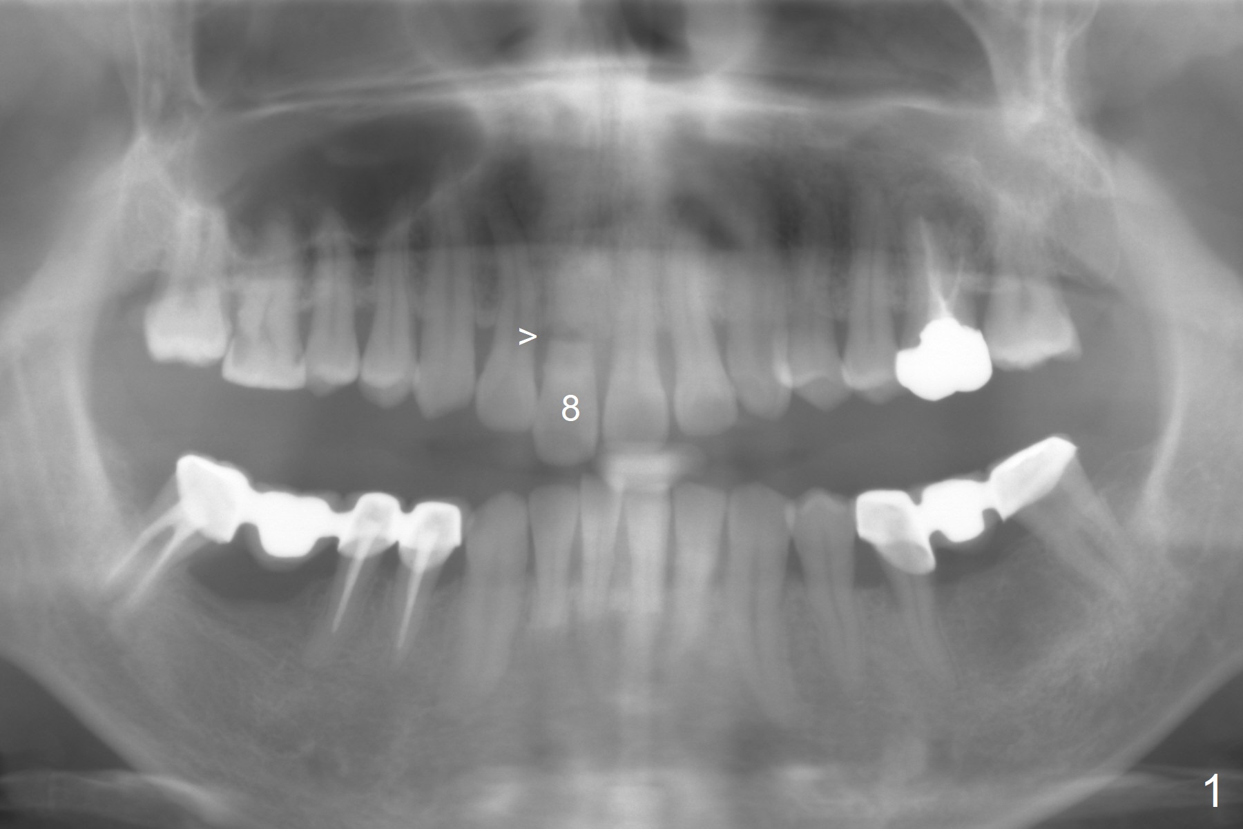 A 37-year-old man has fractured the root of the tooth #8 for a year (Fig.1). It appears that the longest bone-level implant is indicated (Fig.2). Take preop photos and PA if it is symptomatic with fistula.
