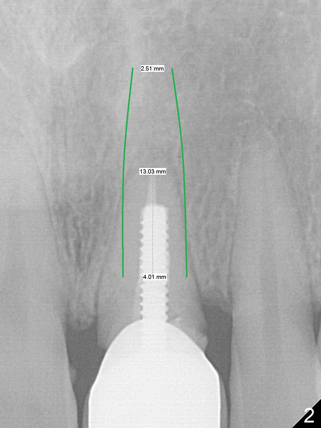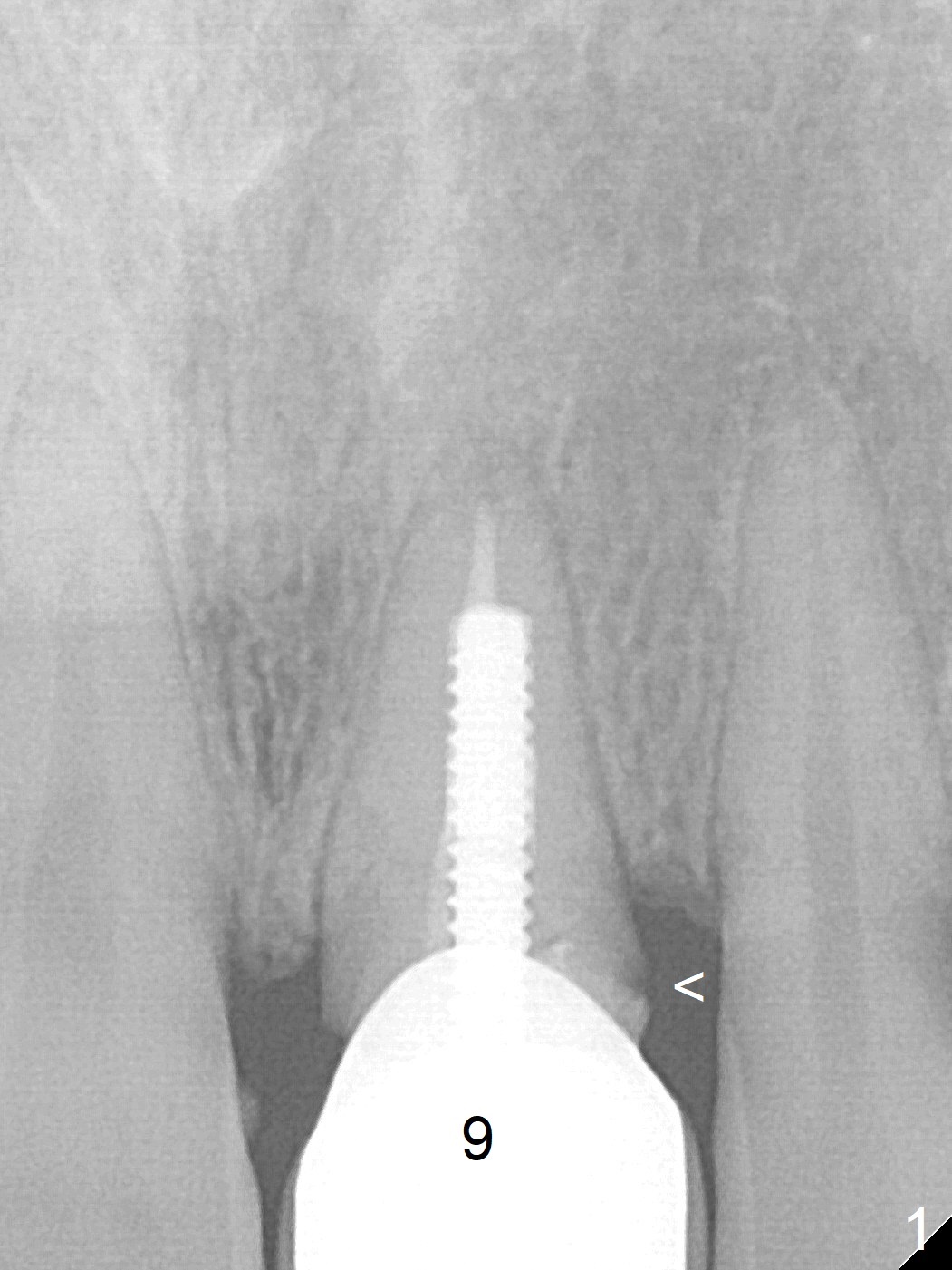 A 35-year-old woman's #9 fractures (Fig.1) because of blow by her child's head. Since a non-gold coated abutment will be used, an implant should be placed as palatal as possible (Fig.2). If the trajectory of the osteotomy turns out to be unacceptable, switch the other implant system with gold coated abutment. Perform socket shield, if extraction is difficult.