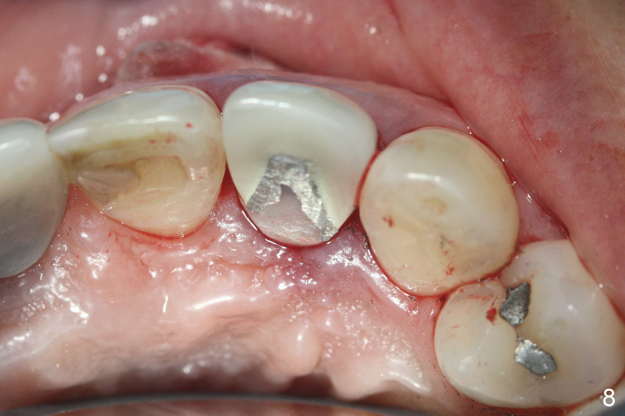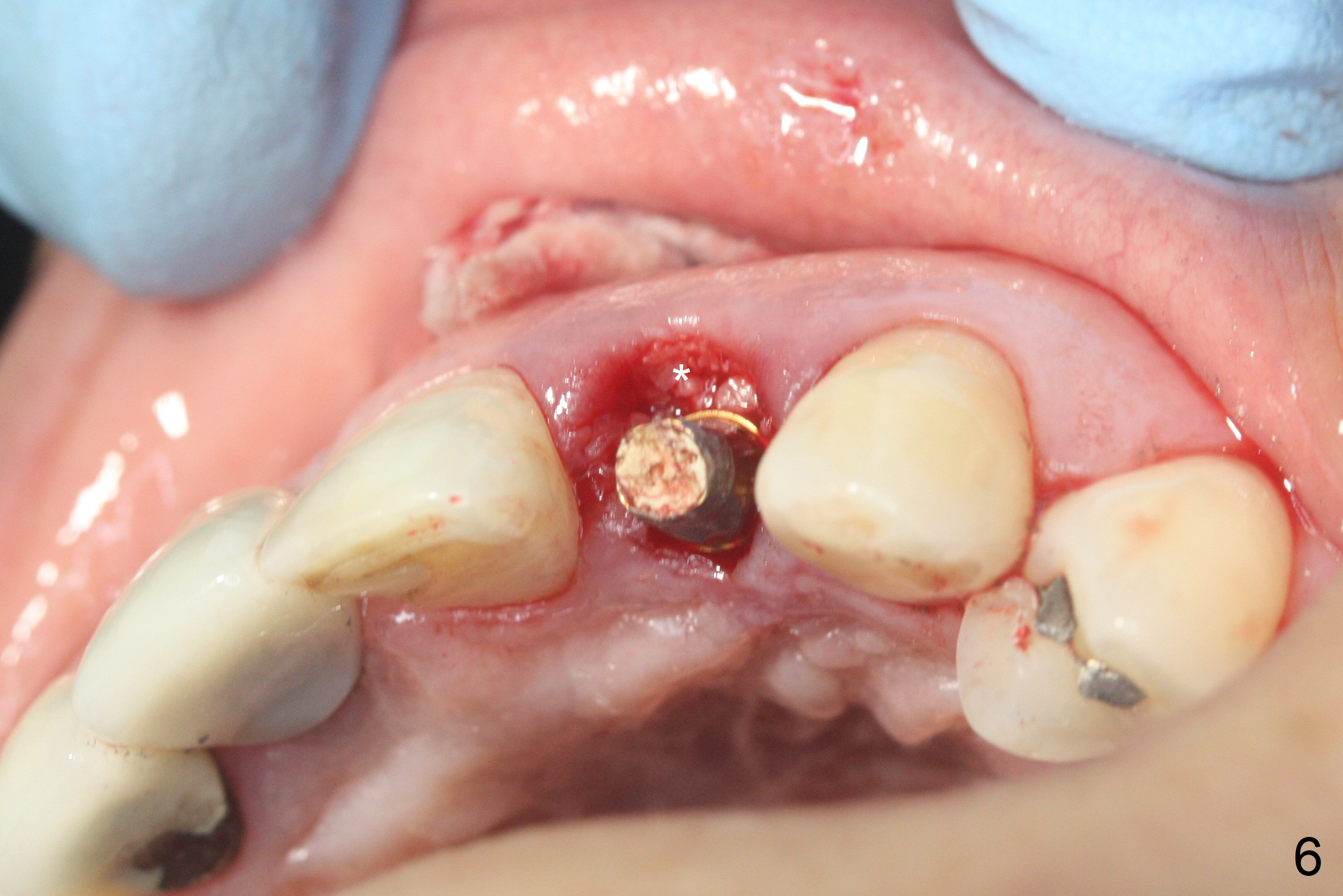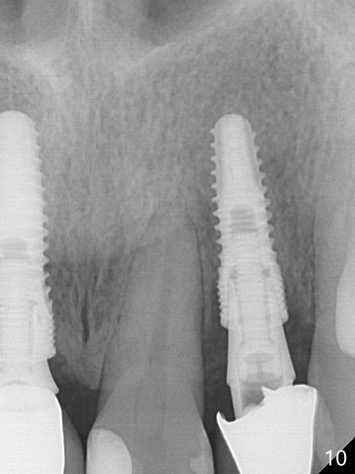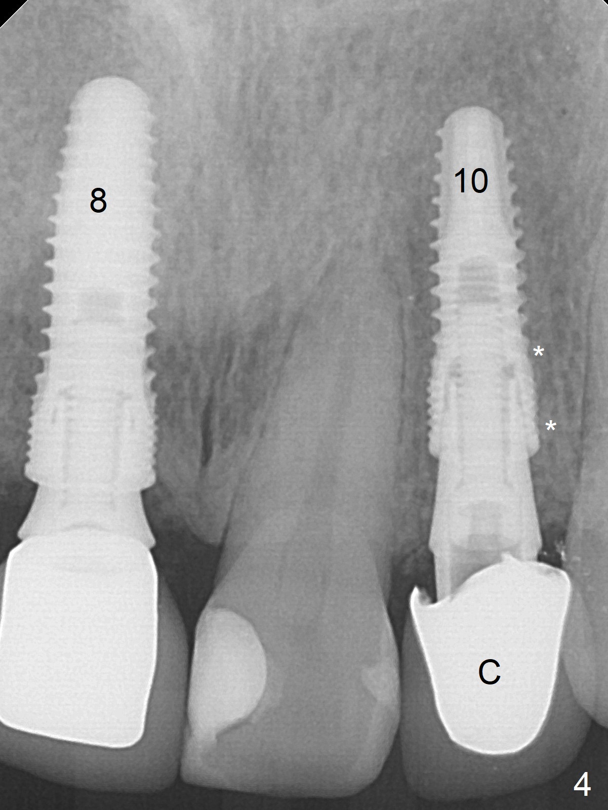 When the patient returns, the crown at #10 has displaced incisally (Fig.1,2 arrow). The initial depth is 15 mm (Fig.3, palatal gingival margin). After a 3.8x12 mm SM implant is placed (Fig.4), allograft is packed in the peri-implant space (*, as compared to Fig.3) and a 3.9x4(3) mm abutment is placed (A). More allograft is placed in the peri-abutment space (Fig.6 *). The existing crown (Fig.4,5 C) is hollowed, relined (R) and used as an immediate provisional (Fig.7-9). The patient is pleased with the appearance of the apically-repositioned provisional (Fig.7 arrow). She returns for impression 3.5 months postop (Fig.10). After change of abutment to 3.9x4(4.5) mm and new provisional, impression is retaken 5 months postop (Fig.11,12). It appears that the implant is palatally placed and a little large for the site (Fig.11 (B: buccal); Fig.12 (^: thin layer of the palatal plate)). If an angled abutment were used, a screw-retained crown might have been feasible. Due to the new provisional, the gingiva looks healthy when a permanent crown is cemented (Fig.13).