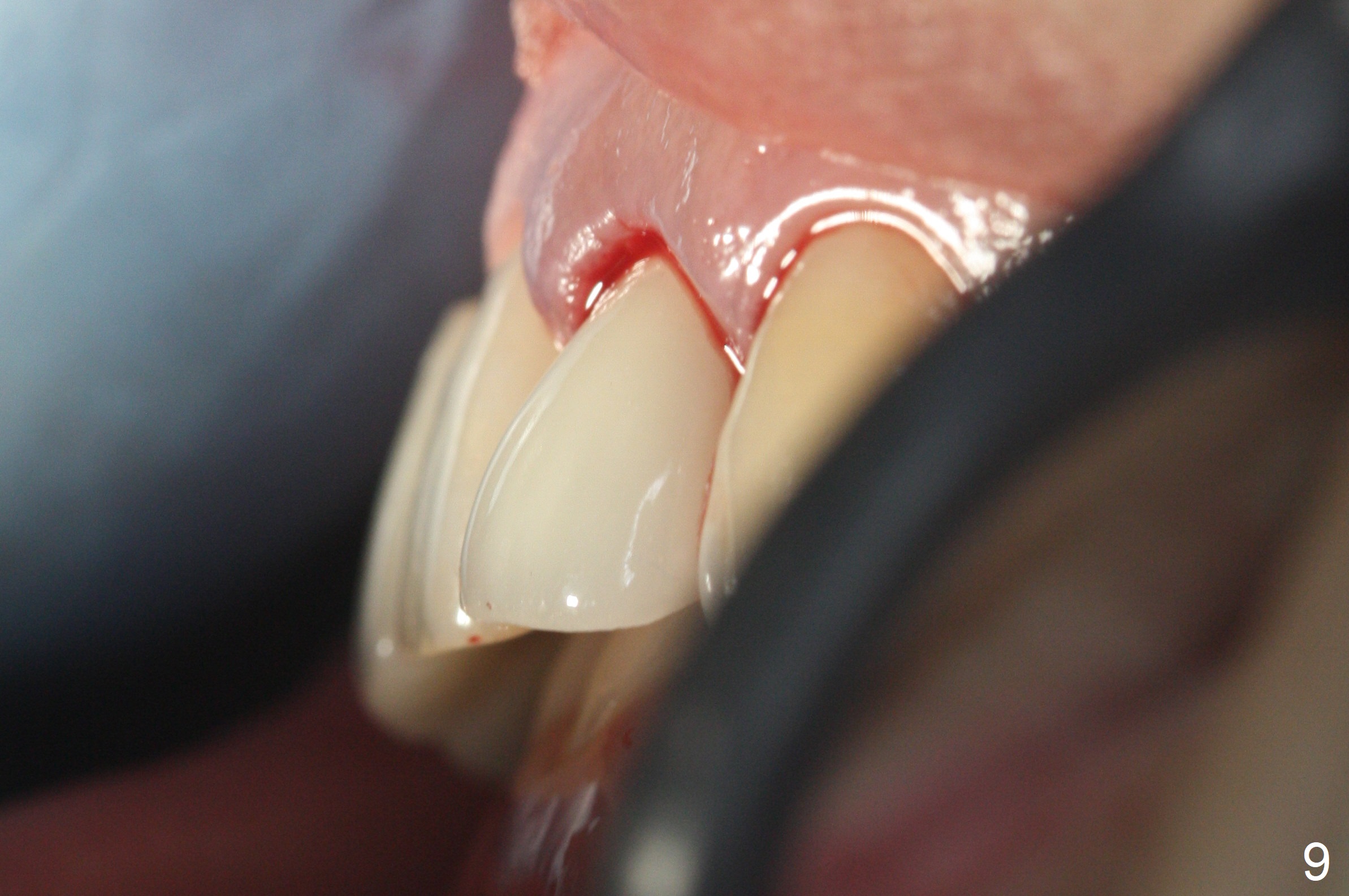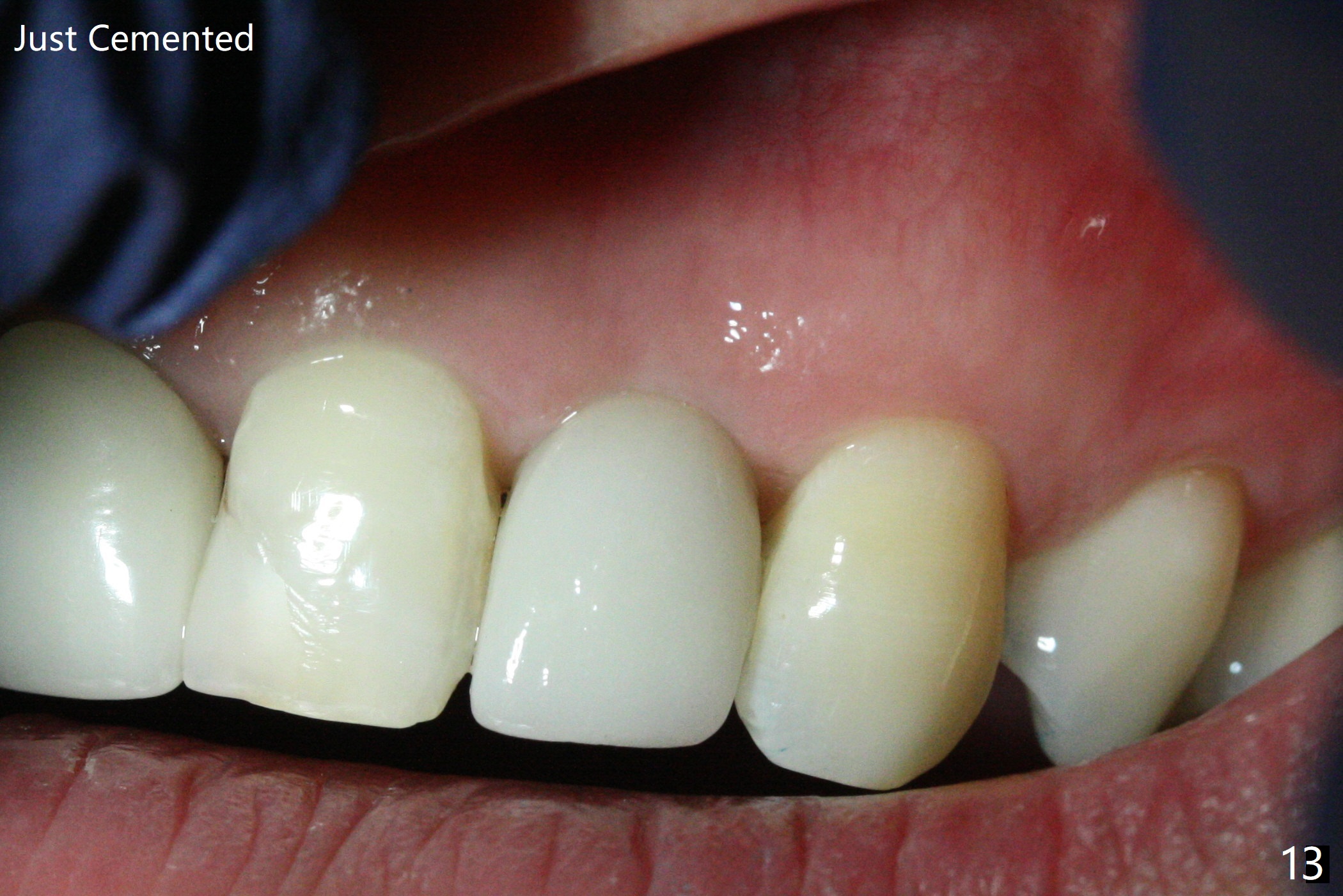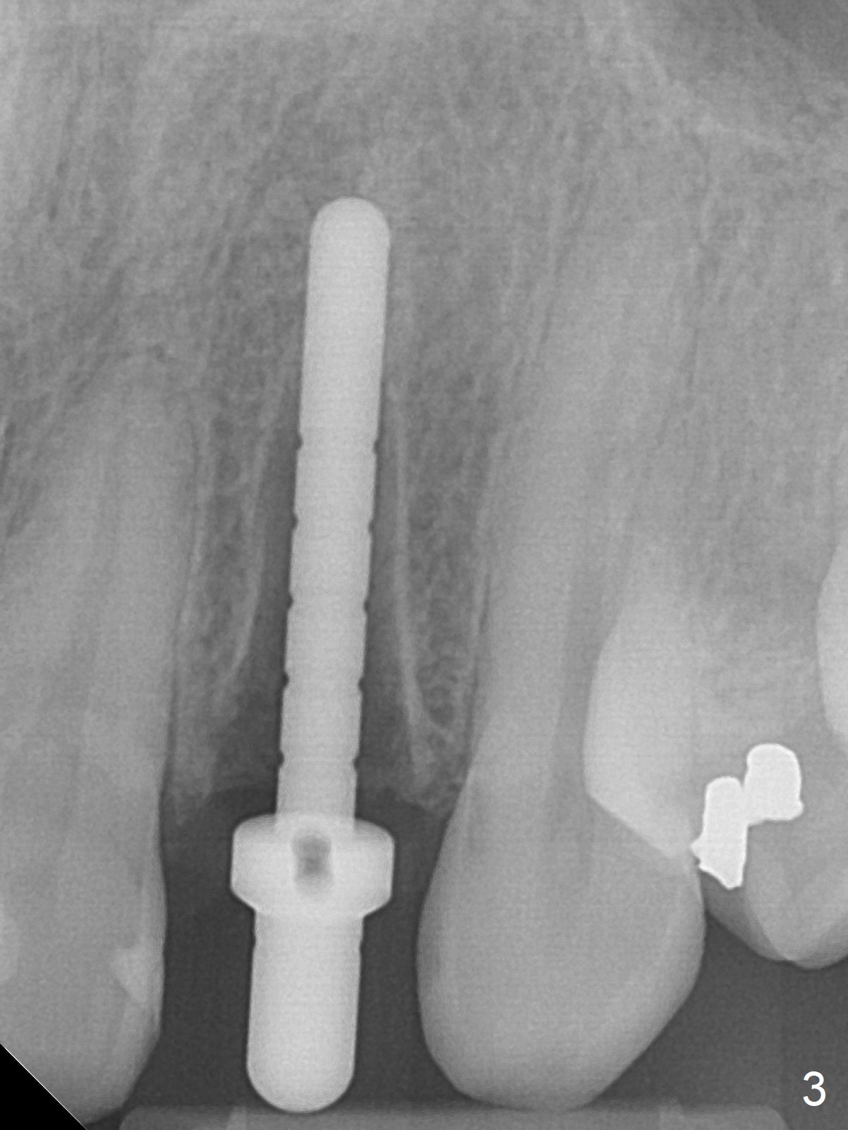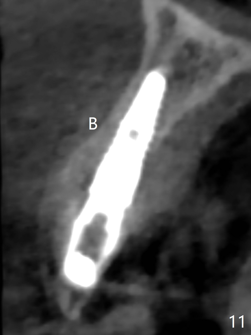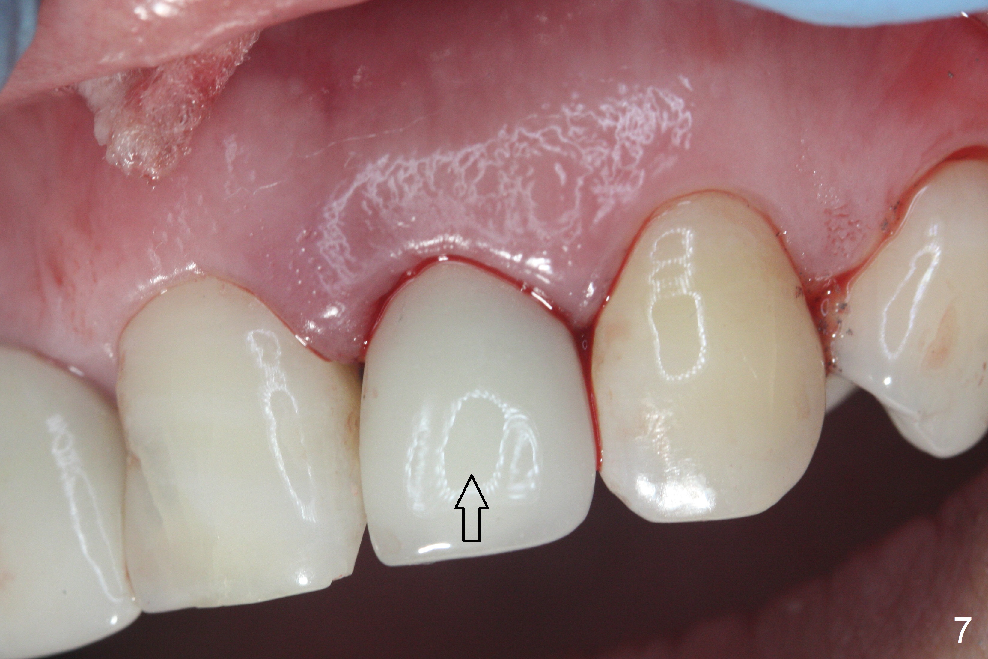 When the patient returns, the crown at #10 has displaced incisally (Fig.1,2 arrow). The initial depth is 15 mm (Fig.3, palatal gingival margin). After a 3.8x12 mm SM implant is placed (Fig.4), allograft is packed in the peri-implant space (*, as compared to Fig.3) and a 3.9x4(3) mm abutment is placed (A). More allograft is placed in the peri-abutment space (Fig.6 *). The existing crown (Fig.4,5 C) is hollowed, relined (R) and used as an immediate provisional (Fig.7-9). The patient is pleased with the appearance of the apically-repositioned provisional (Fig.7 arrow). She returns for impression 3.5 months postop (Fig.10). After change of abutment to 3.9x4(4.5) mm and new provisional, impression is retaken 5 months postop (Fig.11,12). It appears that the implant is palatally placed and a little large for the site (Fig.11 (B: buccal); Fig.12 (^: thin layer of the palatal plate)). If an angled abutment were used, a screw-retained crown might have been feasible. Due to the new provisional, the gingiva looks healthy when a permanent crown is cemented (Fig.13).