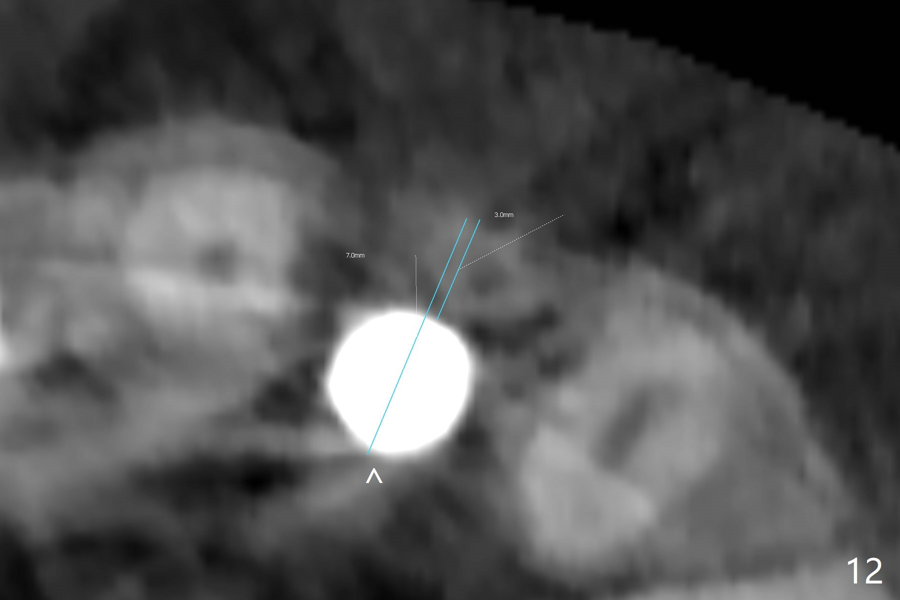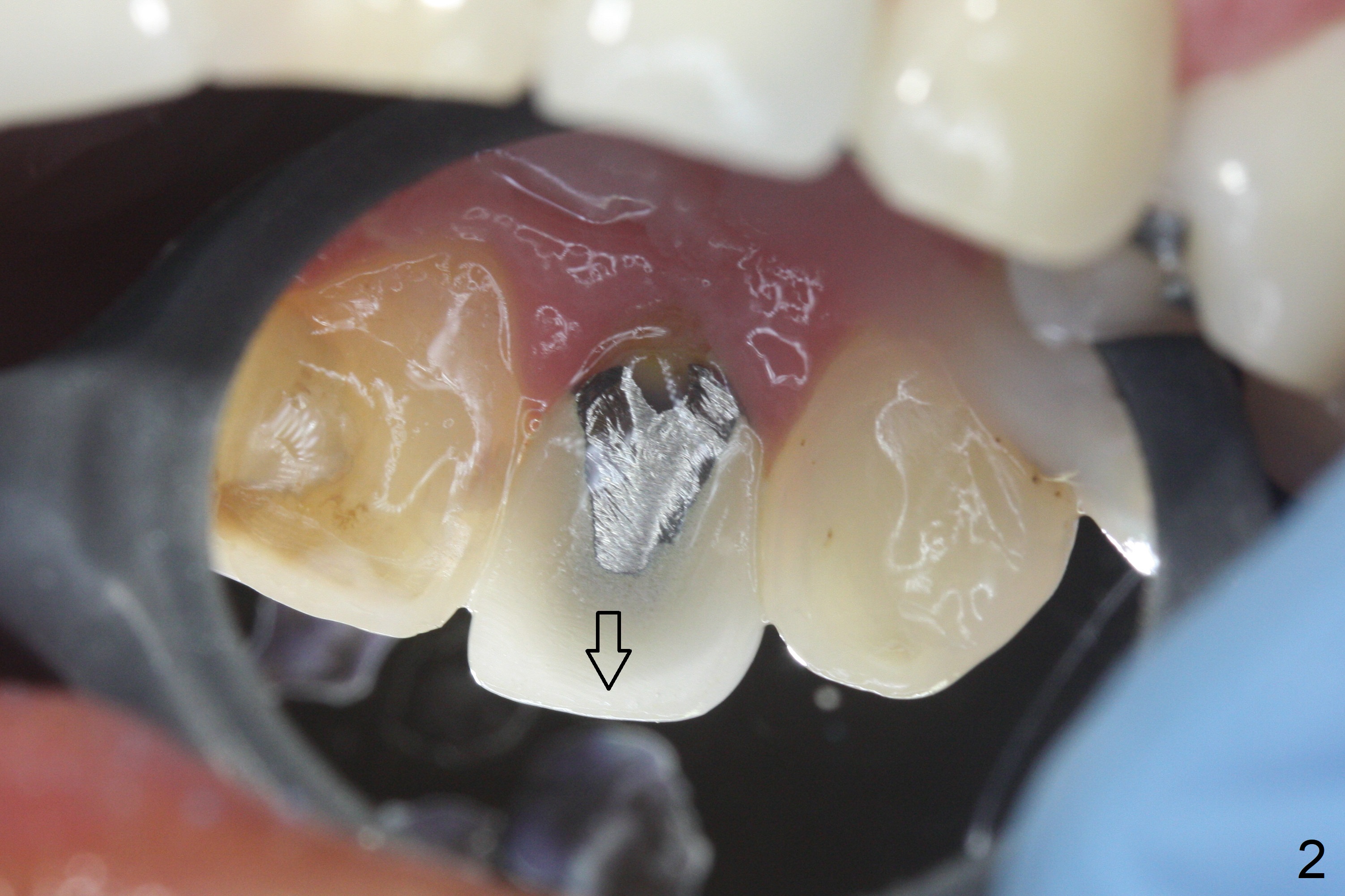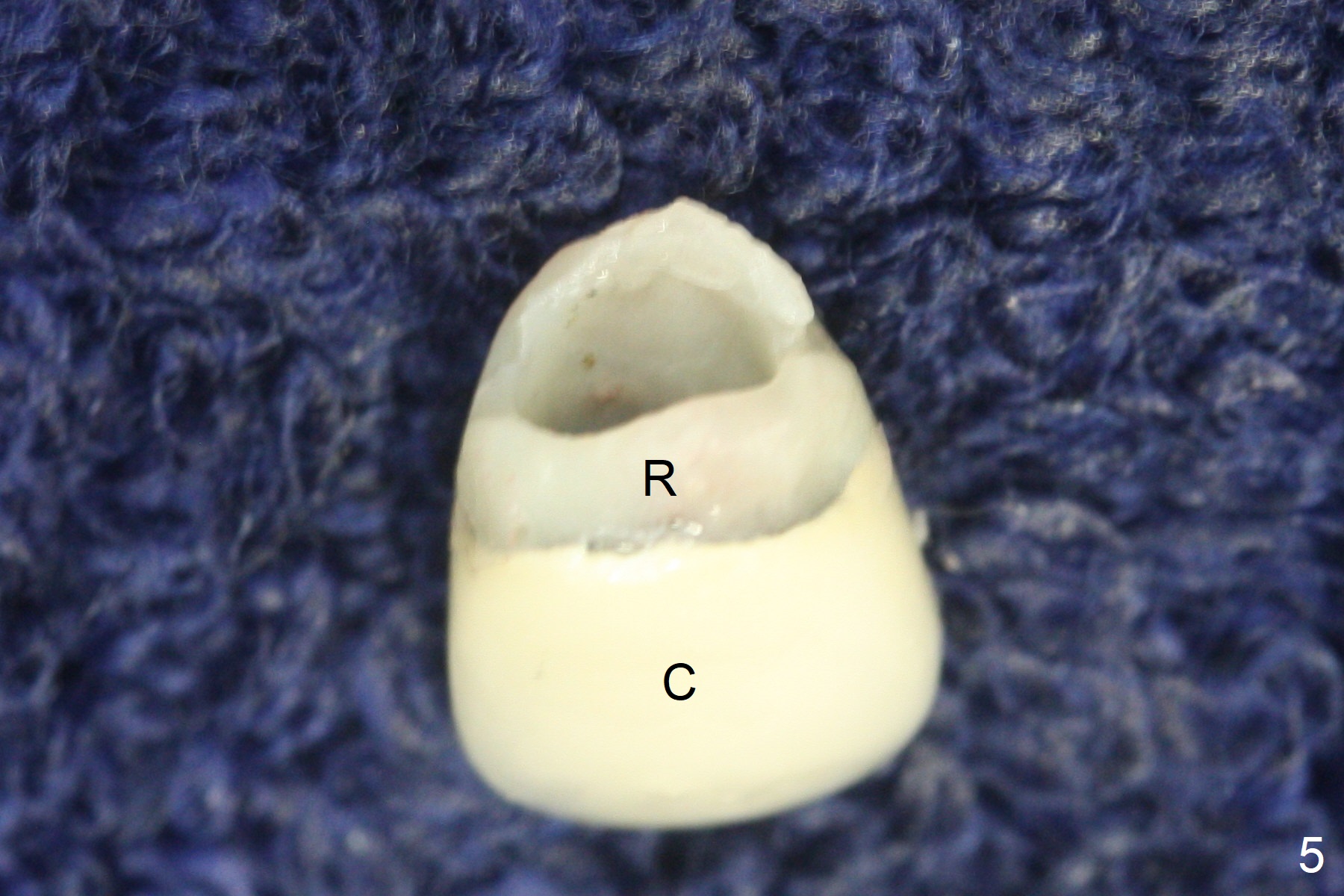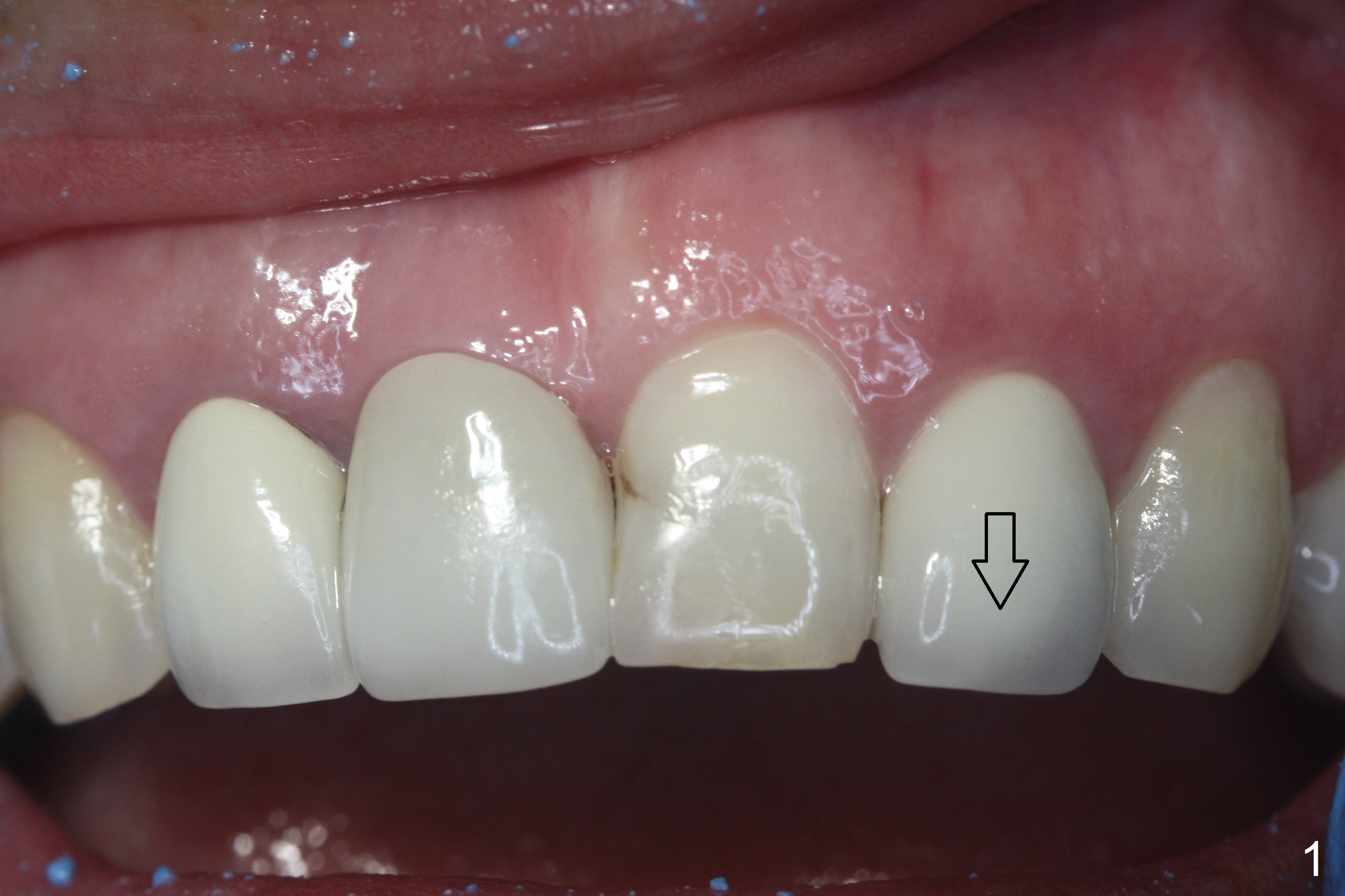 When the patient returns, the crown at #10 has displaced incisally (Fig.1,2 arrow). The initial depth is 15 mm (Fig.3, palatal gingival margin). After a 3.8x12 mm SM implant is placed (Fig.4), allograft is packed in the peri-implant space (*, as compared to Fig.3) and a 3.9x4(3) mm abutment is placed (A). More allograft is placed in the peri-abutment space (Fig.6 *). The existing crown (Fig.4,5 C) is hollowed, relined (R) and used as an immediate provisional (Fig.7-9). The patient is pleased with the appearance of the apically-repositioned provisional (Fig.7 arrow). She returns for impression 3.5 months postop (Fig.10). After change of abutment to 3.9x4(4.5) mm and new provisional, impression is retaken 5 months postop (Fig.11,12). It appears that the implant is palatally placed and a little large for the site (Fig.11 (B: buccal); Fig.12 (^: thin layer of the palatal plate)). If an angled abutment were used, a screw-retained crown might have been feasible. Due to the new provisional, the gingiva looks healthy when a permanent crown is cemented (Fig.13).