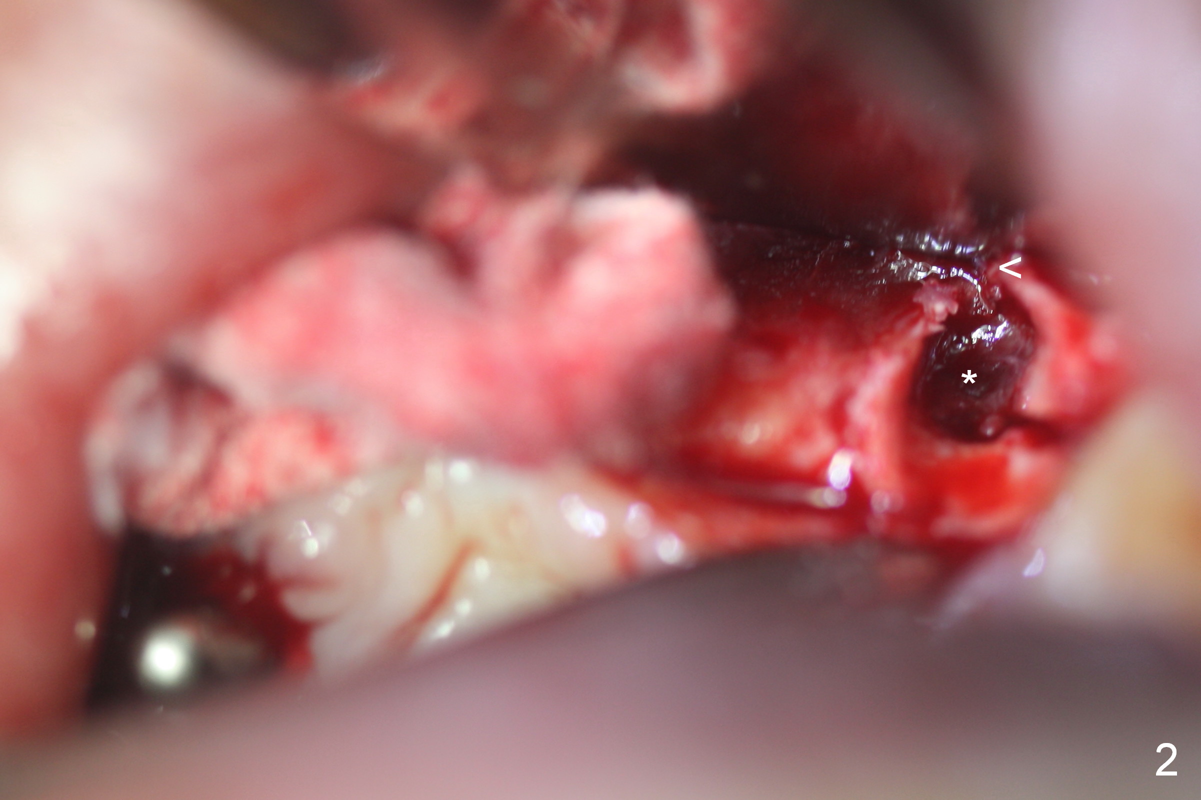 When the tooth #10 is extracted, the buccal plate has perforation (Fig.2 <) with granulation tissue in the socket (*). The socket is opened for better visibility and manipulation.