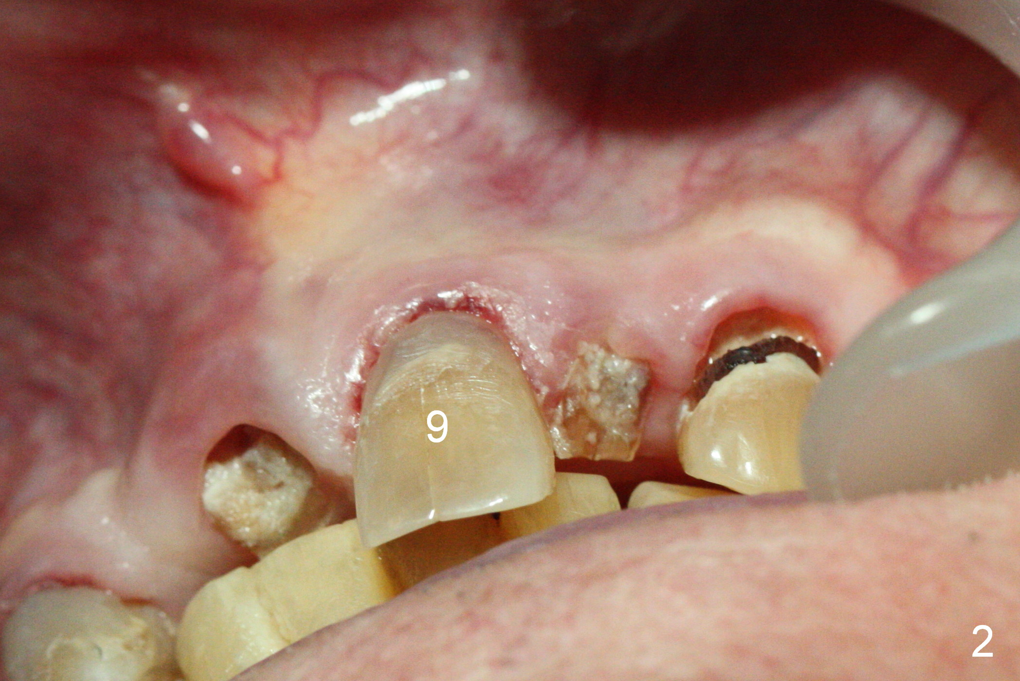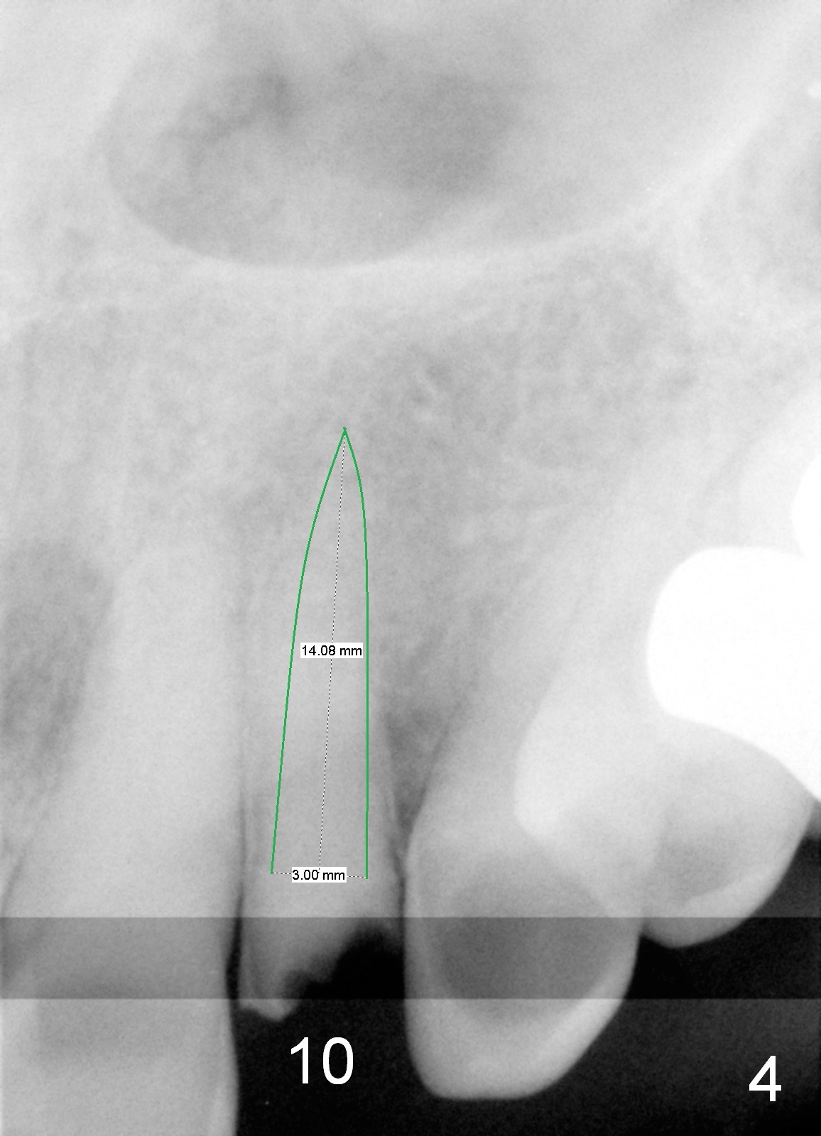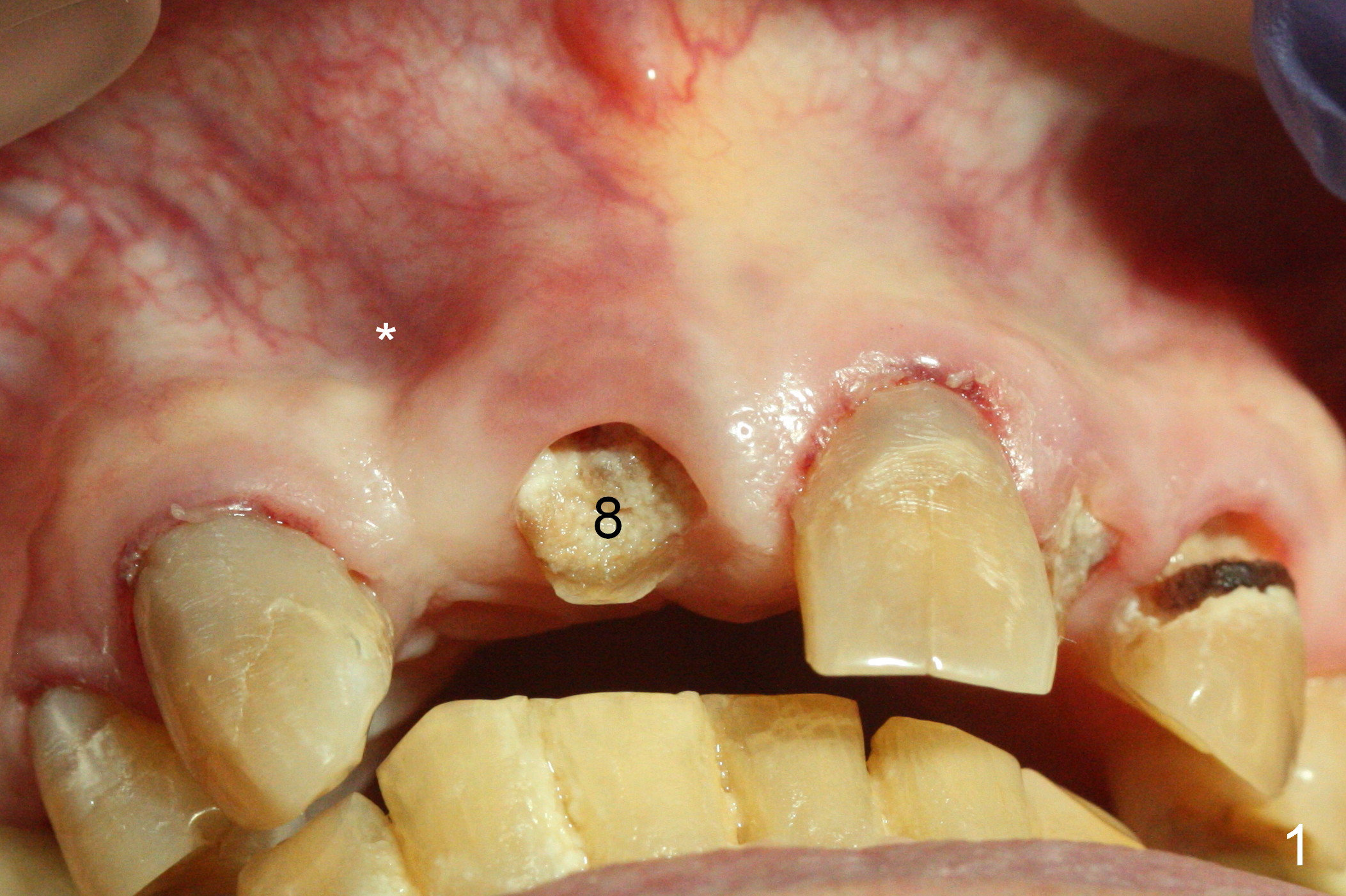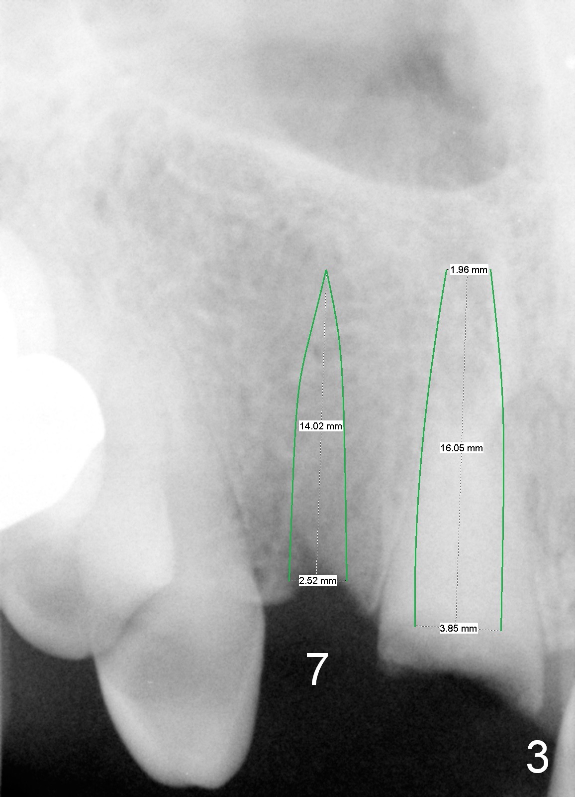 A 88-year-old man (CA) has severe xerostomia-induced caries. After caries control, implants will be placed at #7, 8 and 10 with narrow mesiodistal width (Fig.1,2). Note concavity at the apical buccal plate (*). To prevent perforation, an angled 1-piece implant will be used at #7. Try to place the implant in the middle of the alveolus (digital palpation while drilling) and let the angled abutment take care of the trajectory. To preserve papillae, flapless approach is going to be adopted. Initial depth at these sites will be 12,14 and 14 mm, respectively (Fig.3,4). Use Boley gauge to measure widths of the root to determine the diameter of the implant.